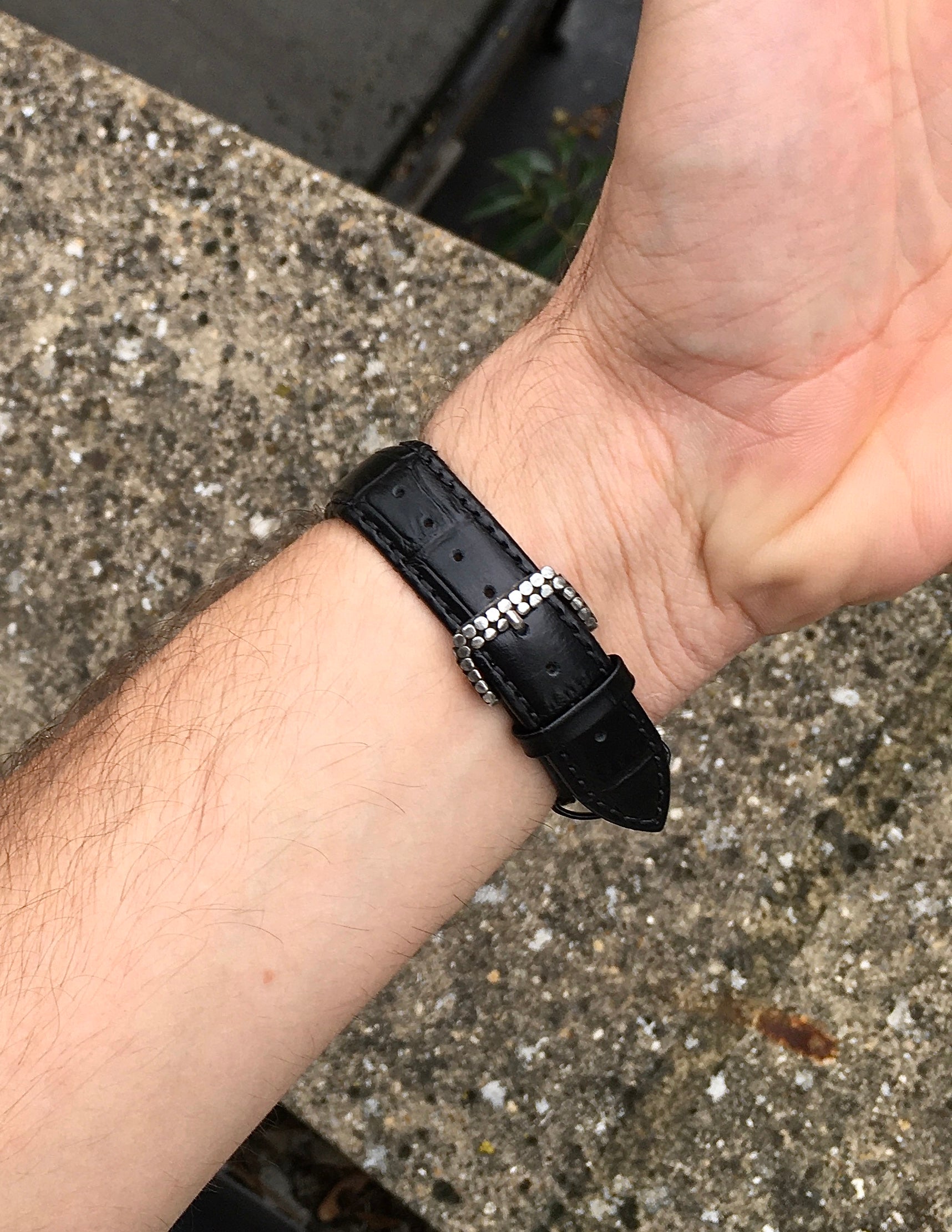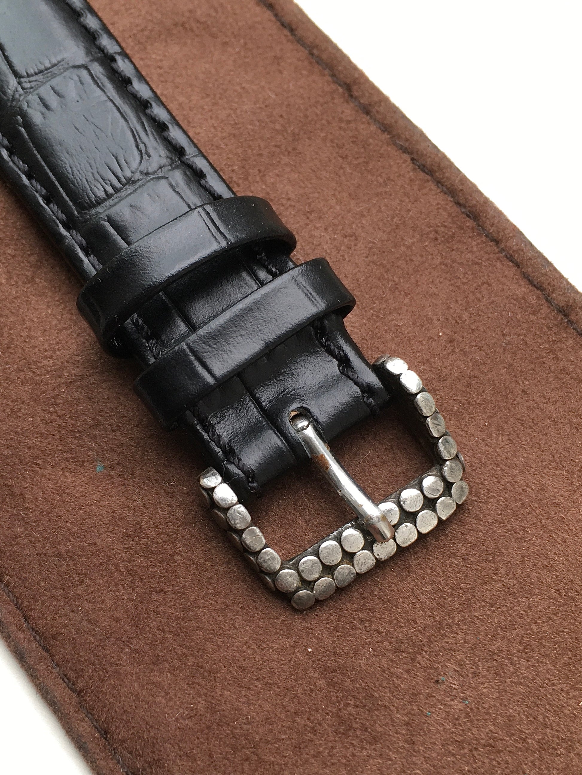 Fastening the black pressed leather strap is the original John Hardy Sterling silver buckle with a fineness marking of ‘925’ and stamped with the marque’s ‘H’ logo