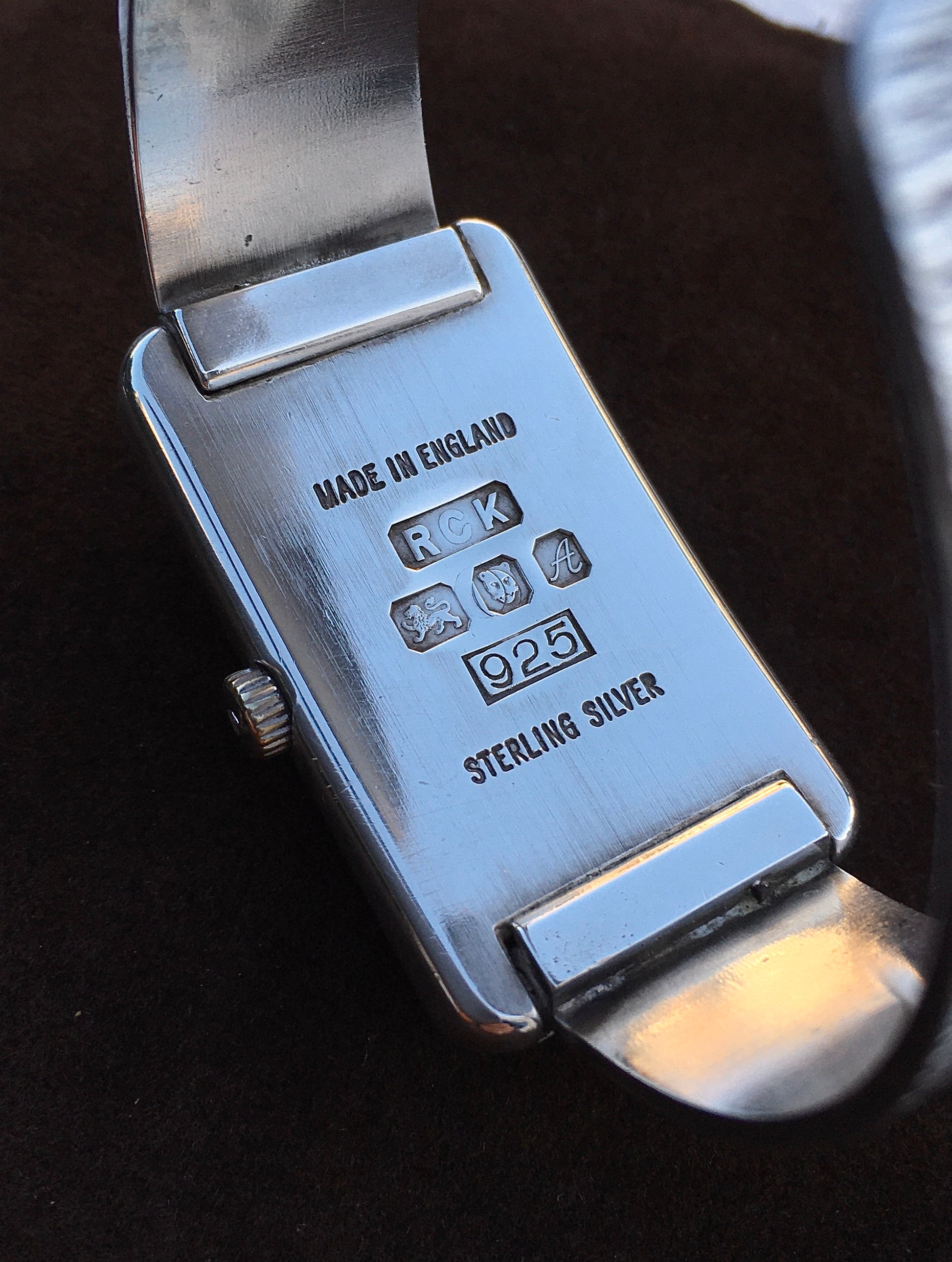 The case back and bracelet boast bold assay marks and the crown King’s Logo
