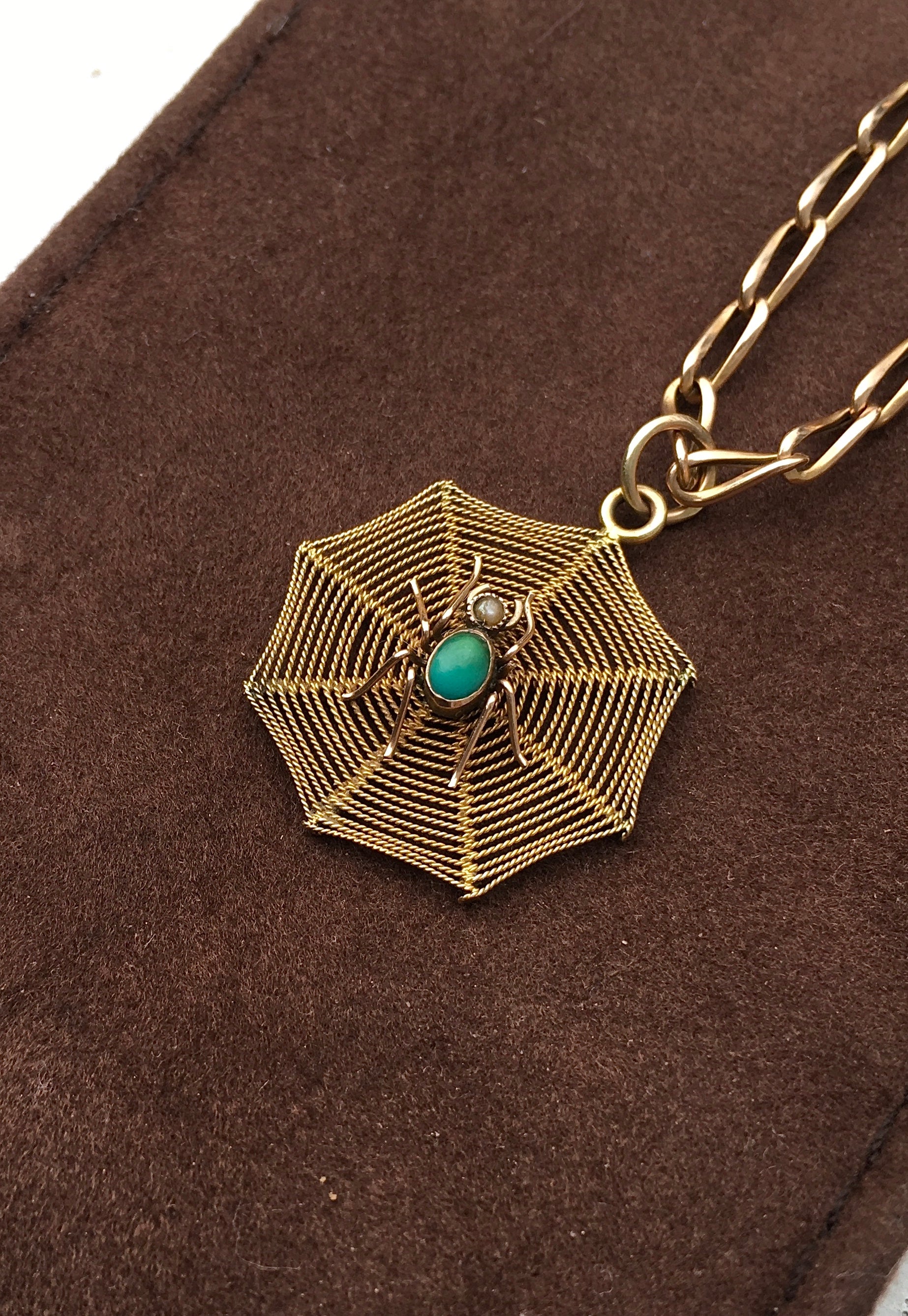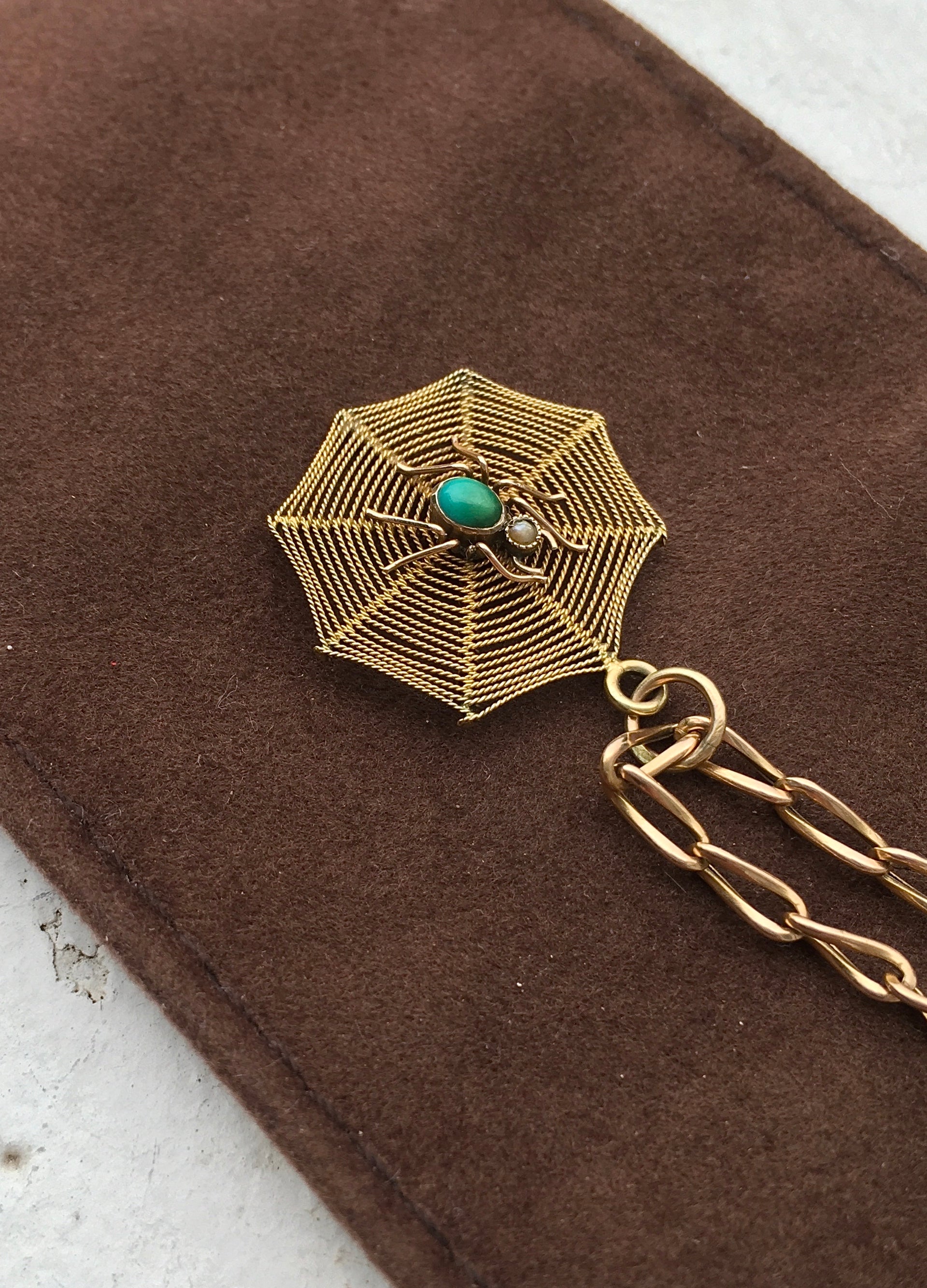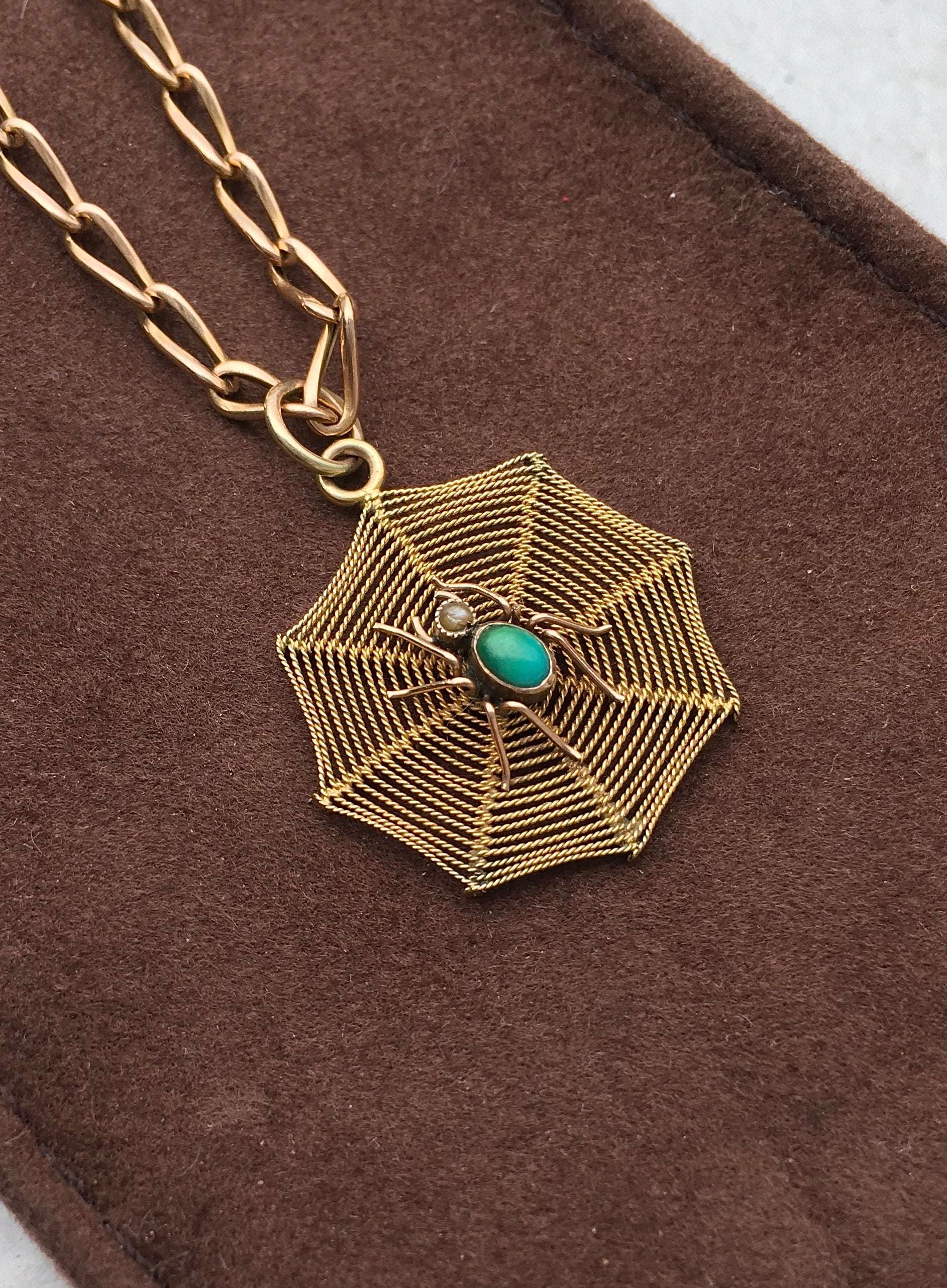An outrageously cool Victorian 9ct gold spider, set with Turquoise for the abdomen and seed Pearl for the head, in the middle of a 9ct gold rope-twist spiderweb. Stamped ‘9ct’