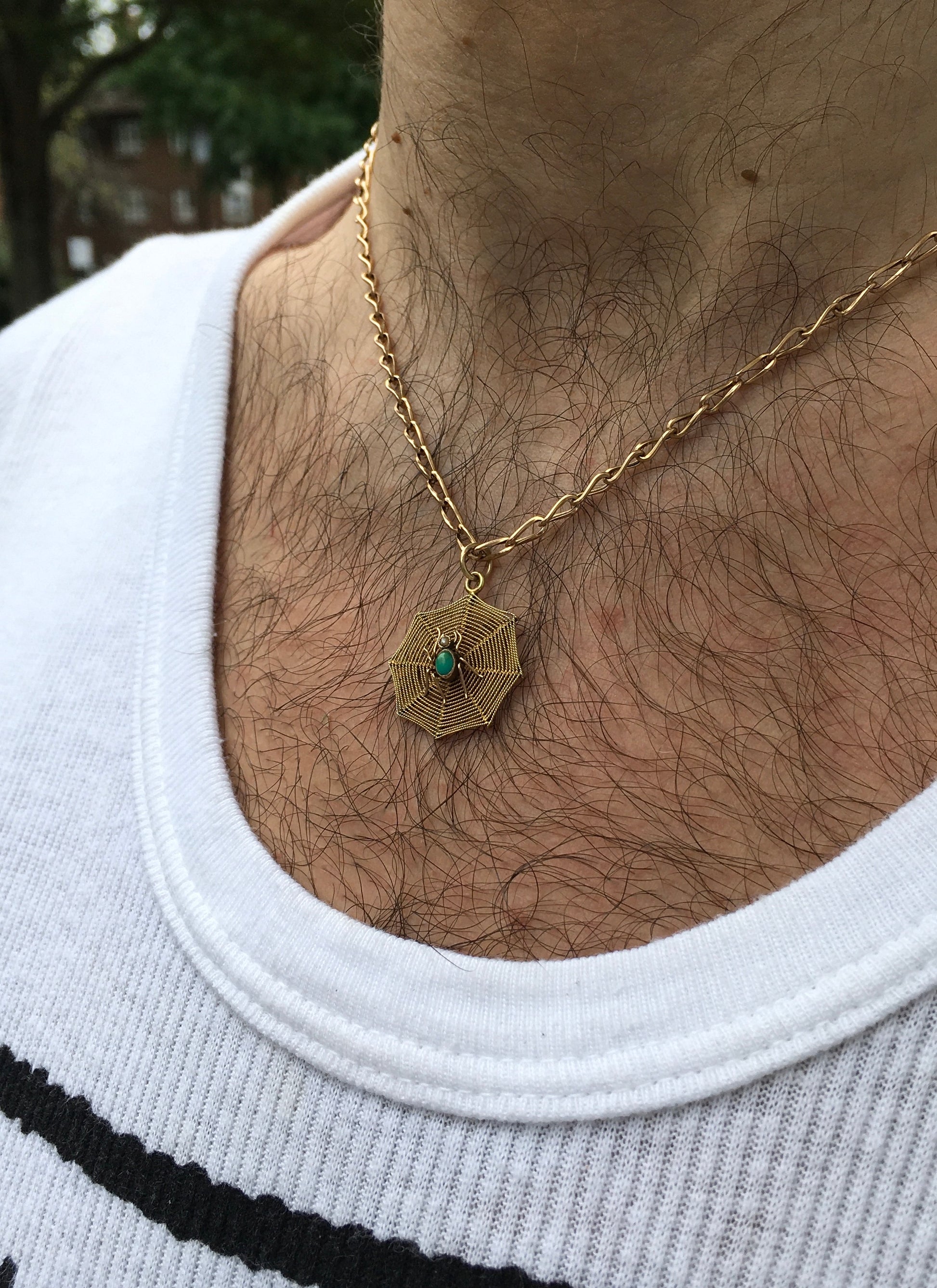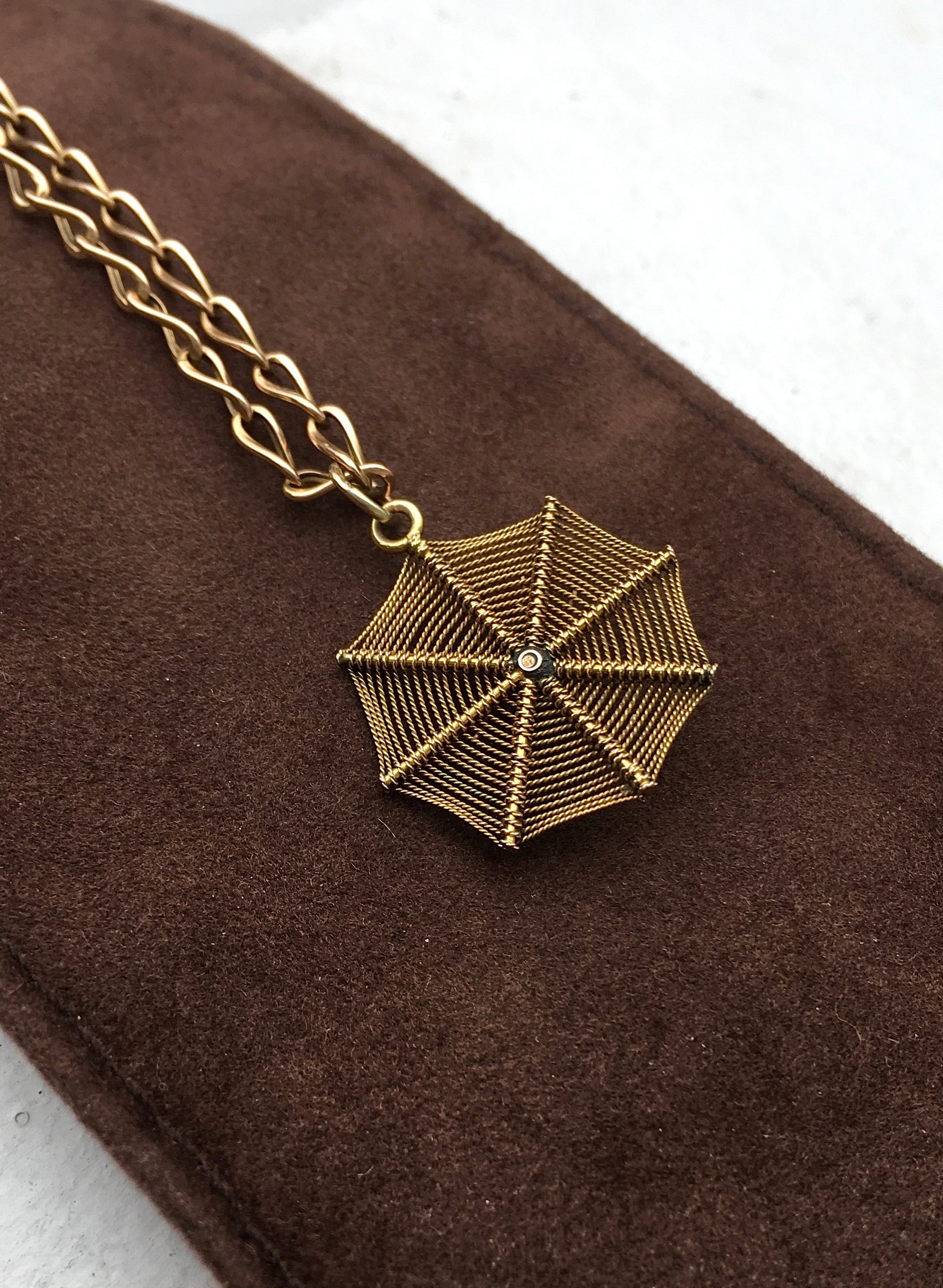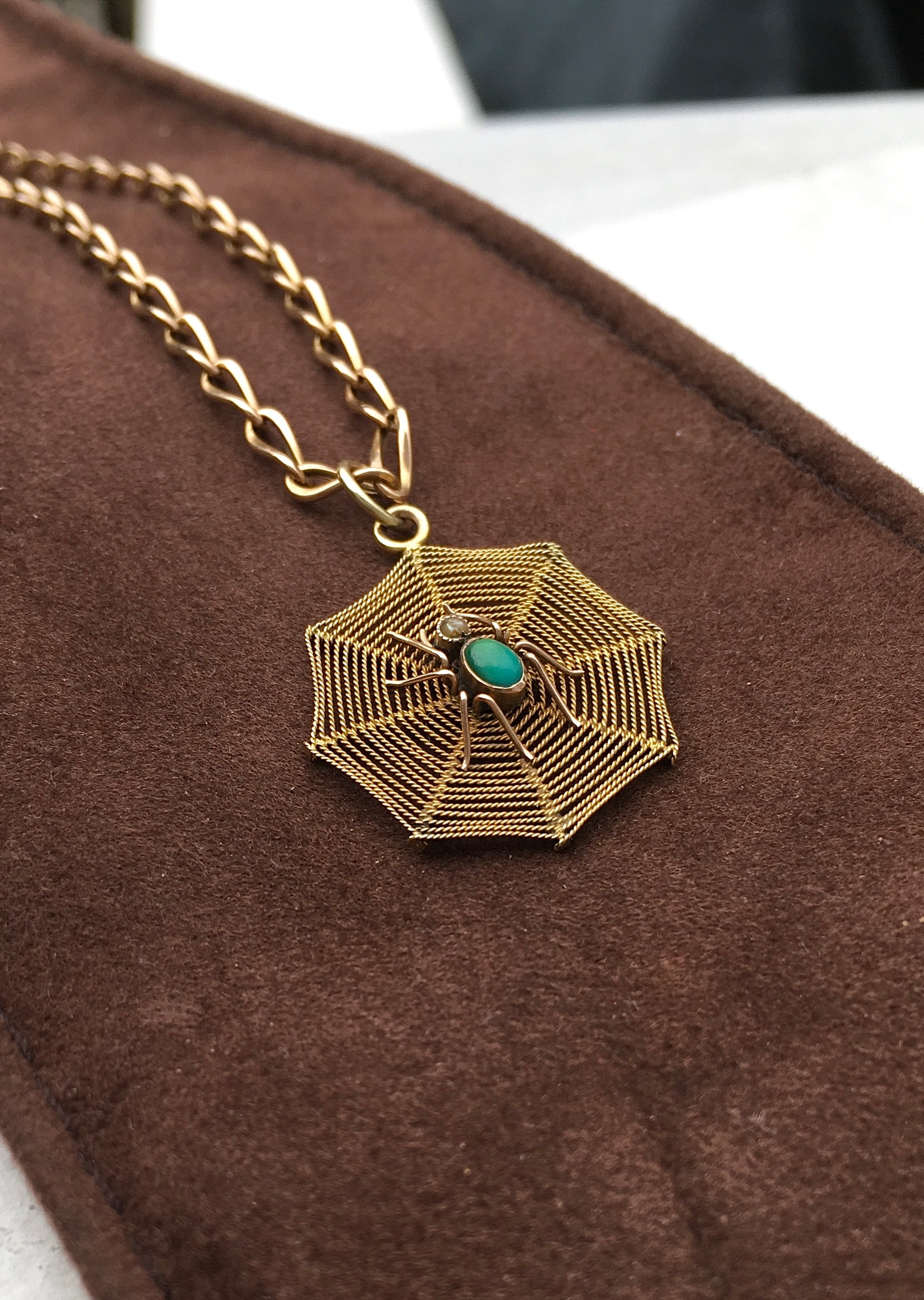 An outrageously cool Victorian 9ct gold spider, set with Turquoise for the abdomen and seed Pearl for the head, in the middle of a 9ct gold rope-twist spiderweb. Stamped ‘9ct’
