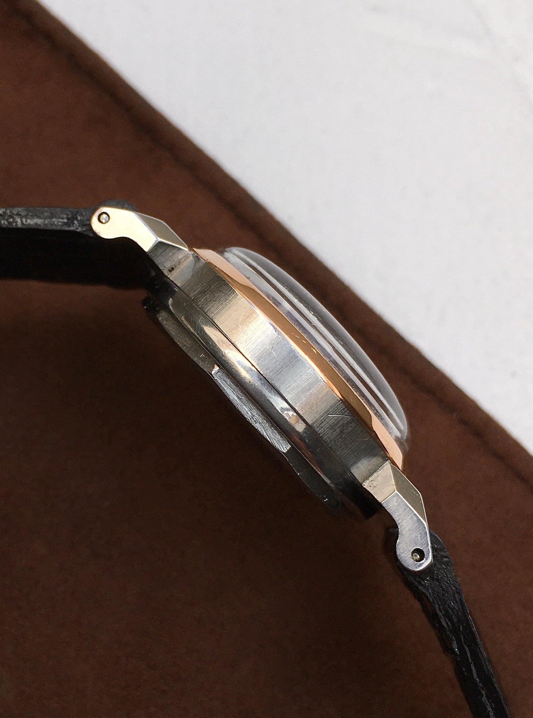 The steel case remains in remarkable condition and features a solid rose gold bezel to compliment the pink of the dial as well as faceted ‘corne de vache’ lugs. The screw down case back is skilfully inscribed ‘Geo. O. Boucher’