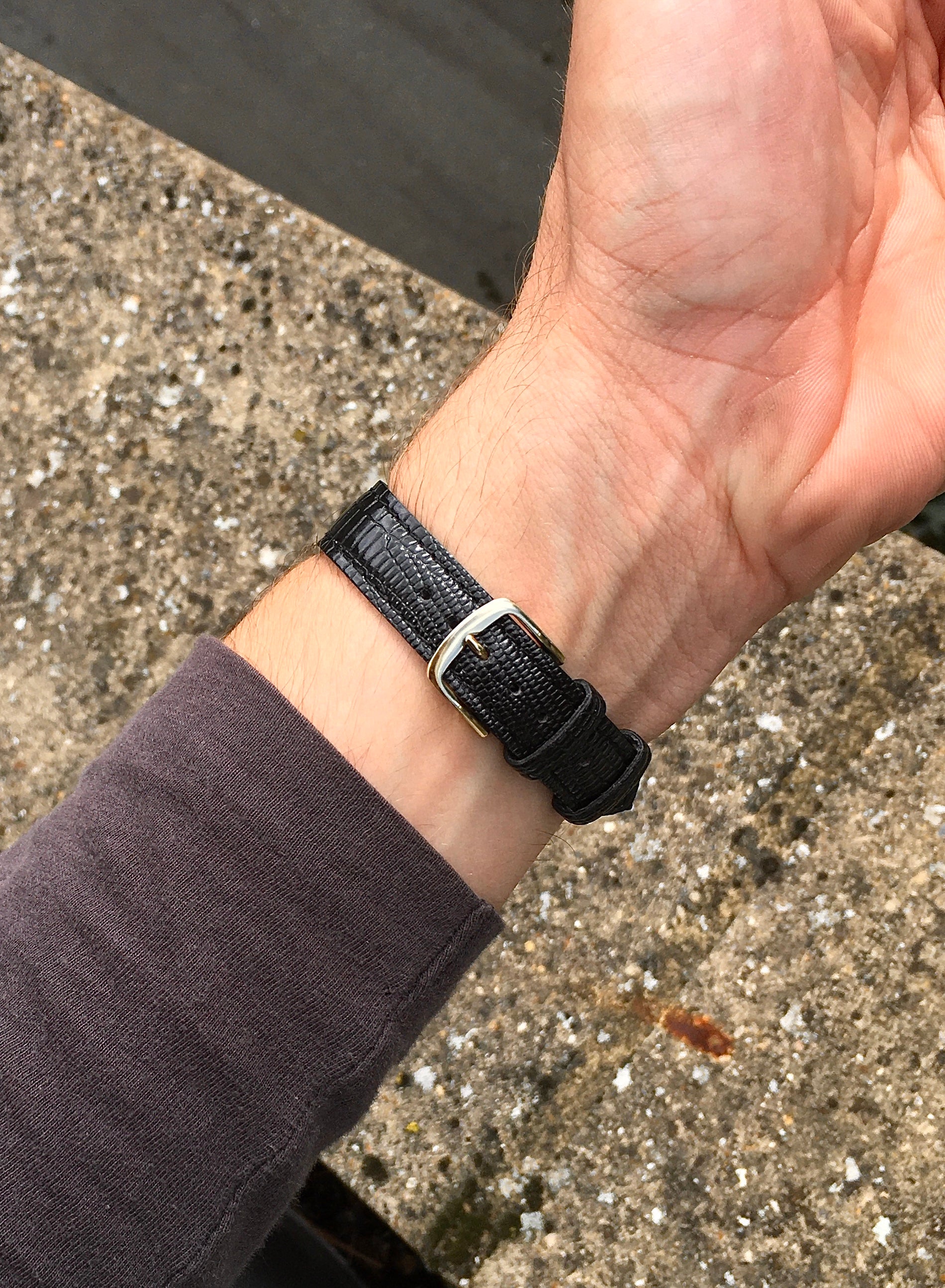 Fitted is a black pressed leather strap and gold tone buckle