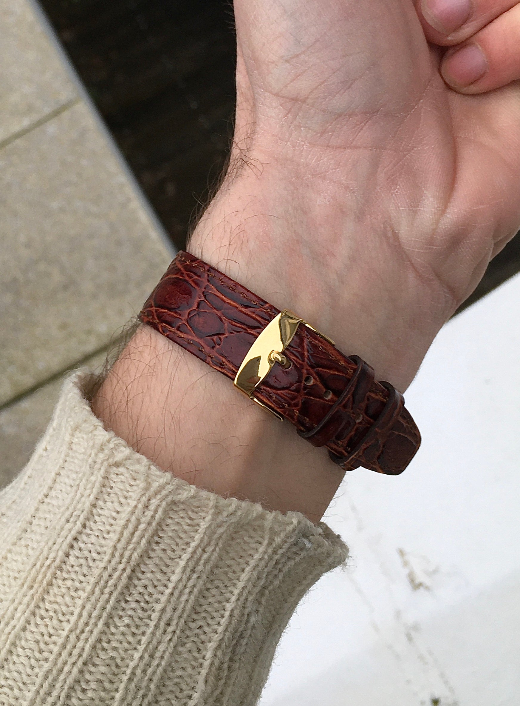 Fitted is a new brown pressed leather strap