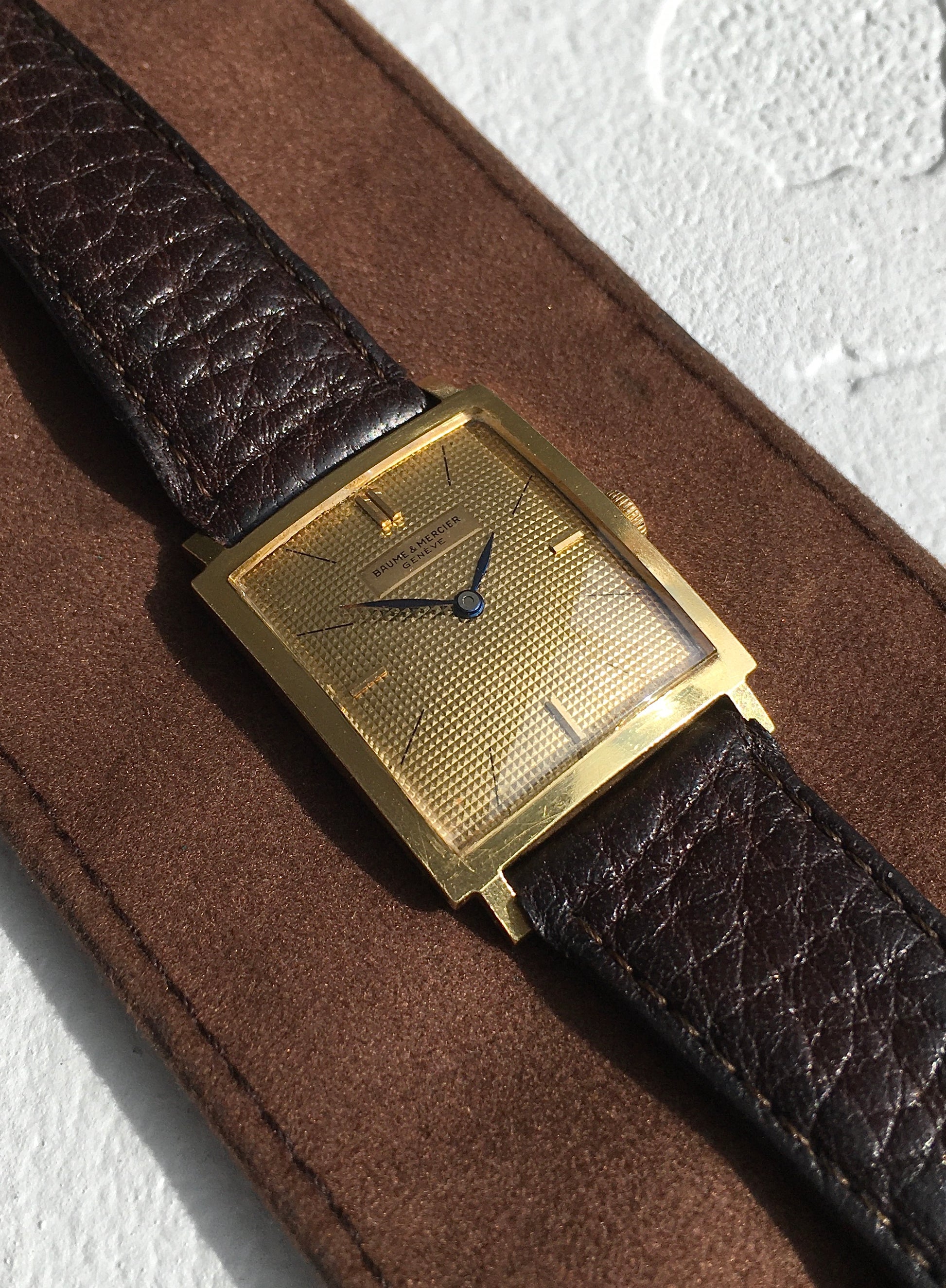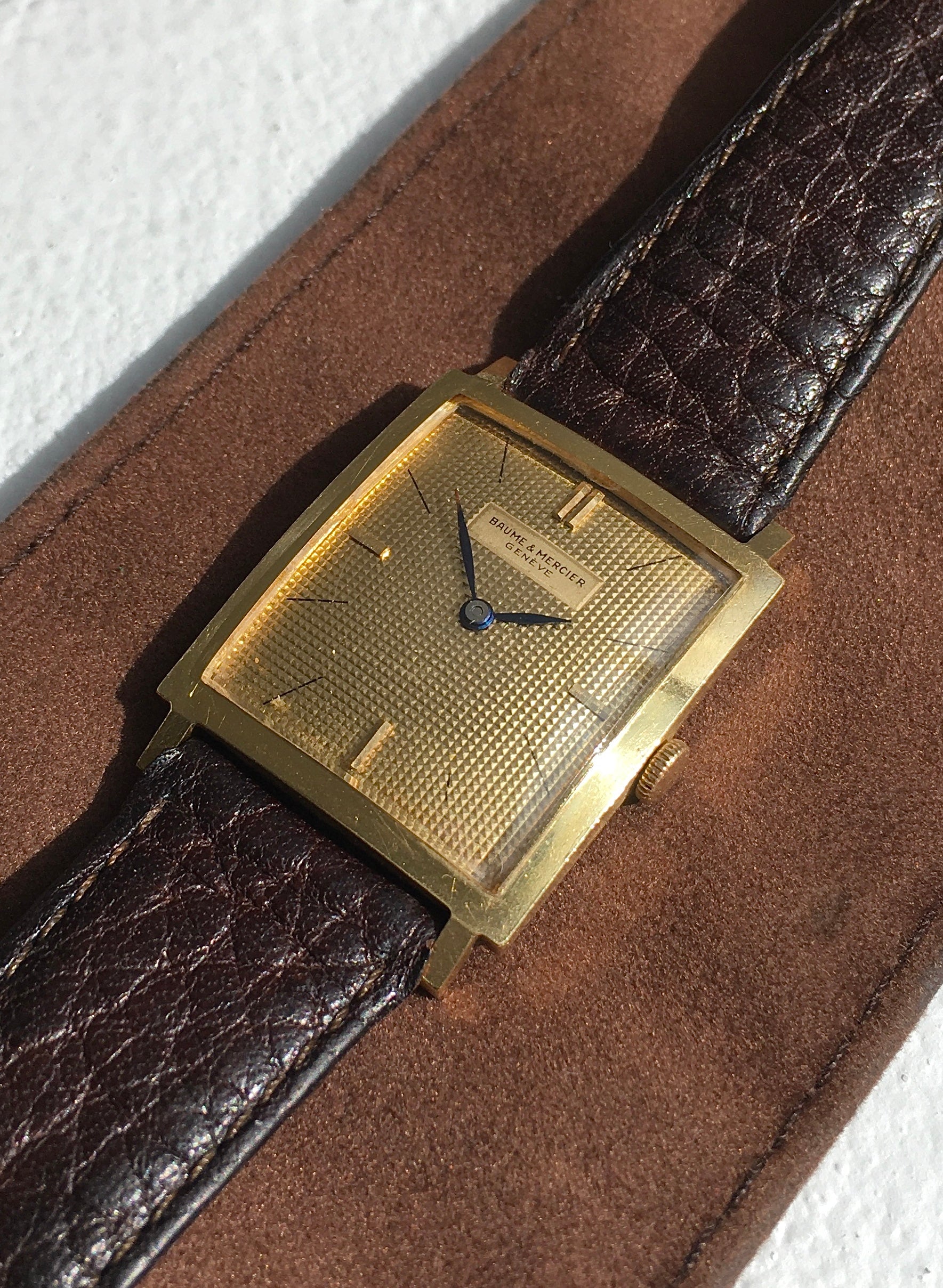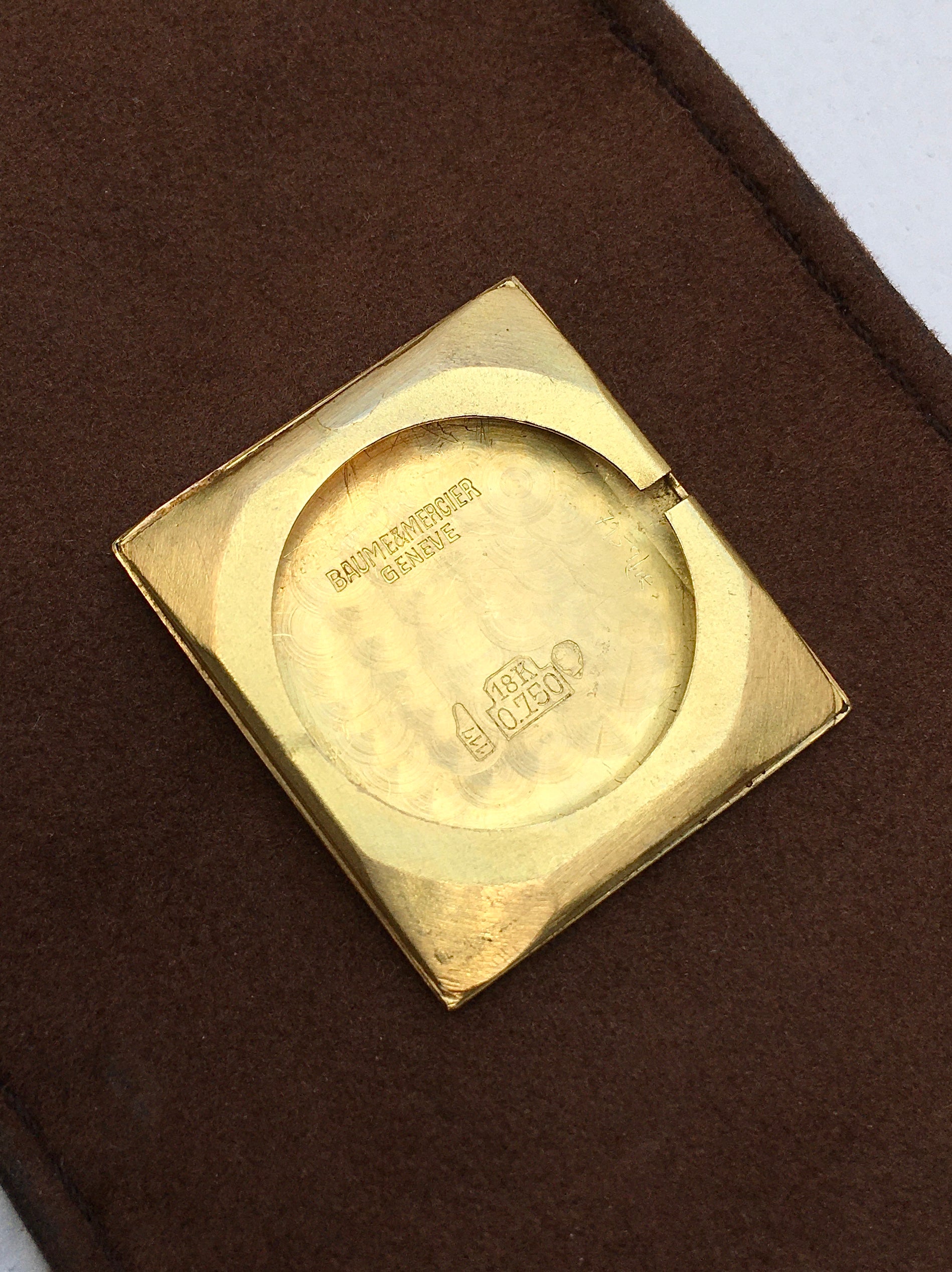 The solid yellow gold case remains in lovely condition with sharp facets and defined lugs. The inside of the case back is stamped ‘Baume & Mercier’ and, as well as fineness markings, bears the profile of Helvetia, the female personification of Switzerland and the country’s hallmark for 18 carat gold