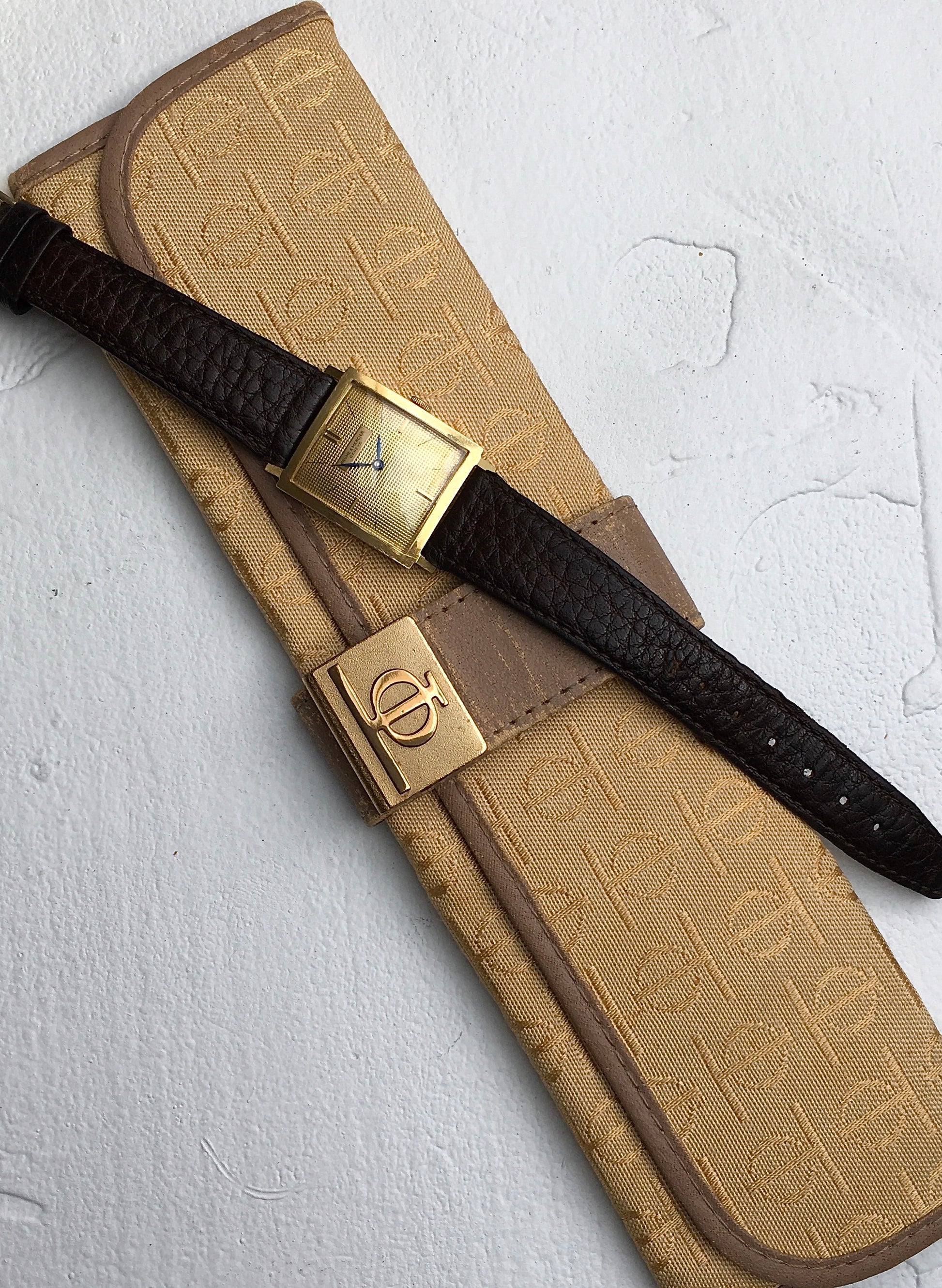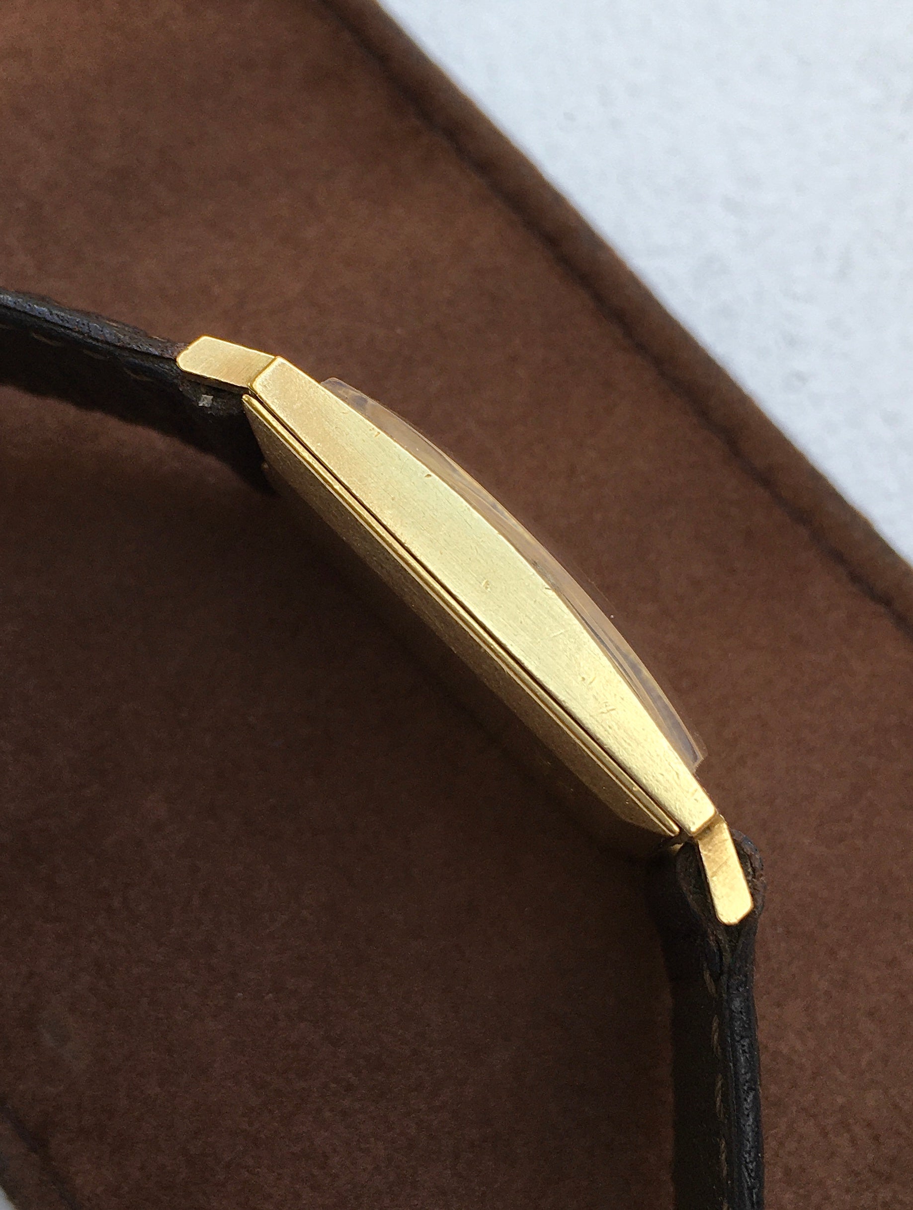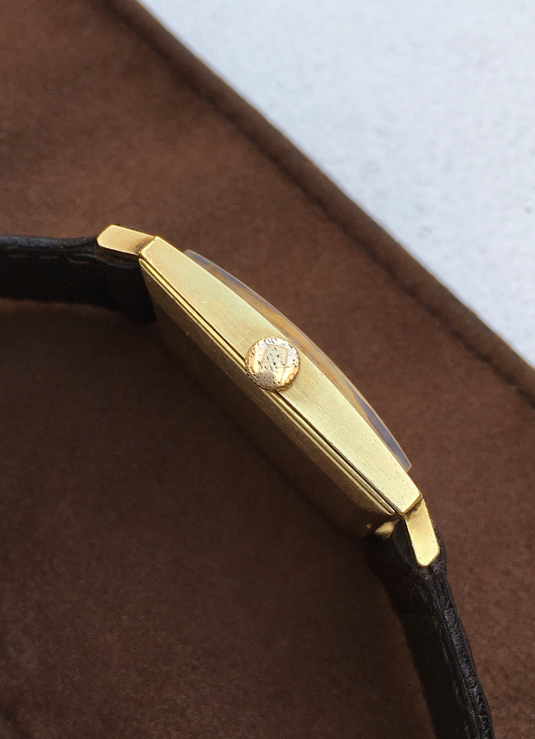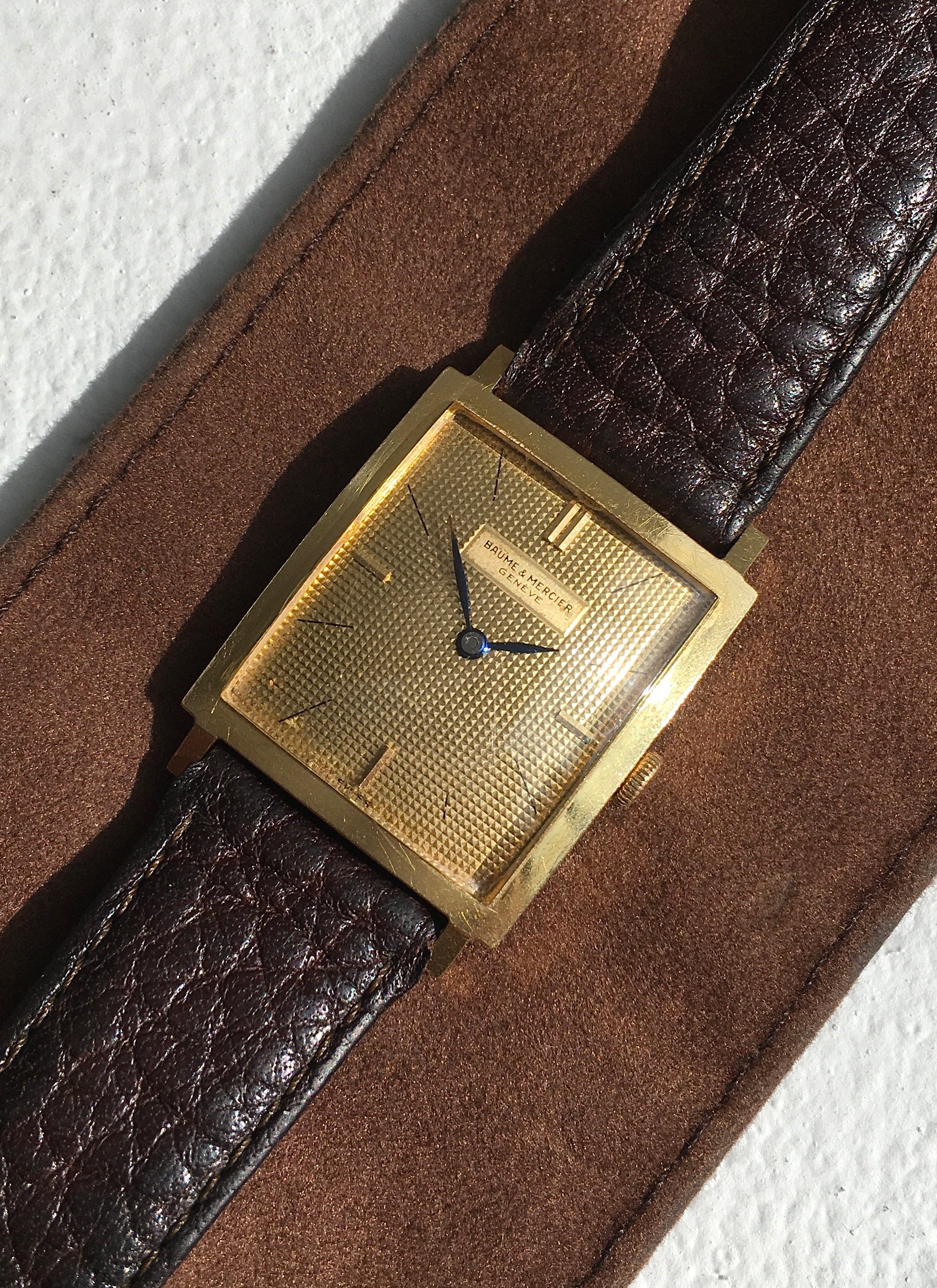 The solid yellow gold case remains in lovely condition with sharp facets and defined lugs. The inside of the case back is stamped ‘Baume & Mercier’ and, as well as fineness markings, bears the profile of Helvetia, the female personification of Switzerland and the country’s hallmark for 18 carat gold