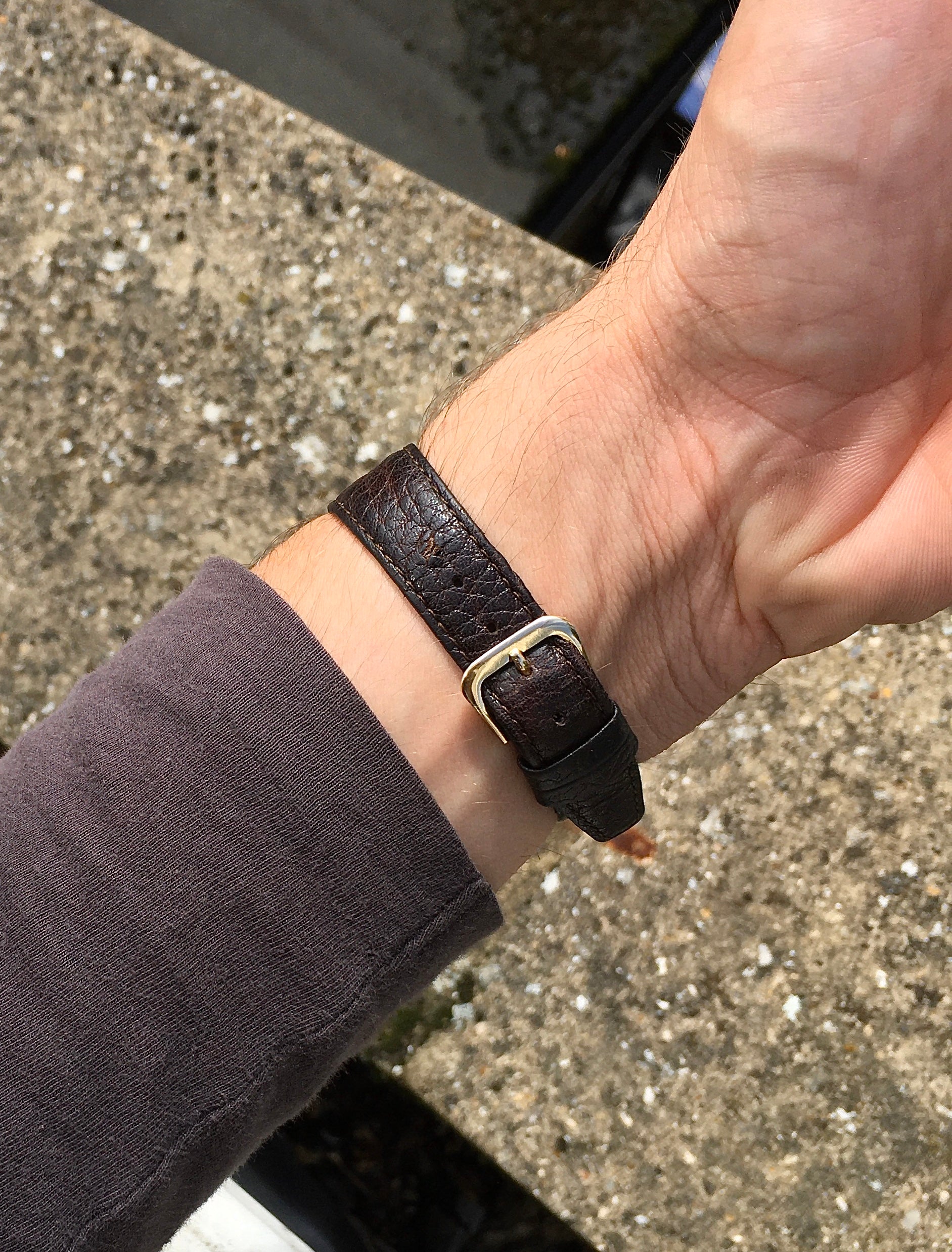 Fitted is a vintage brown calf skin strap and gold tone buckle