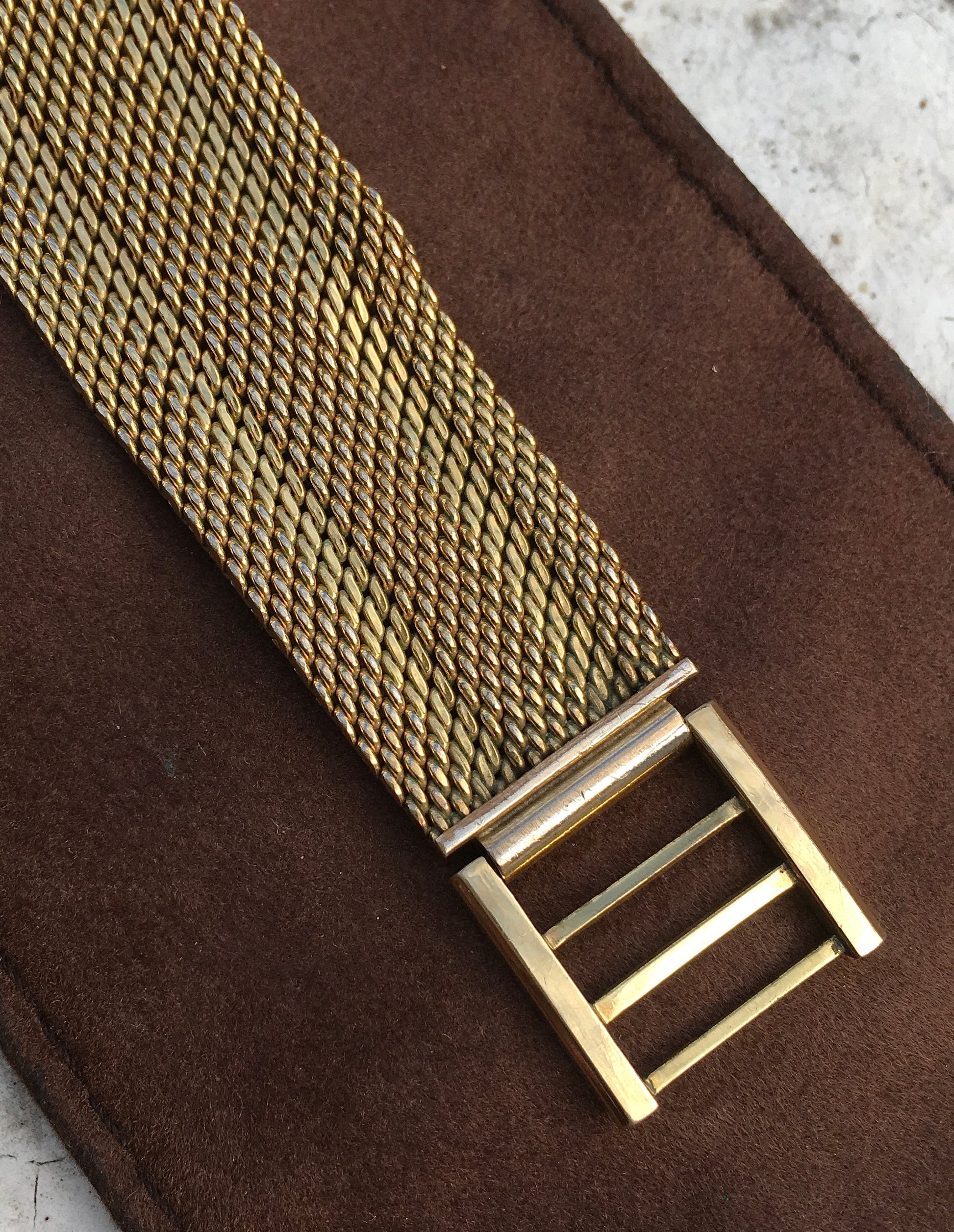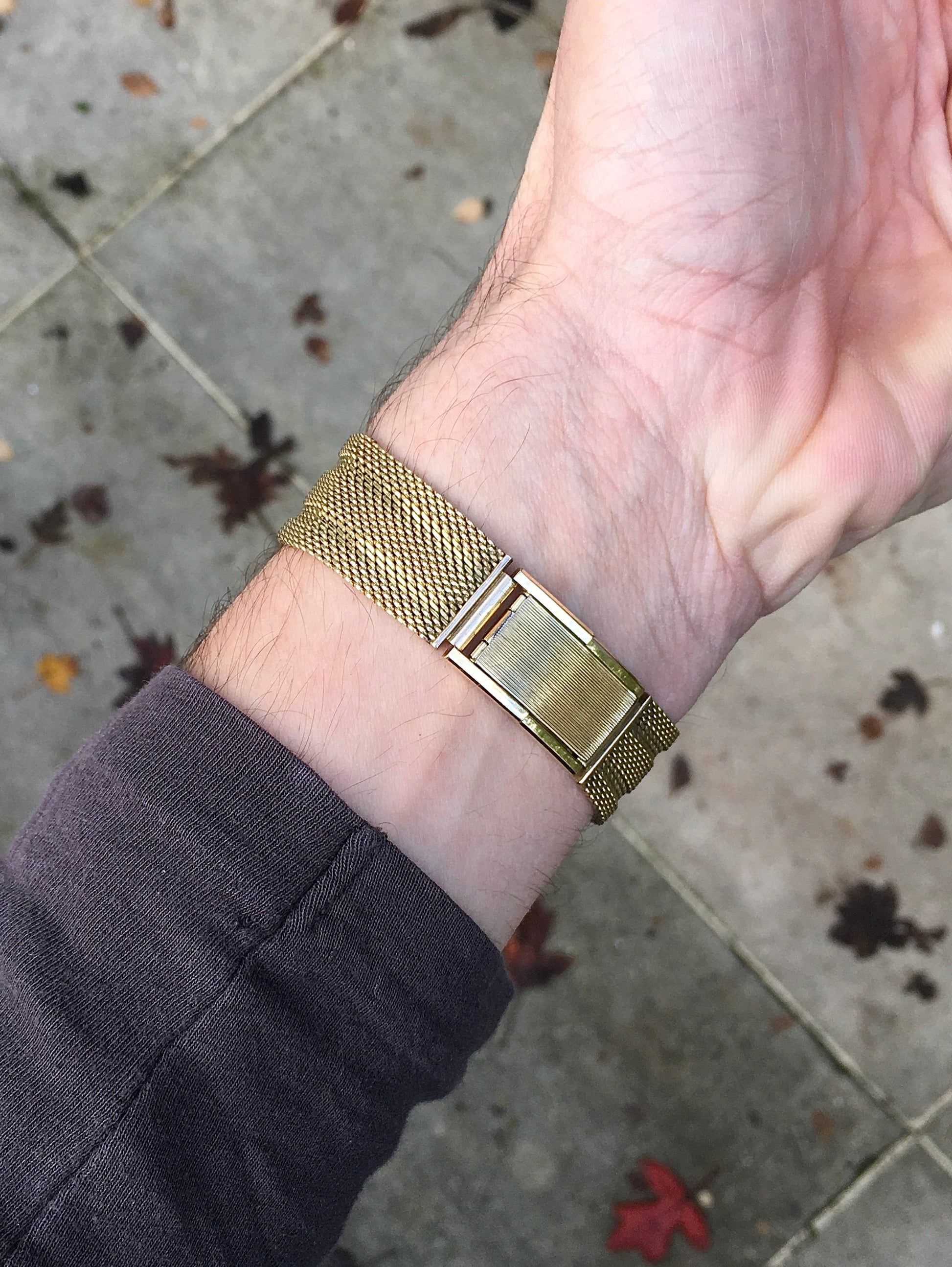 The gold plated Milanese mesh bracelet shows slight signs of stretching but minimal wear to the plating