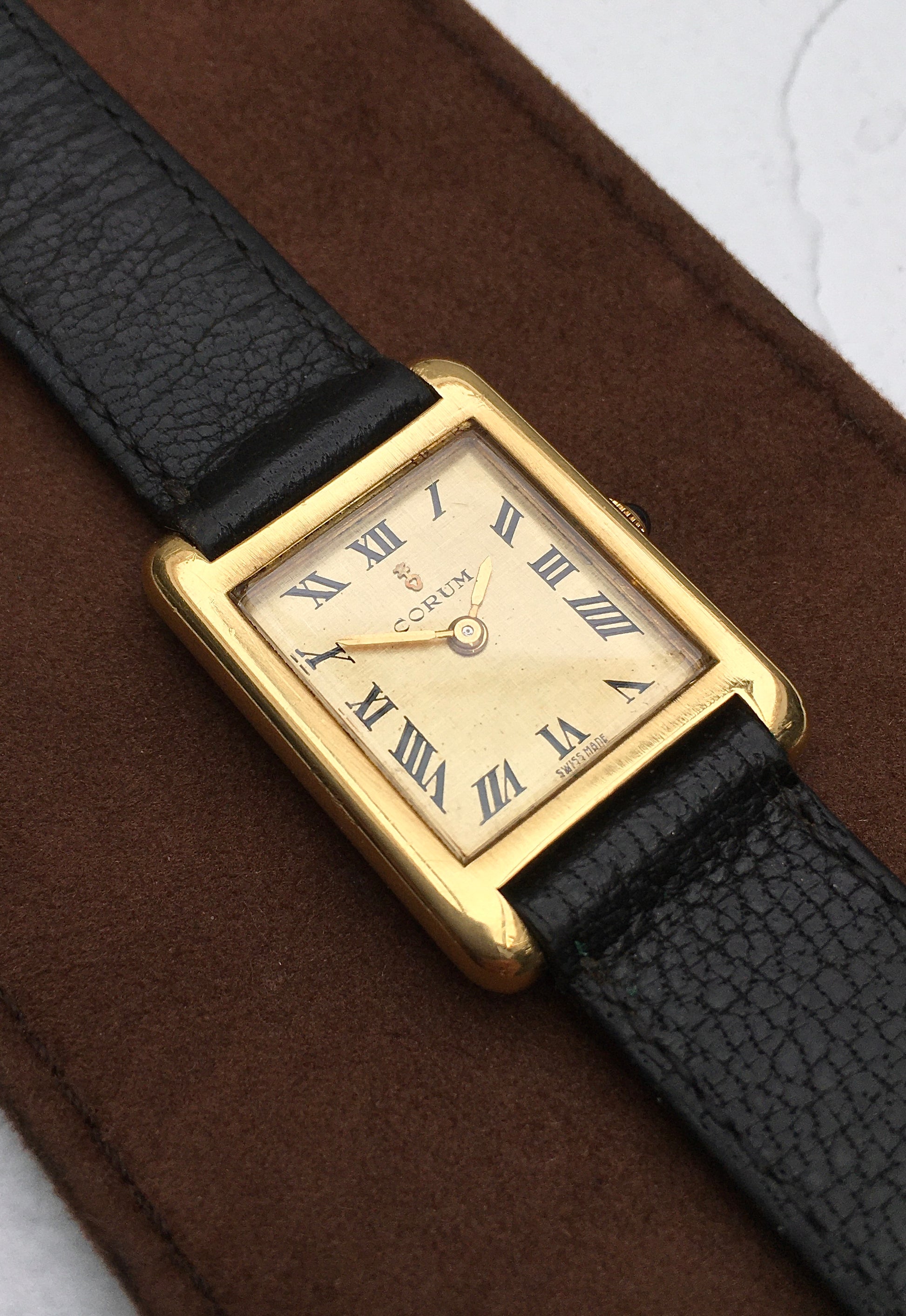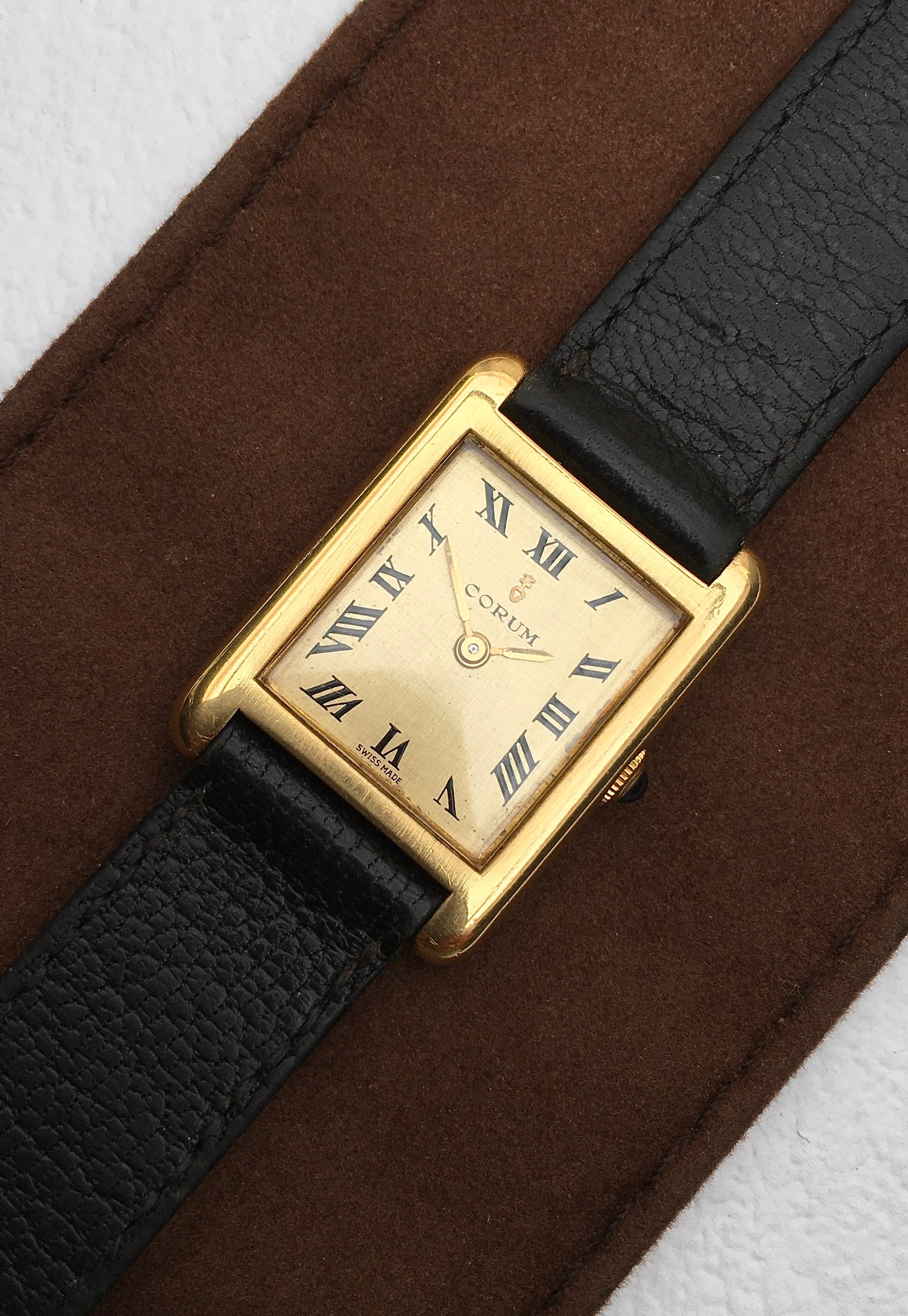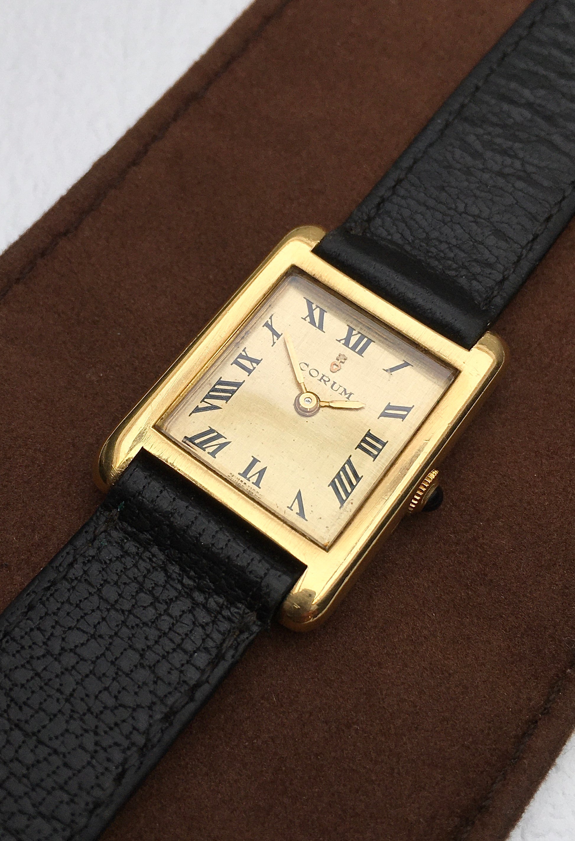 A classically elegant 1979 18 carat yellow gold Corum Tank style wristwatch