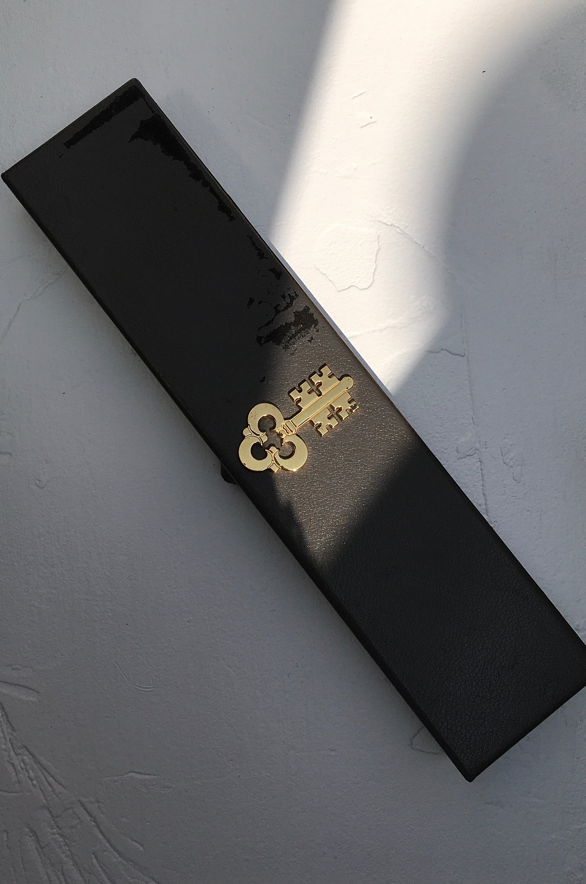 This refined piece features a golden ‘linen’ dial decorated with black Roman numerals, golden hands and ‘Corum’, above which sits the brand’s applied skyward pointing key logo