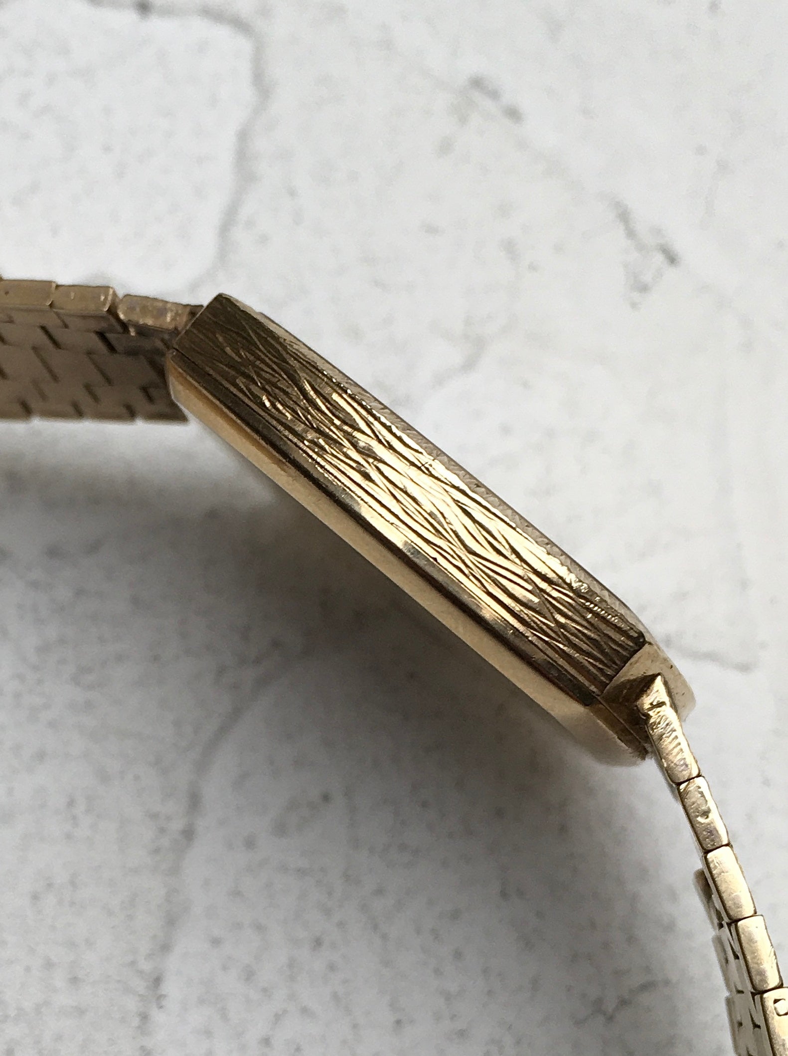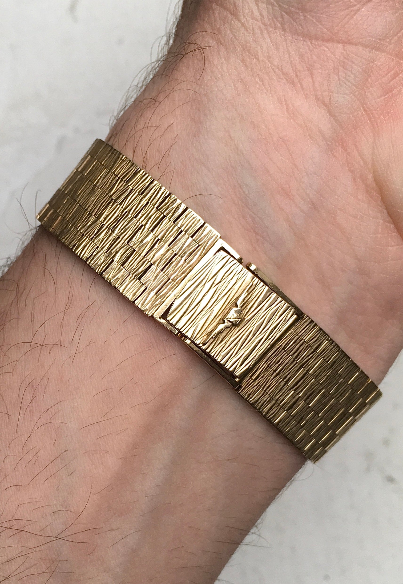 As pictured, there is a little more wear to the links close to the case at both 12 and 6 o’clock than there is to the rest of the bracelet. There is also a small, well executed solder repair to underside of the bracelet (pictured) near the three setting ladder clasp which is not at all visible from the other side