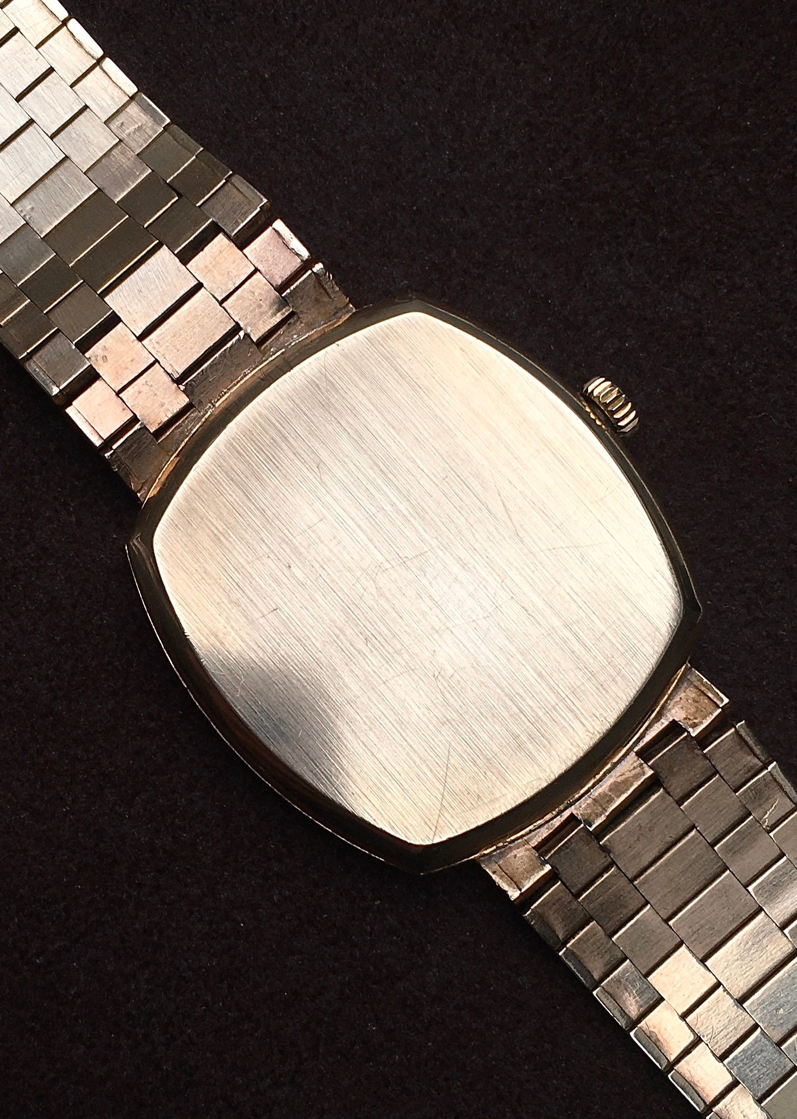 The outside of the brushed case-back is clear and unmarked while the inside bears hallmarks for London 1975