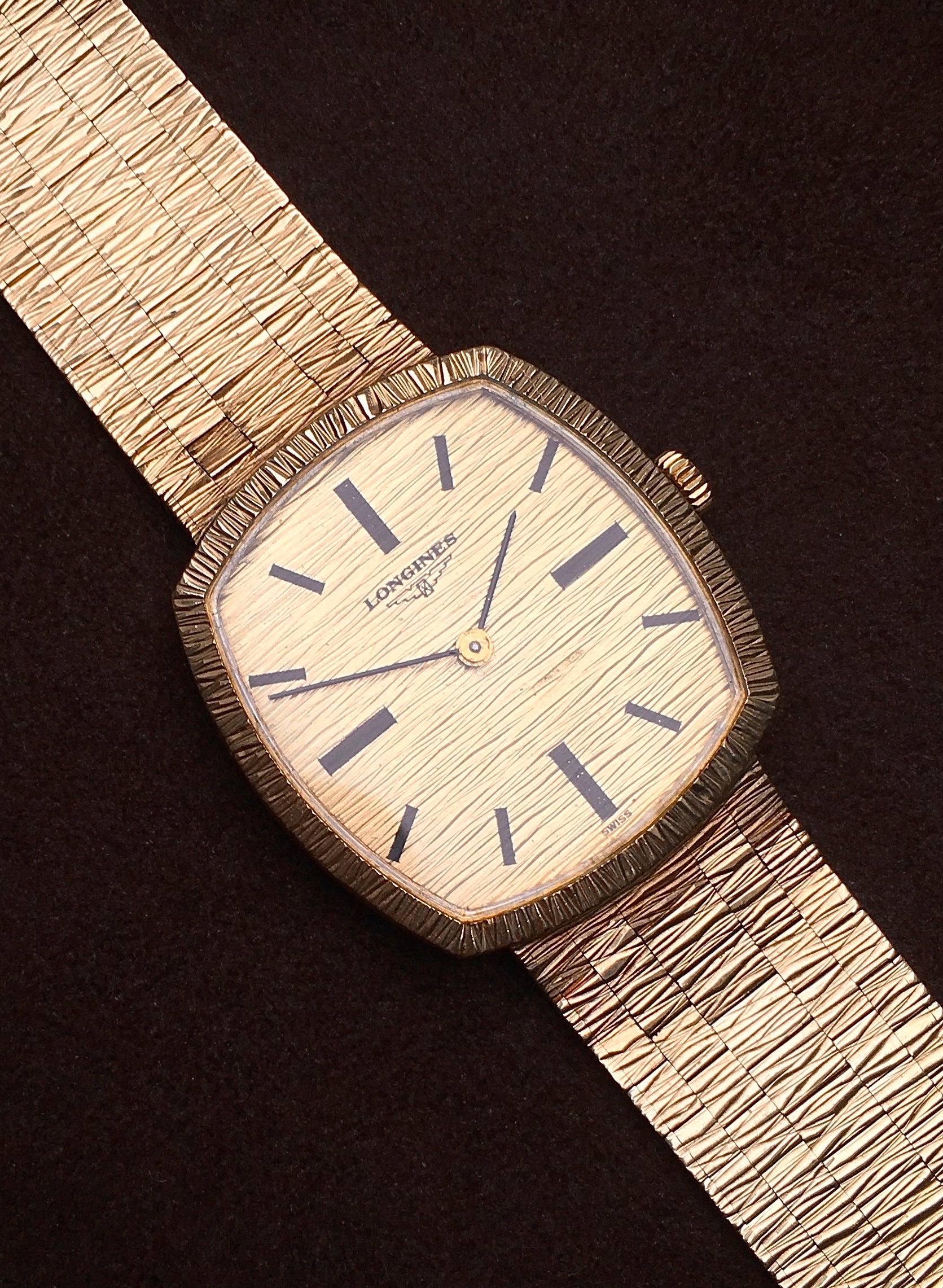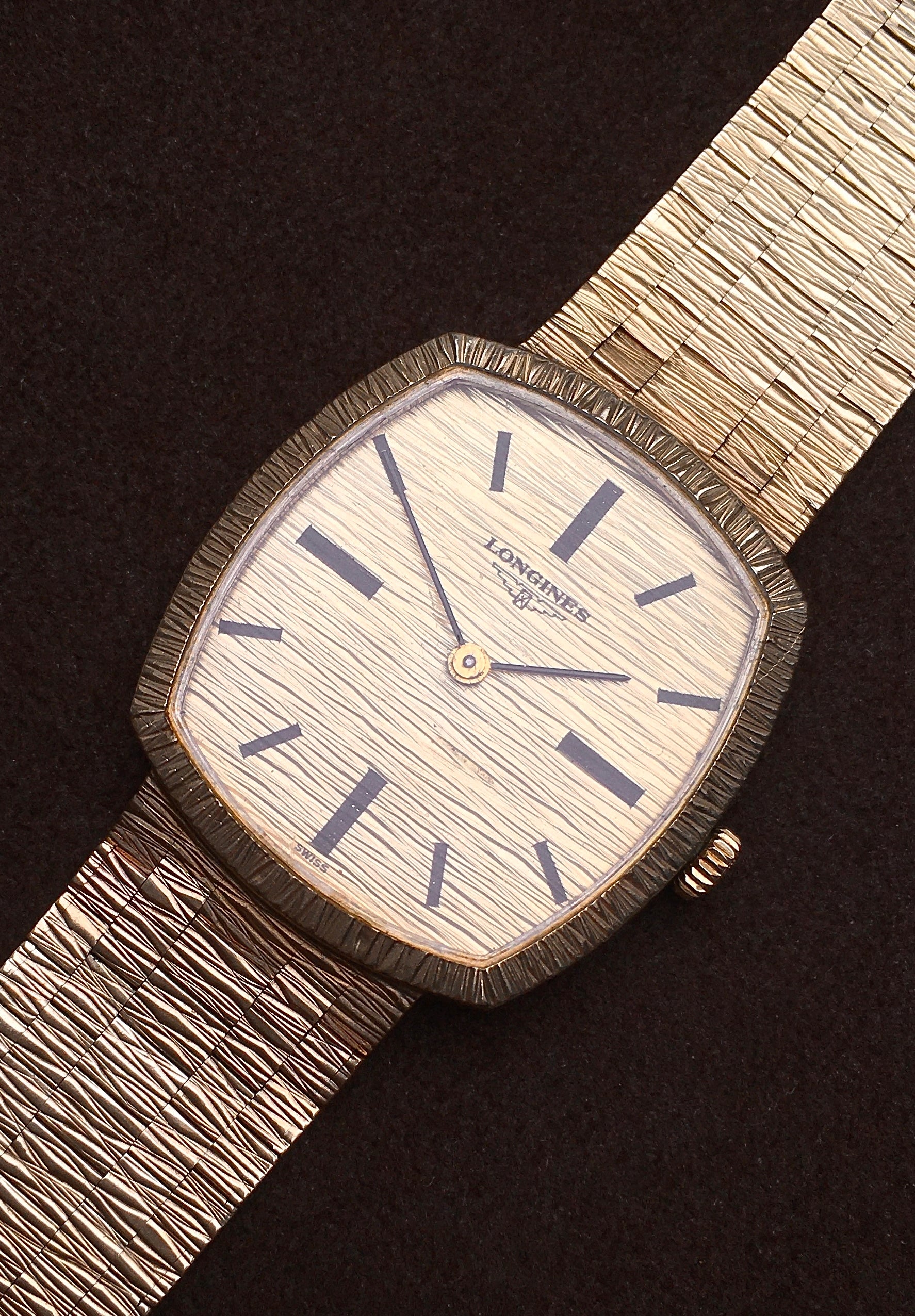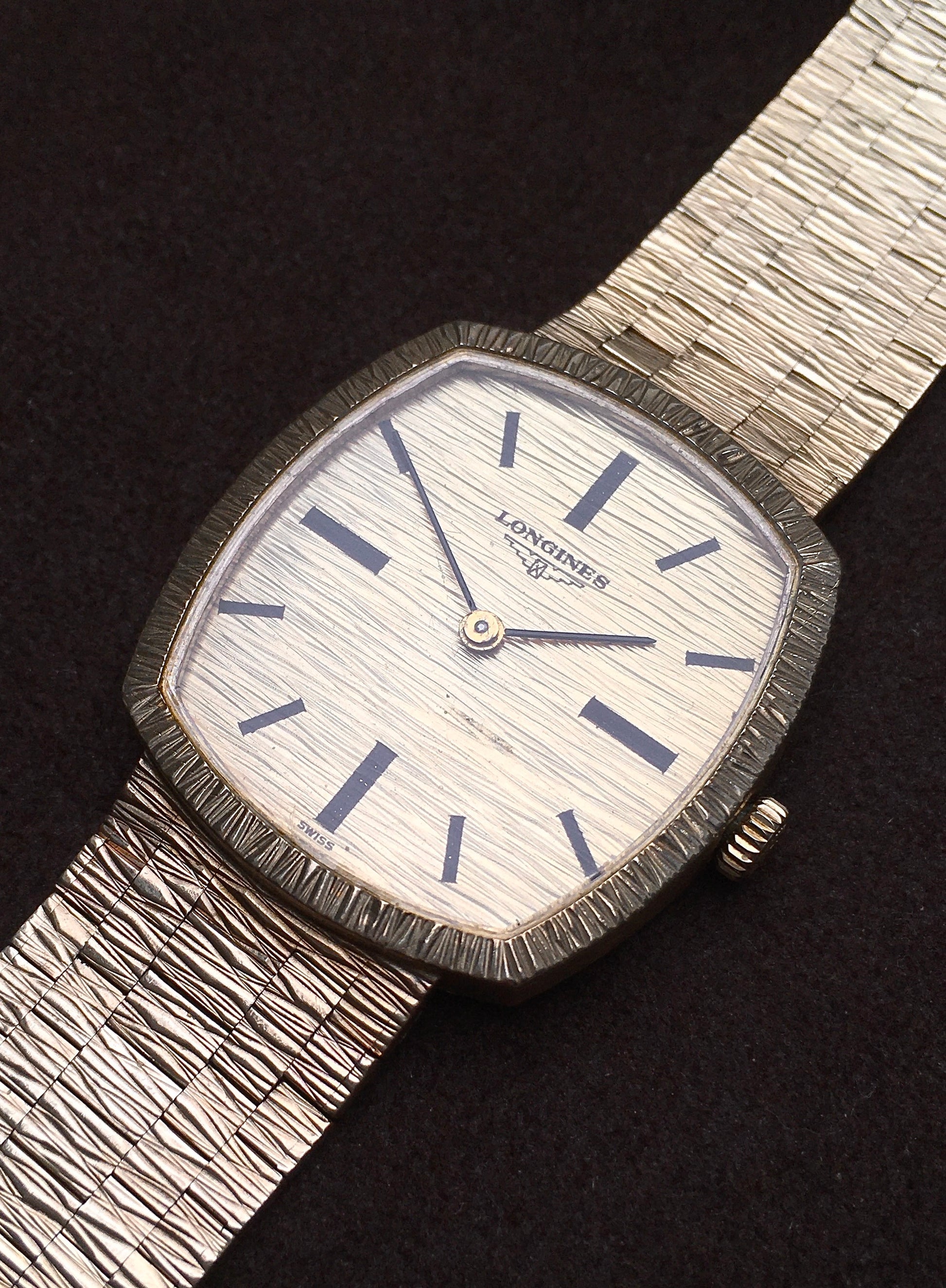 The bark finish dial is adorned with bold black baton indices, baton hands and ‘Longines’ alongside the brand’s iconic winged hourglass logo (the oldest unchanged active trademark registered with WIPO). It is in very good condition aside from a light mark above 5 o’clock