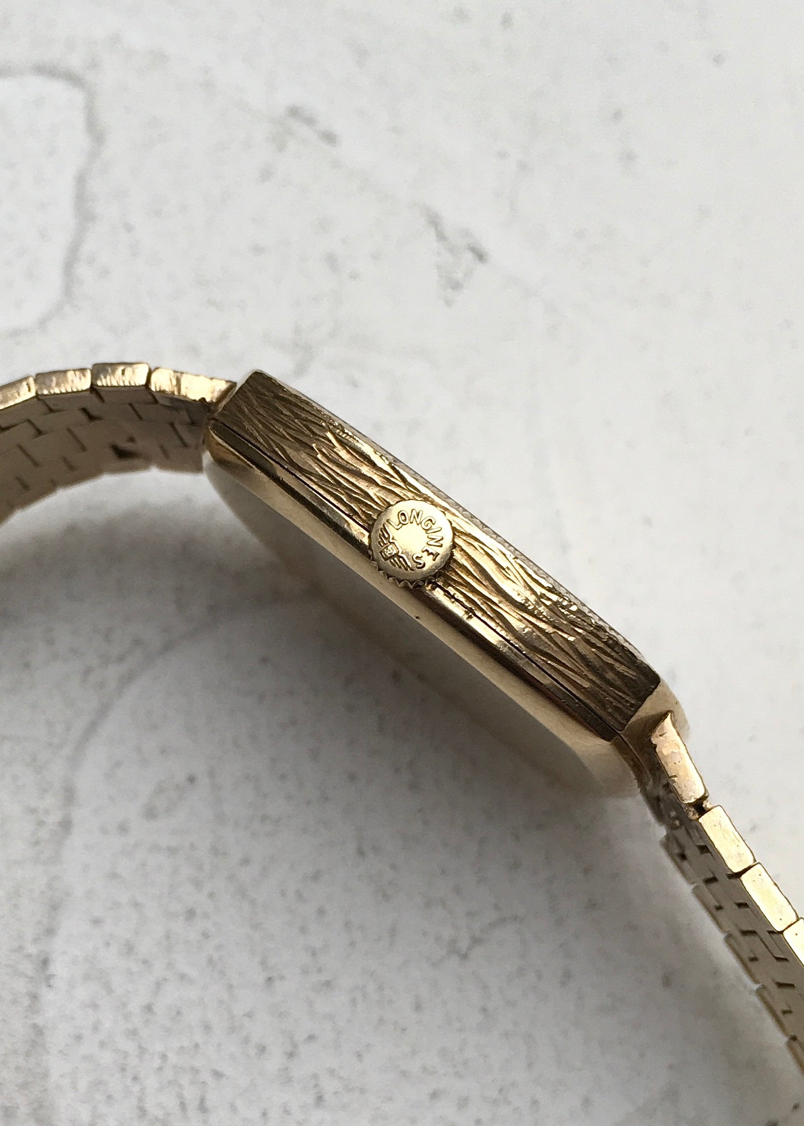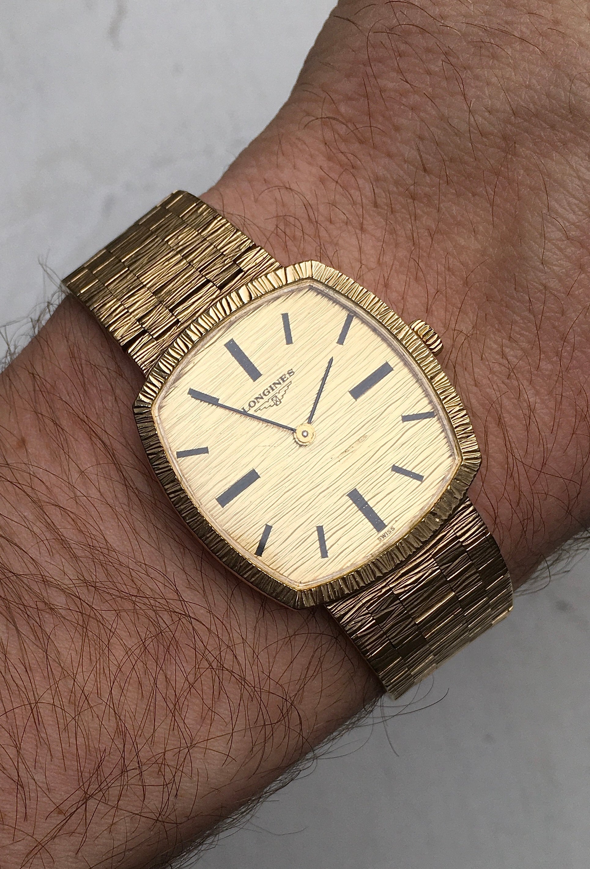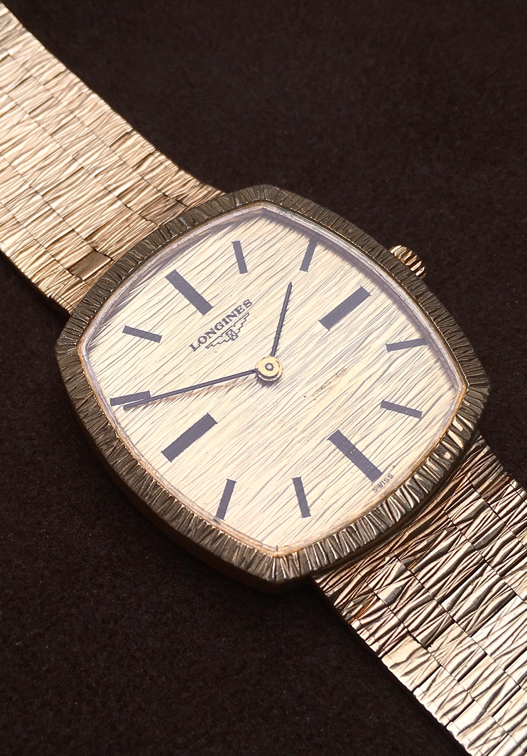 The bark finish dial is adorned with bold black baton indices, baton hands and ‘Longines’ alongside the brand’s iconic winged hourglass logo (the oldest unchanged active trademark registered with WIPO). It is in very good condition aside from a light mark above 5 o’clock