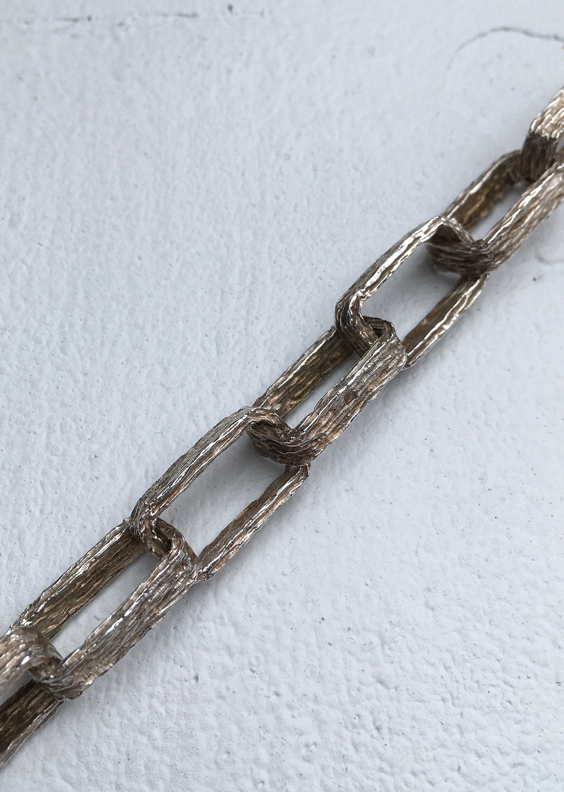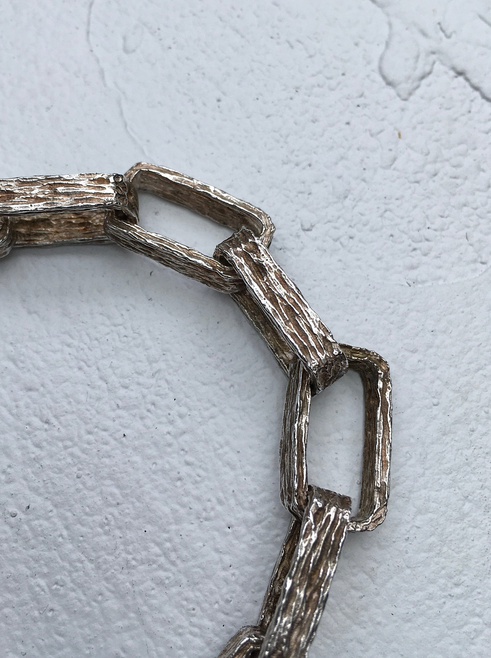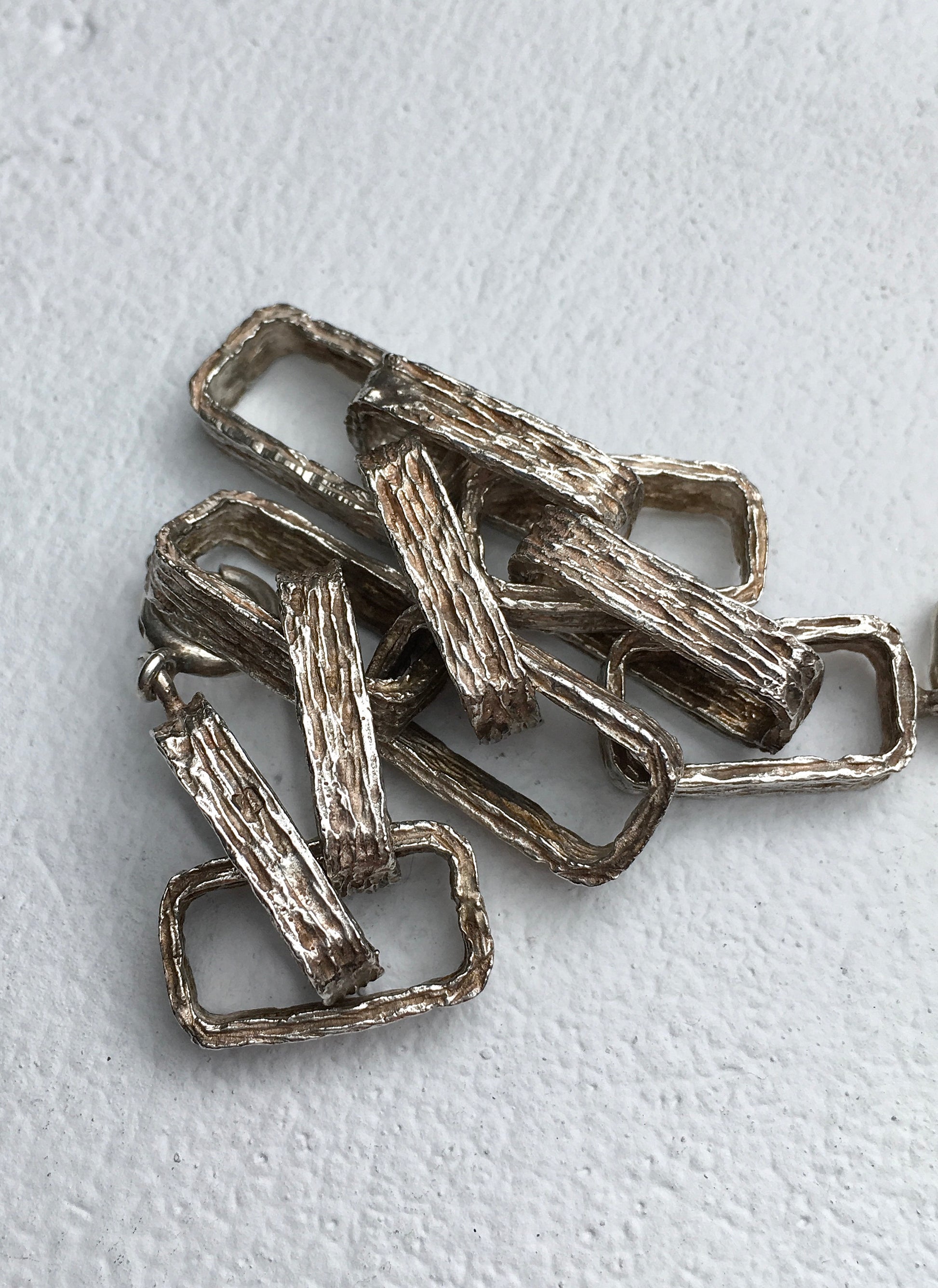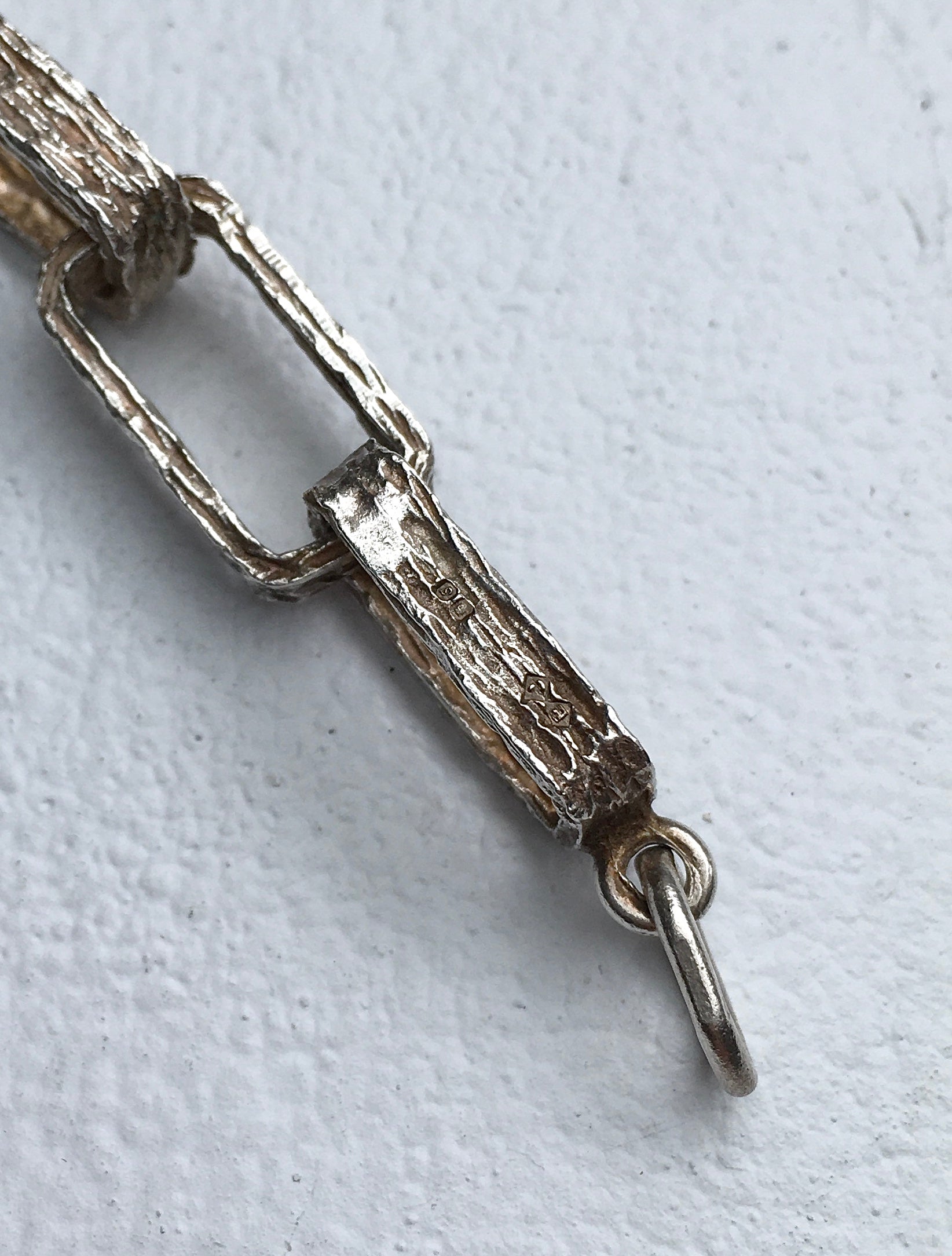 Obscured by the piece’s naturalistic finish are British hallmarks. A number of links are stamped with England’s ‘Walking Lion’ while an end link bears a maker’s mark of ‘BJ’ and assay marks for London 1973