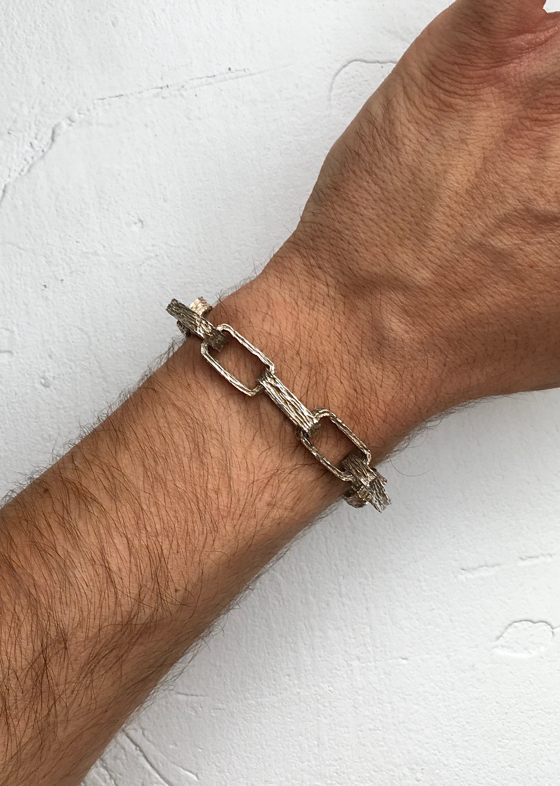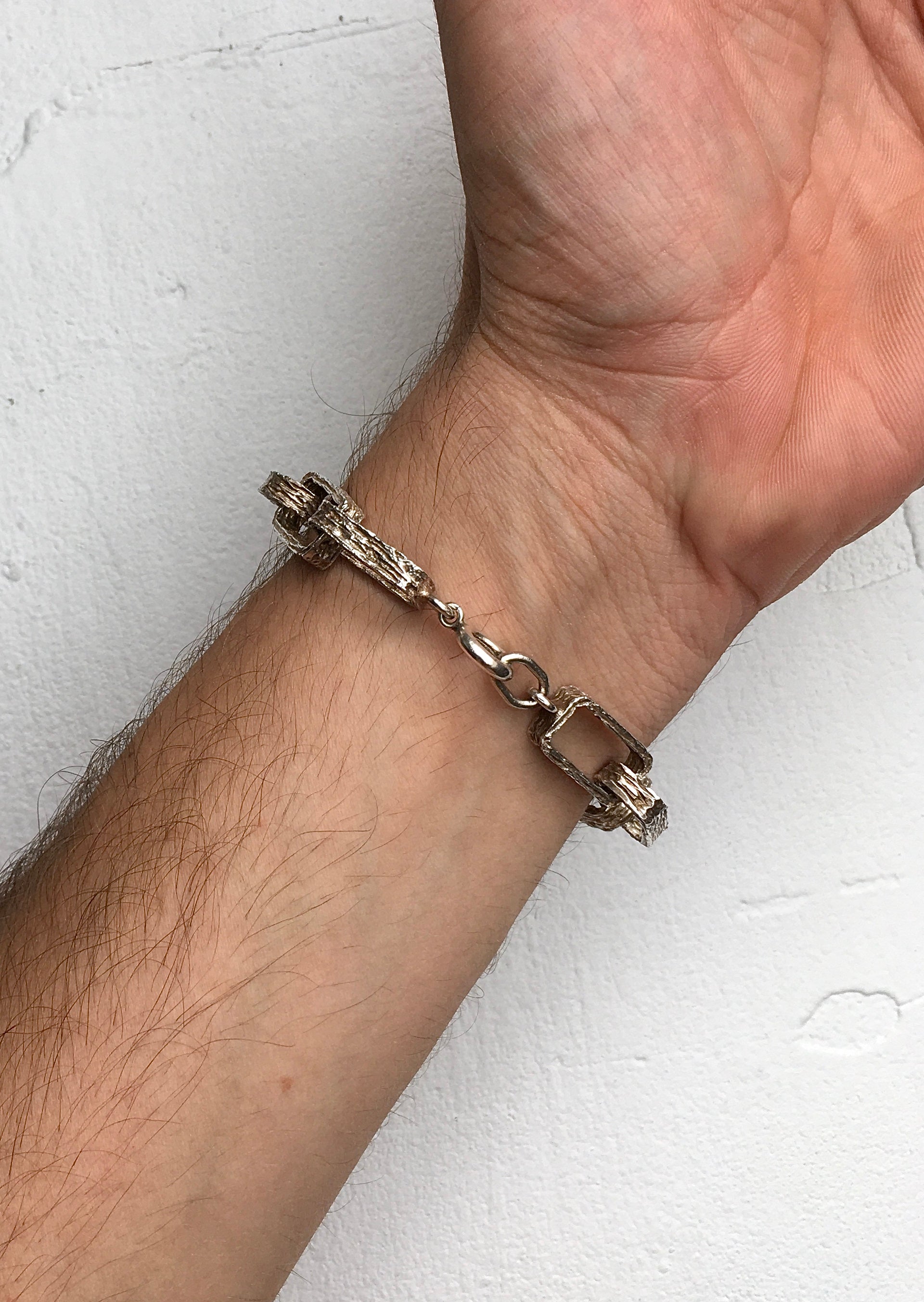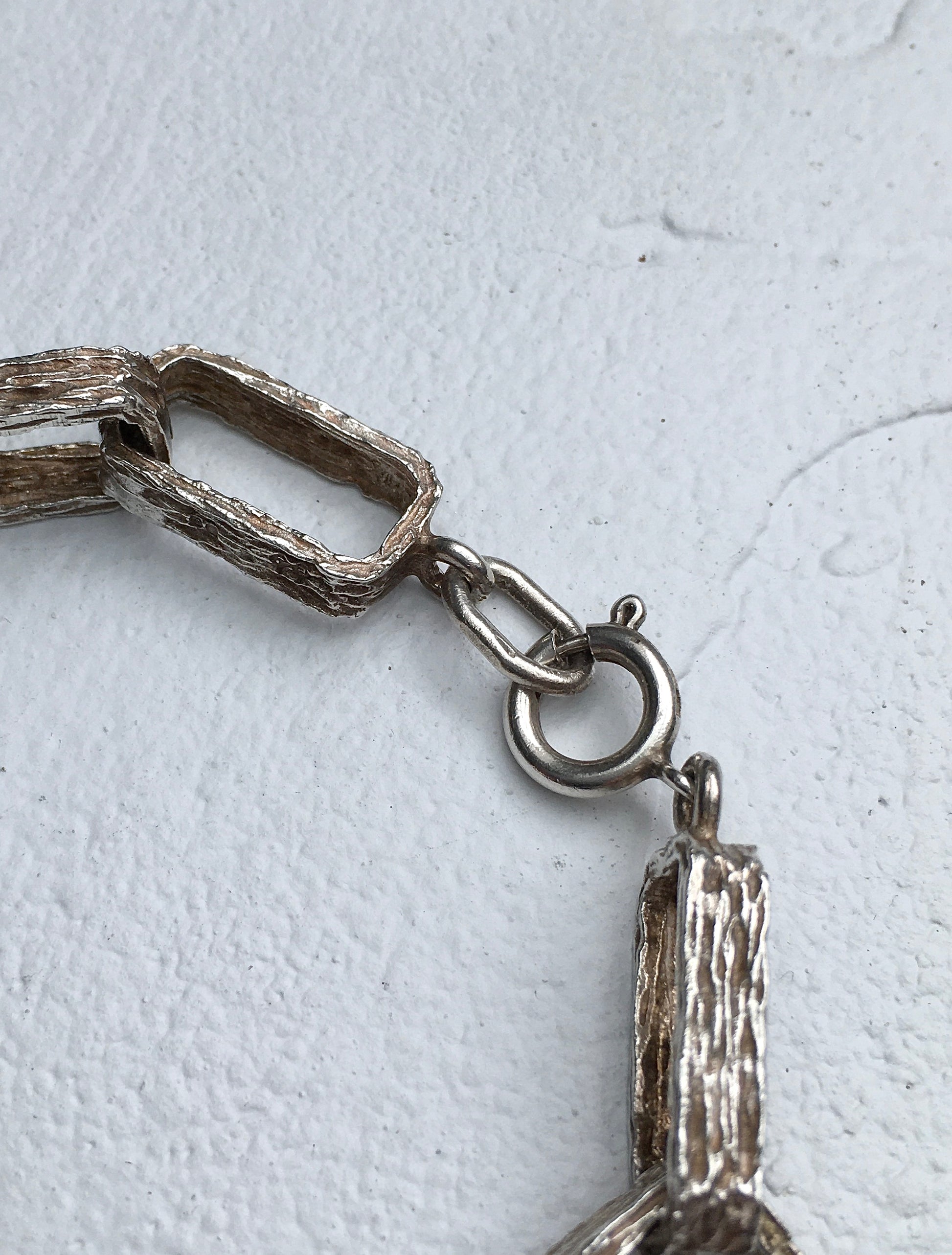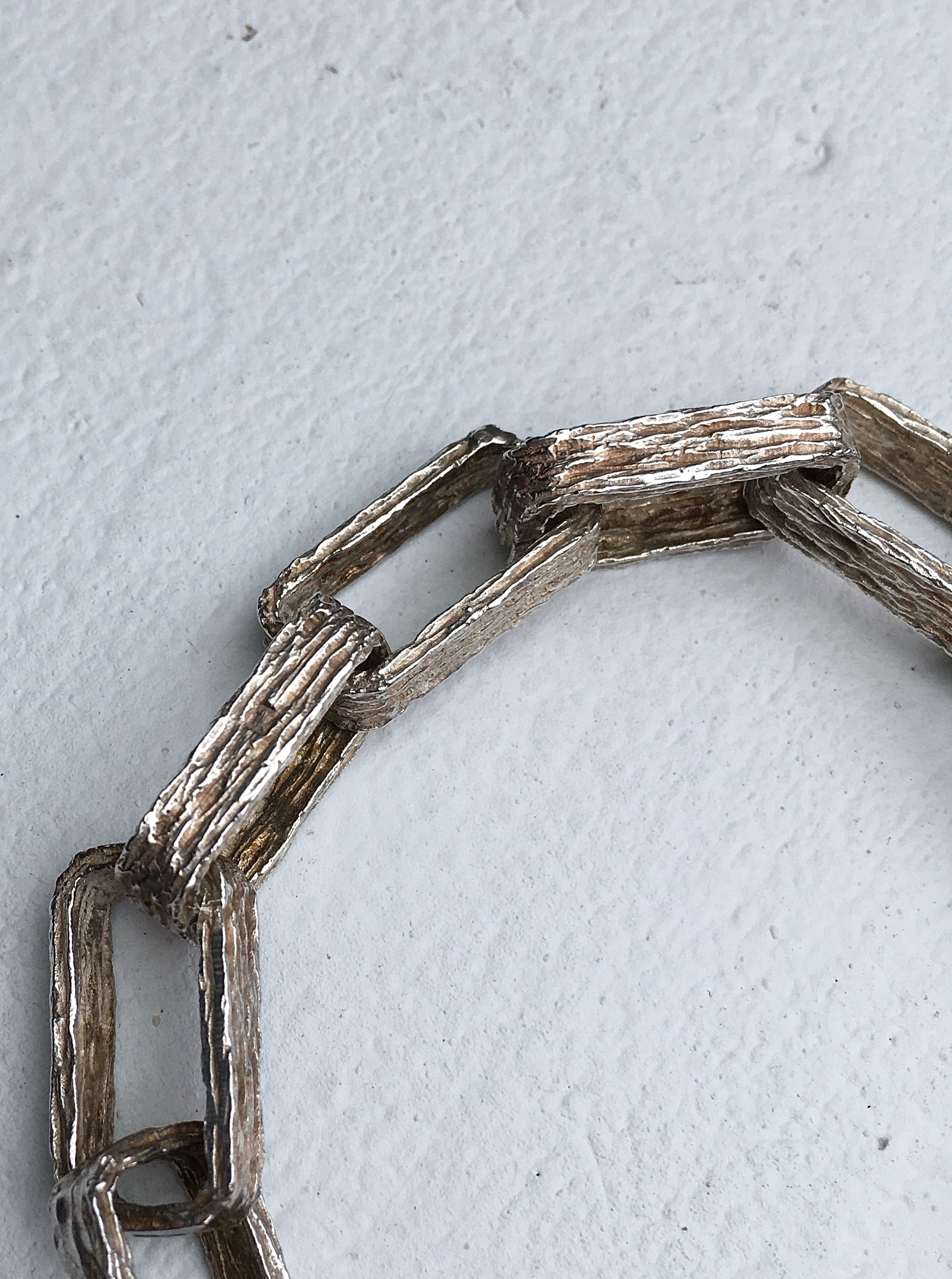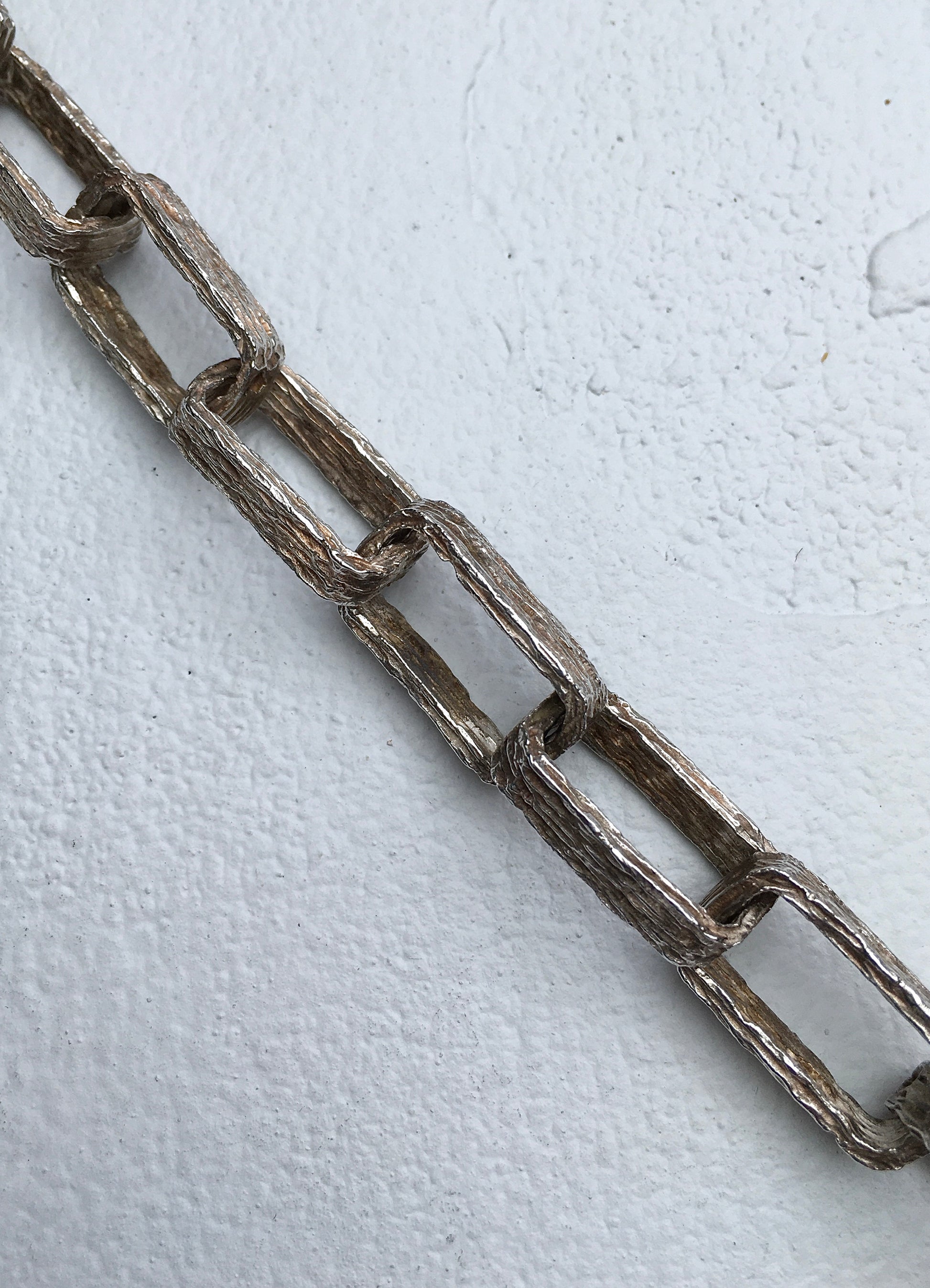 Obscured by the piece’s naturalistic finish are British hallmarks. A number of links are stamped with England’s ‘Walking Lion’ while an end link bears a maker’s mark of ‘BJ’ and assay marks for London 1973