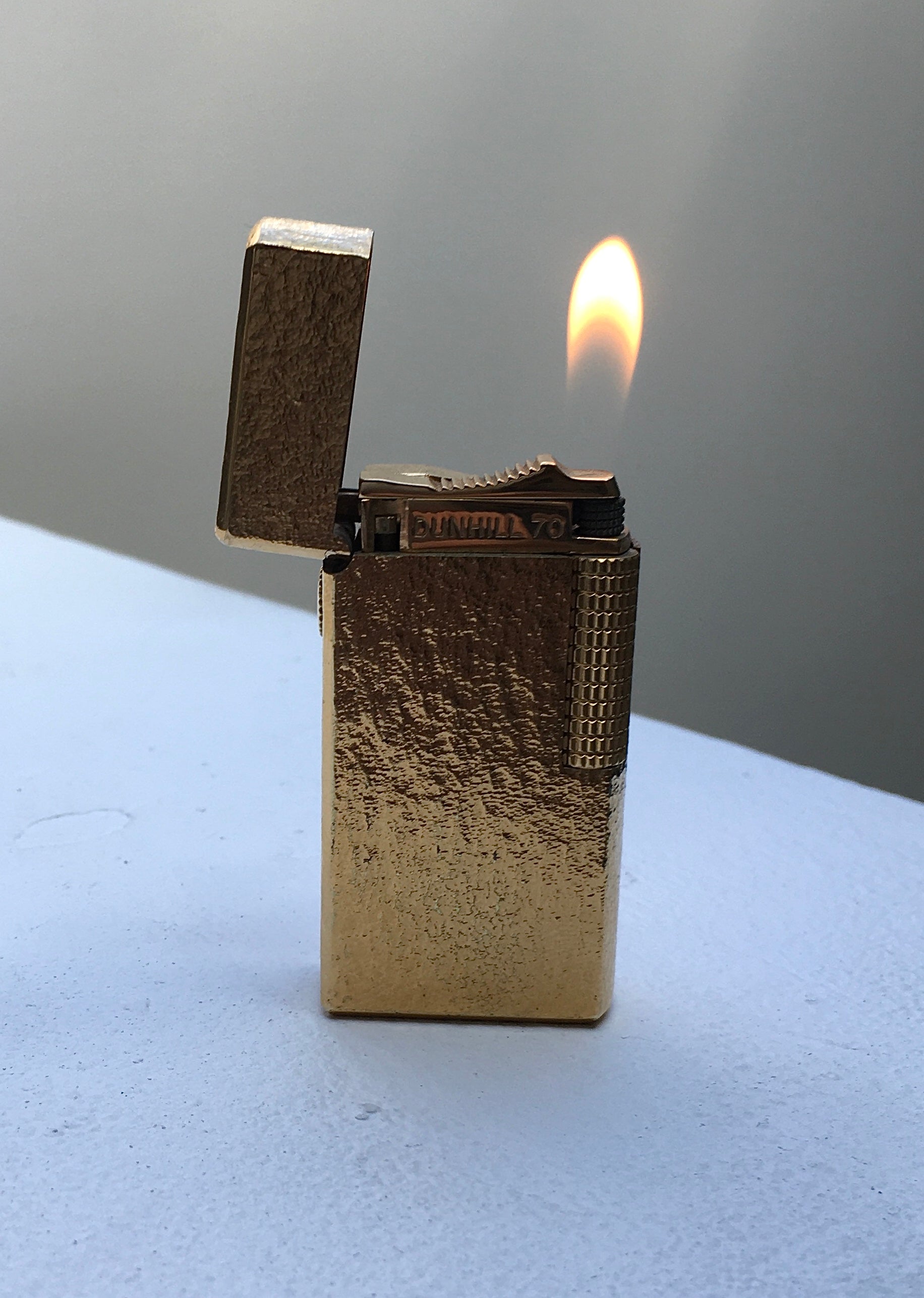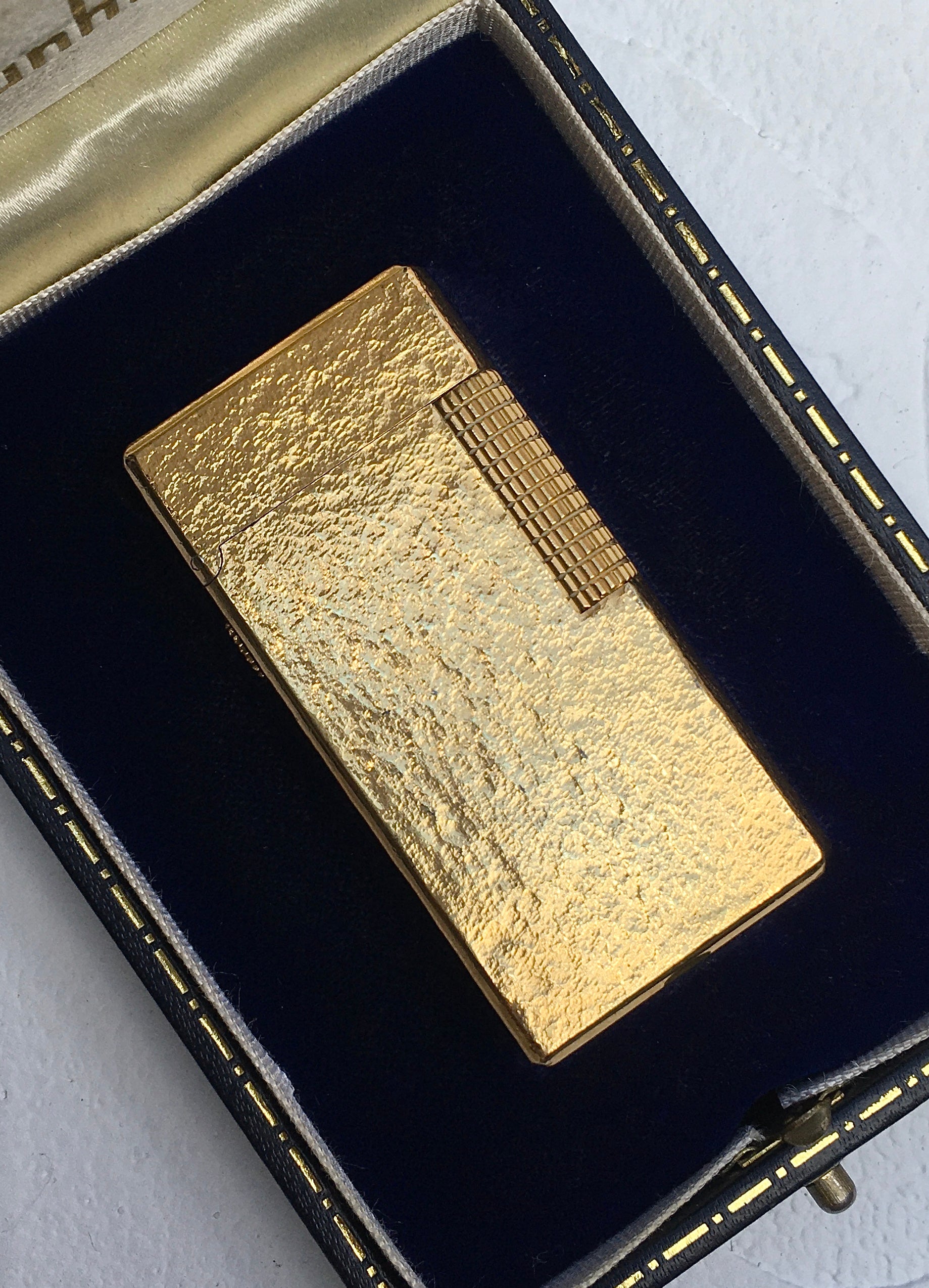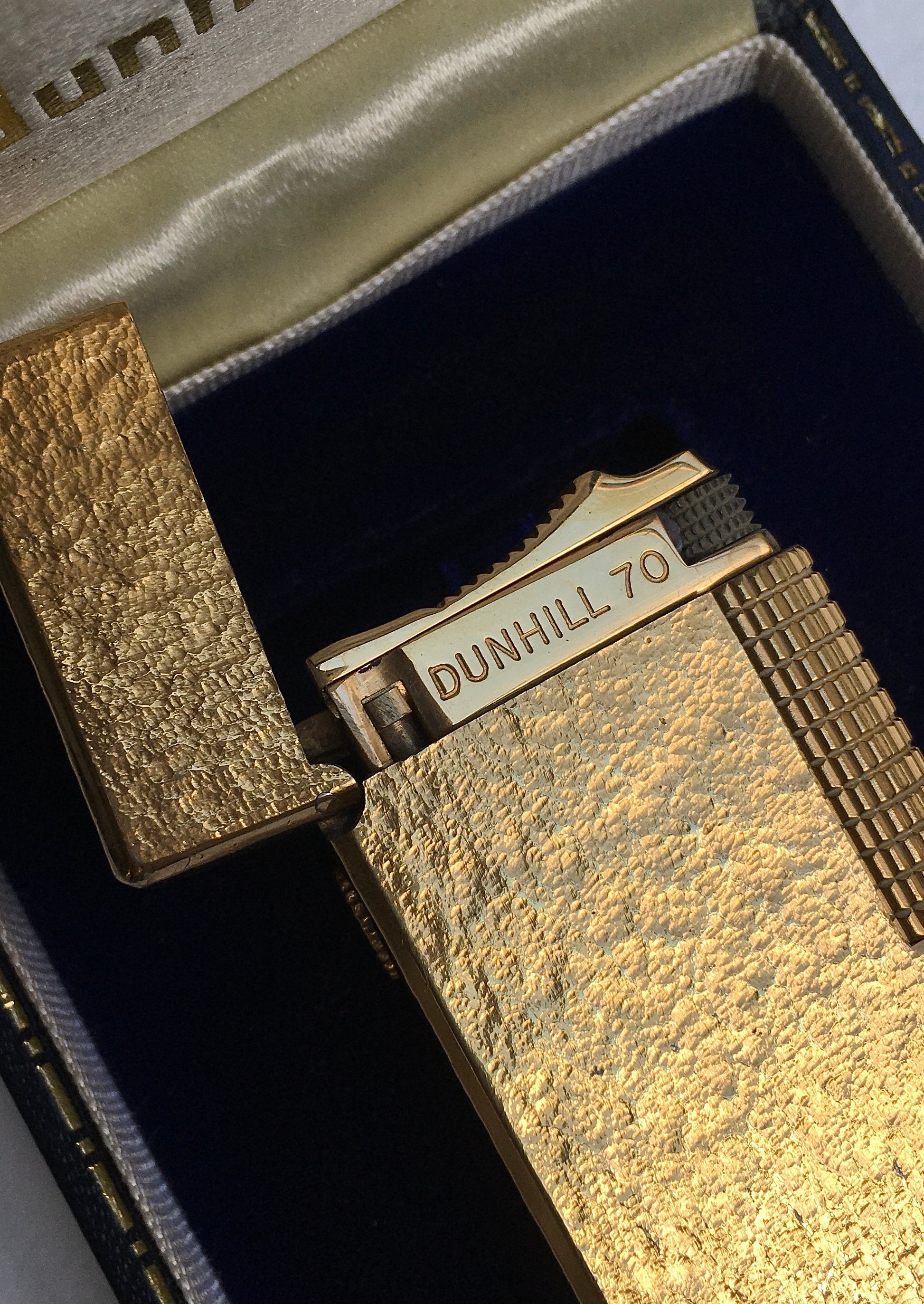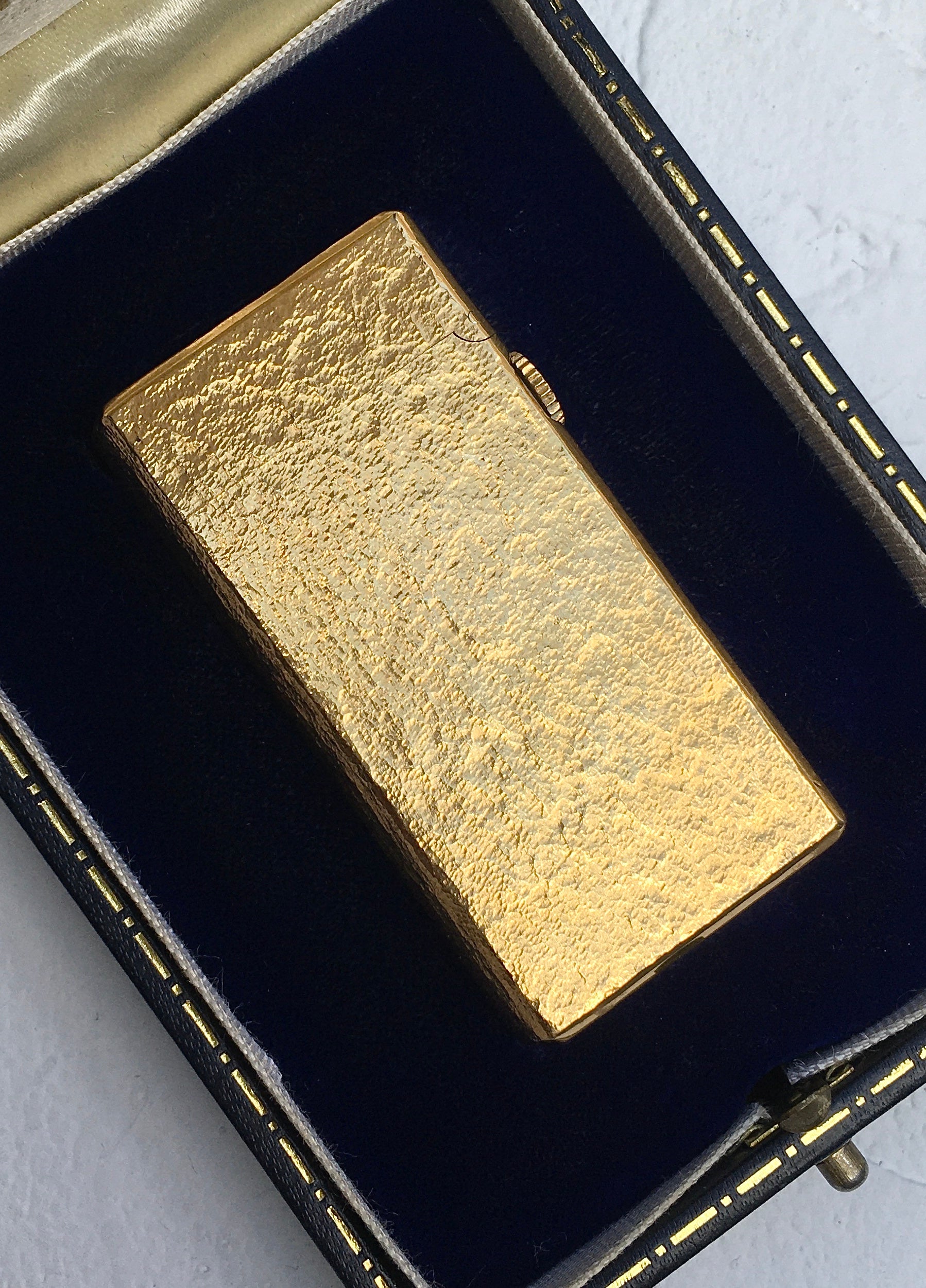 A proper British made piece is this c.1970 18k gold plated ‘bark’ finish Dunhill 70 butane lighter