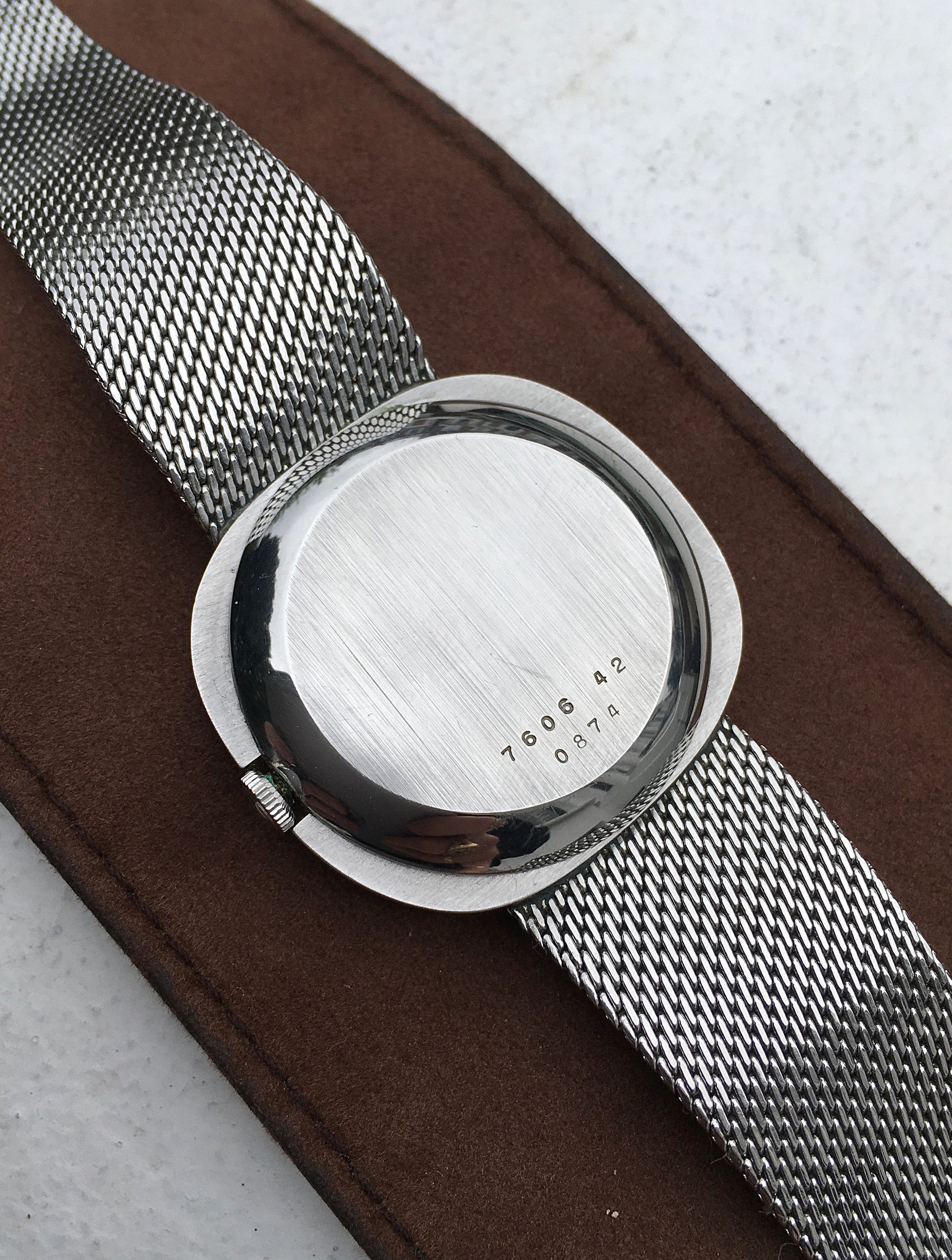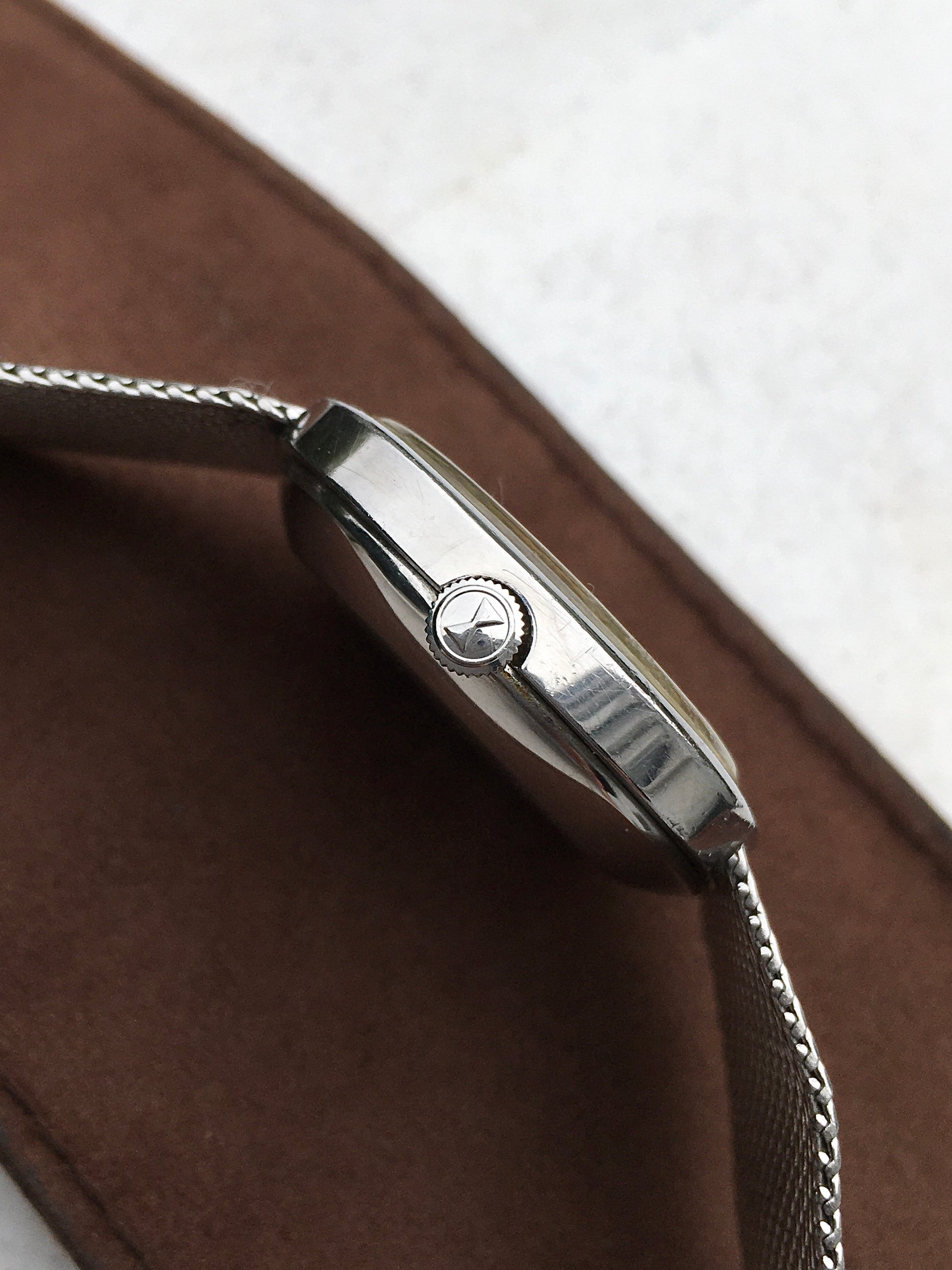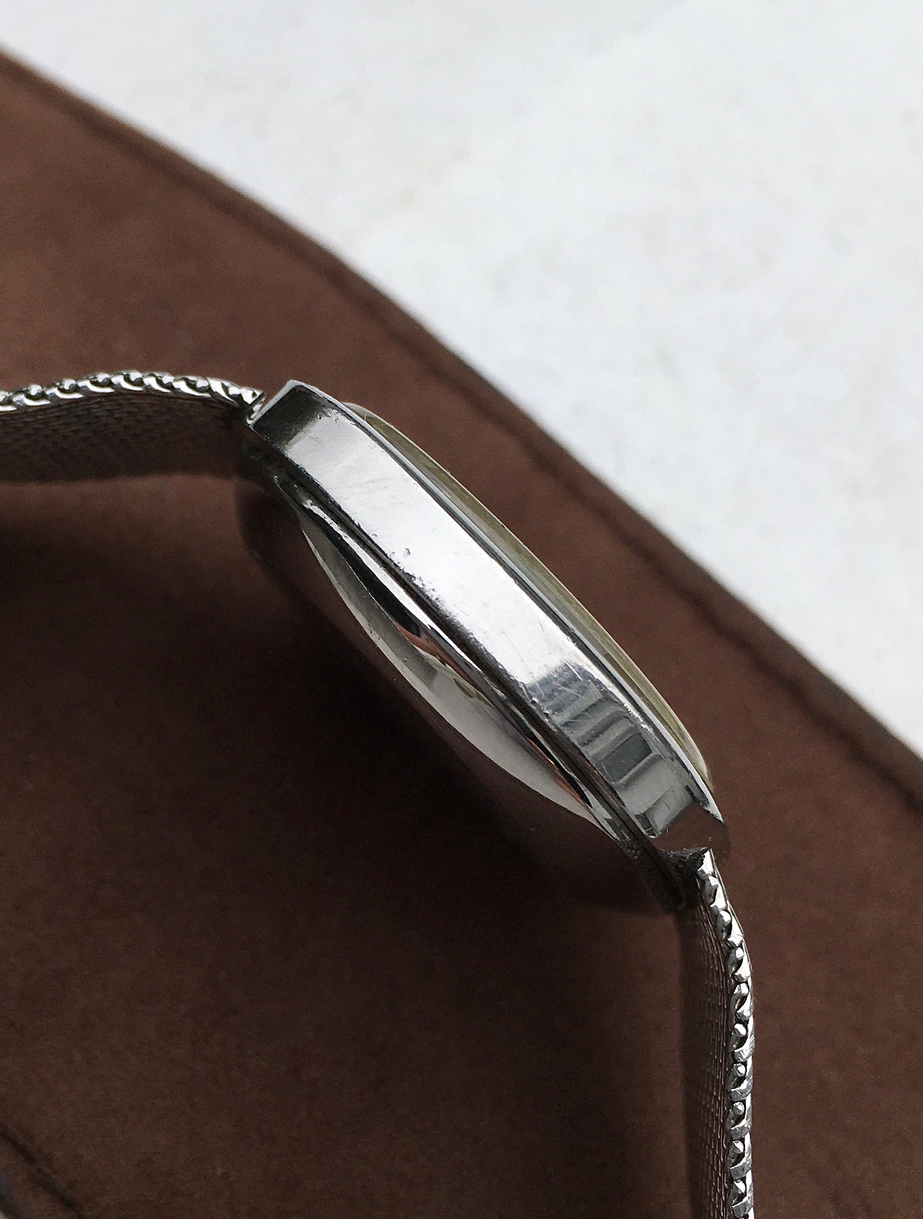 The polished stainless steel case remains in good condition, as does the brushed case back