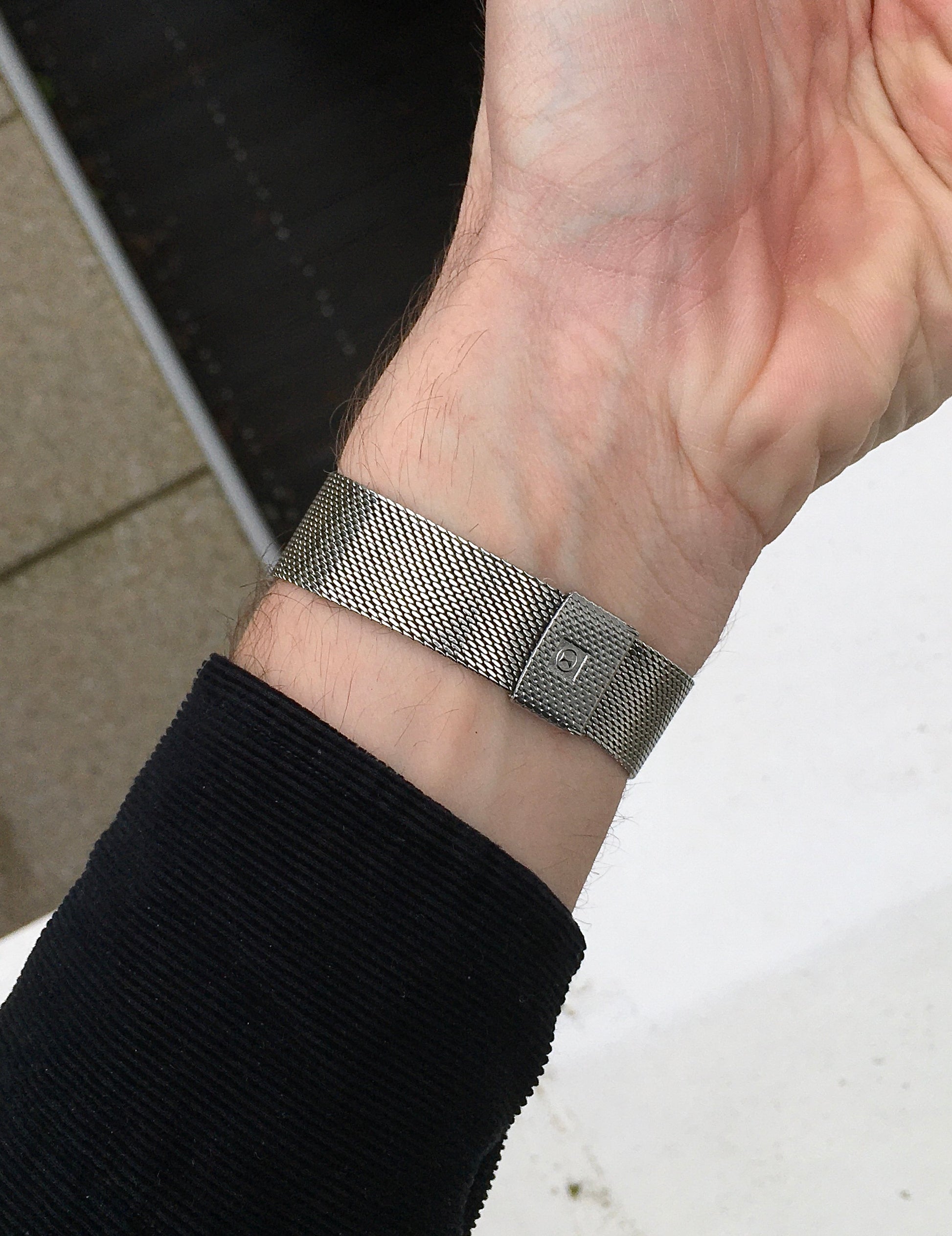 The fully adjustable integrated Milanese mesh bracelet remains in excellent shape and is fastened by a folding clasp bearing the brand’s logo and finished to mimic the bracelet