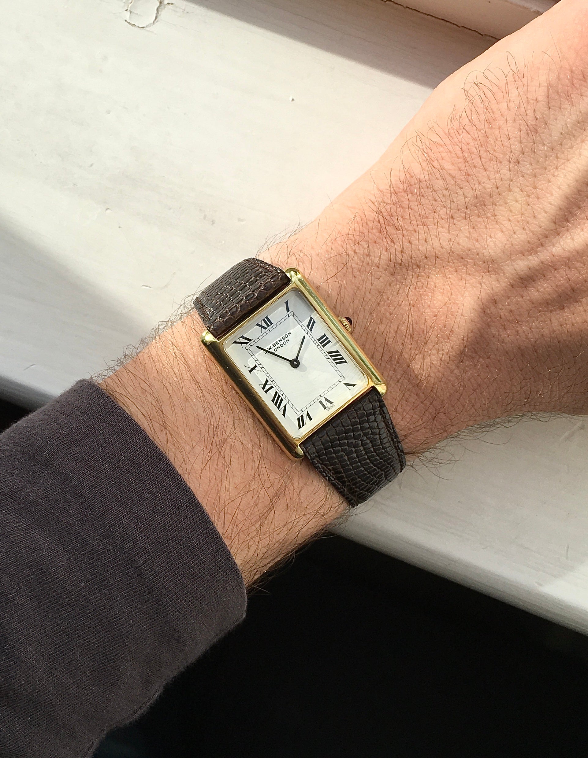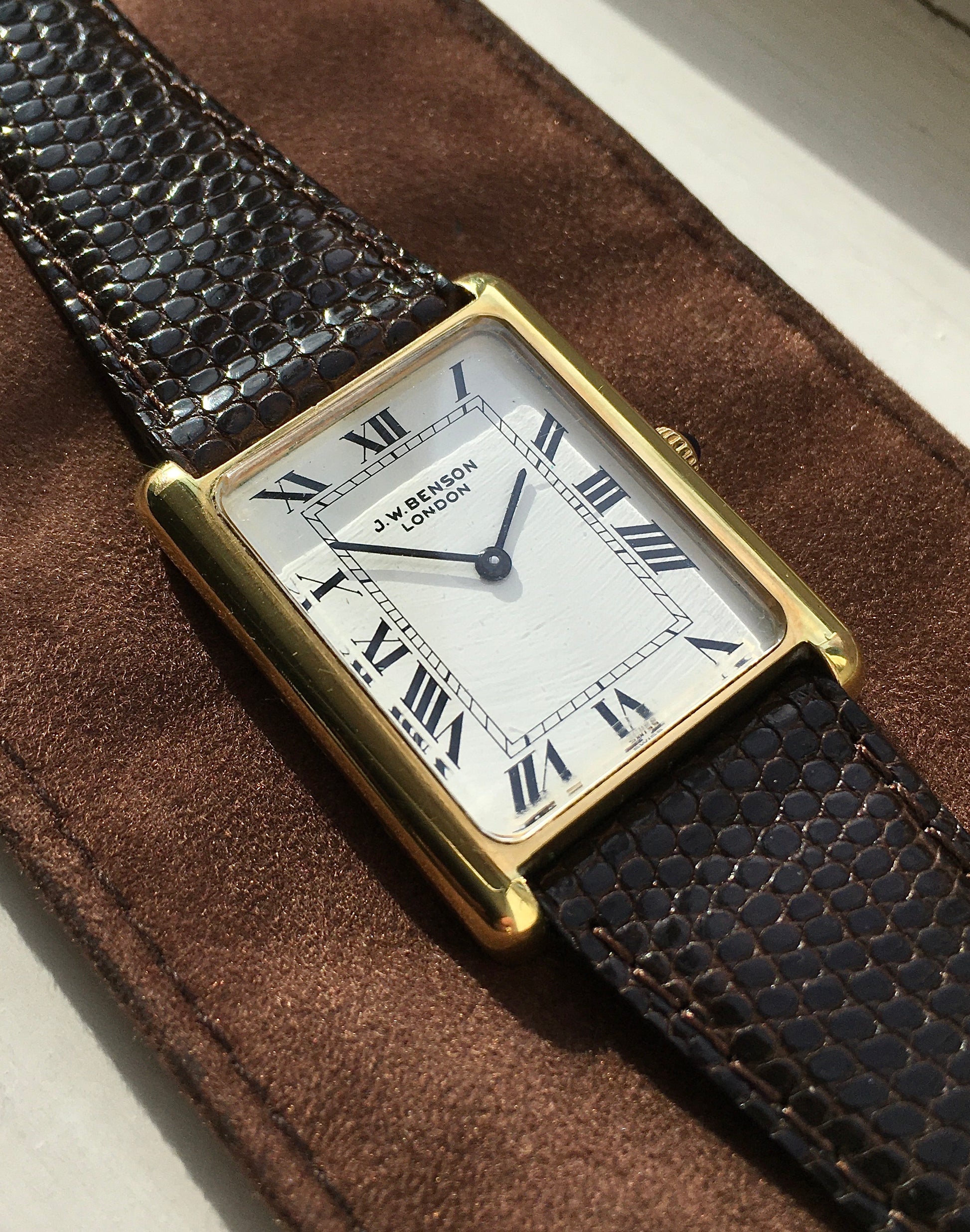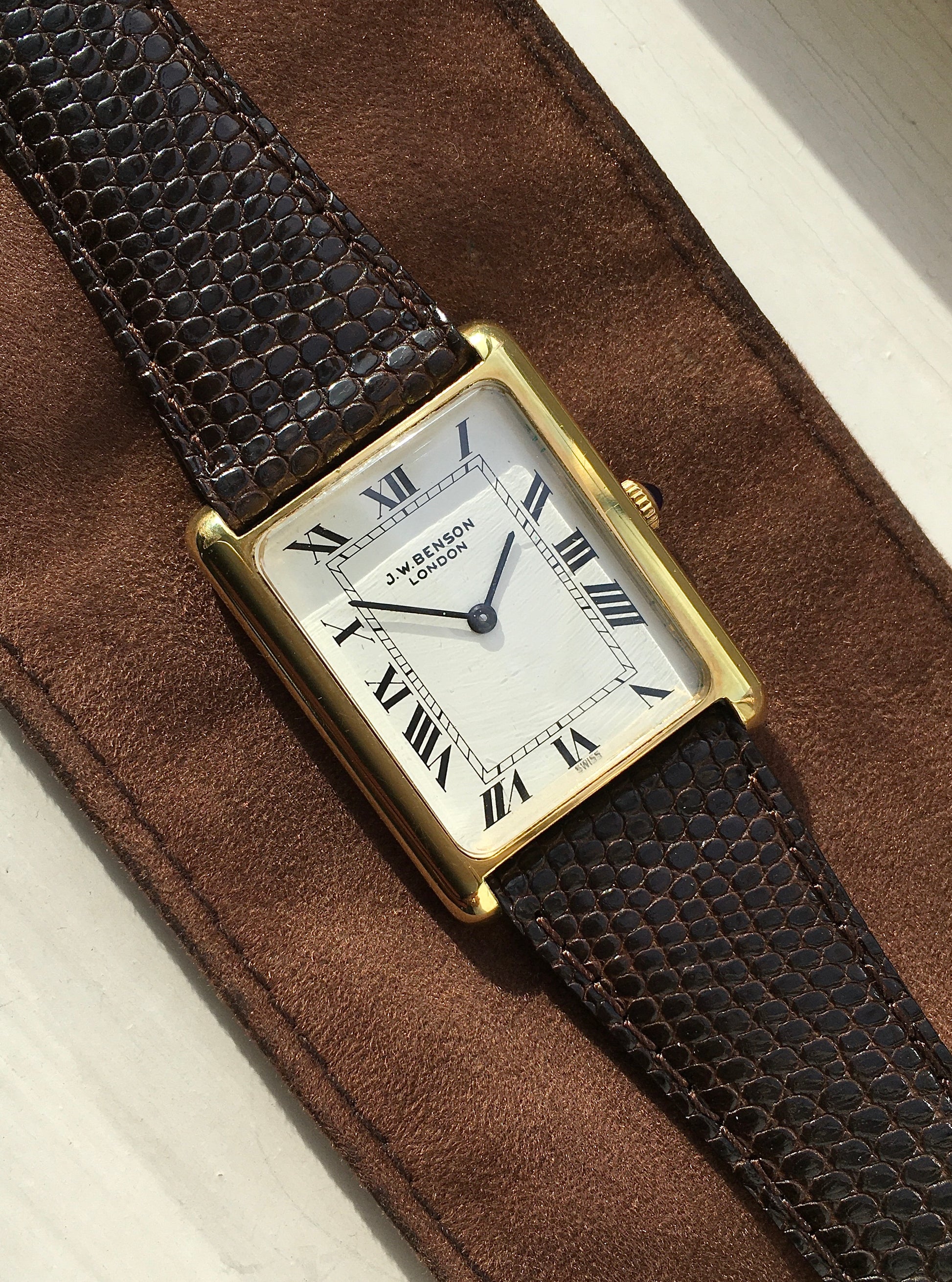 The classic white dial is decorated with black Roman numerals, black baton hands, a minute track and ‘J.W. Benson London’ at 12