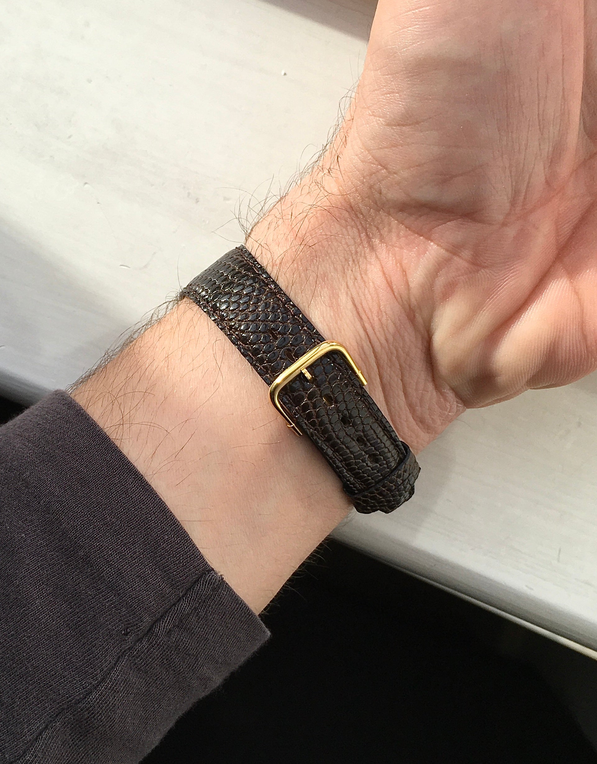Fitted is a tasteful NOS vintage brown genuine lizard skin strap presented in excellent condition
