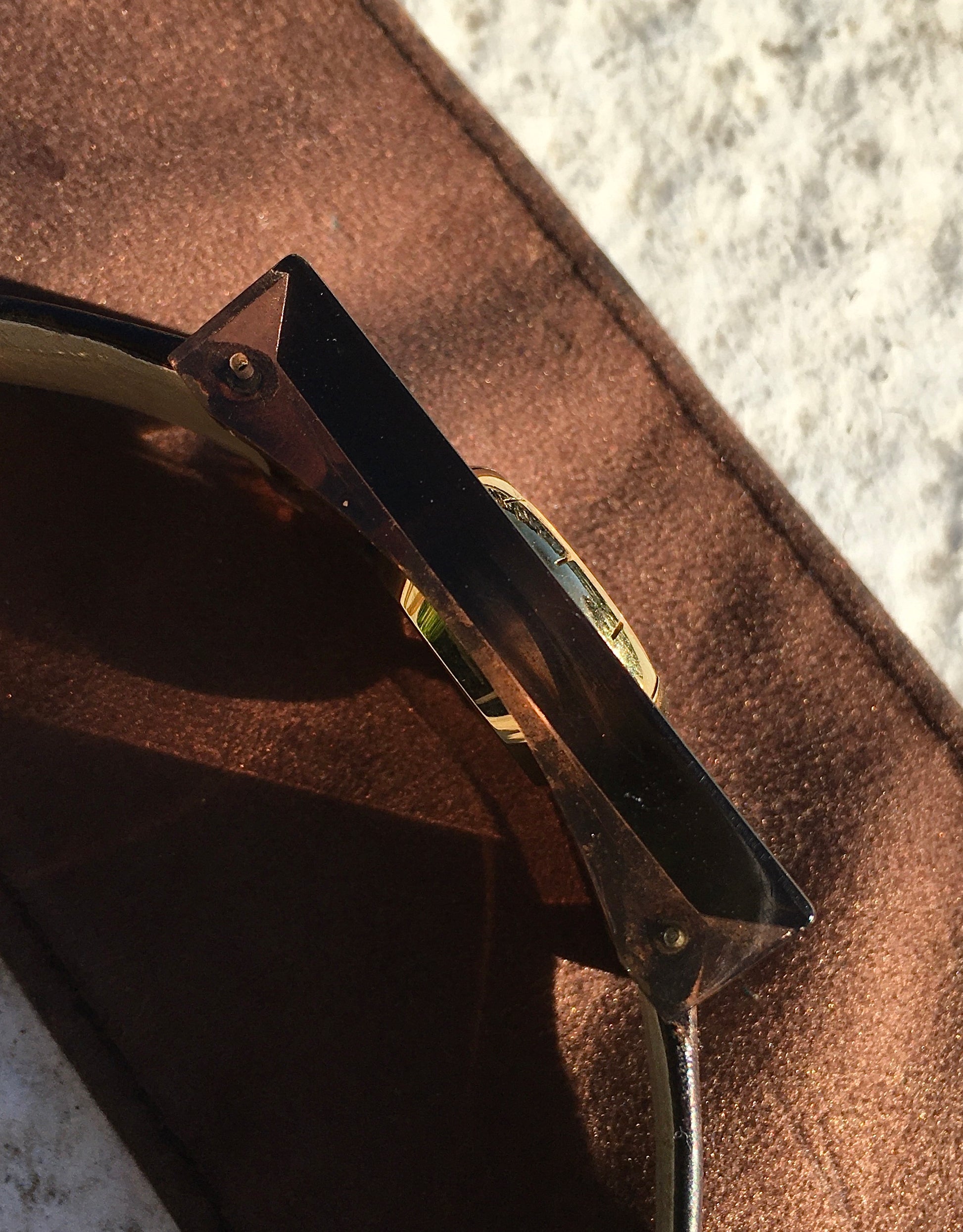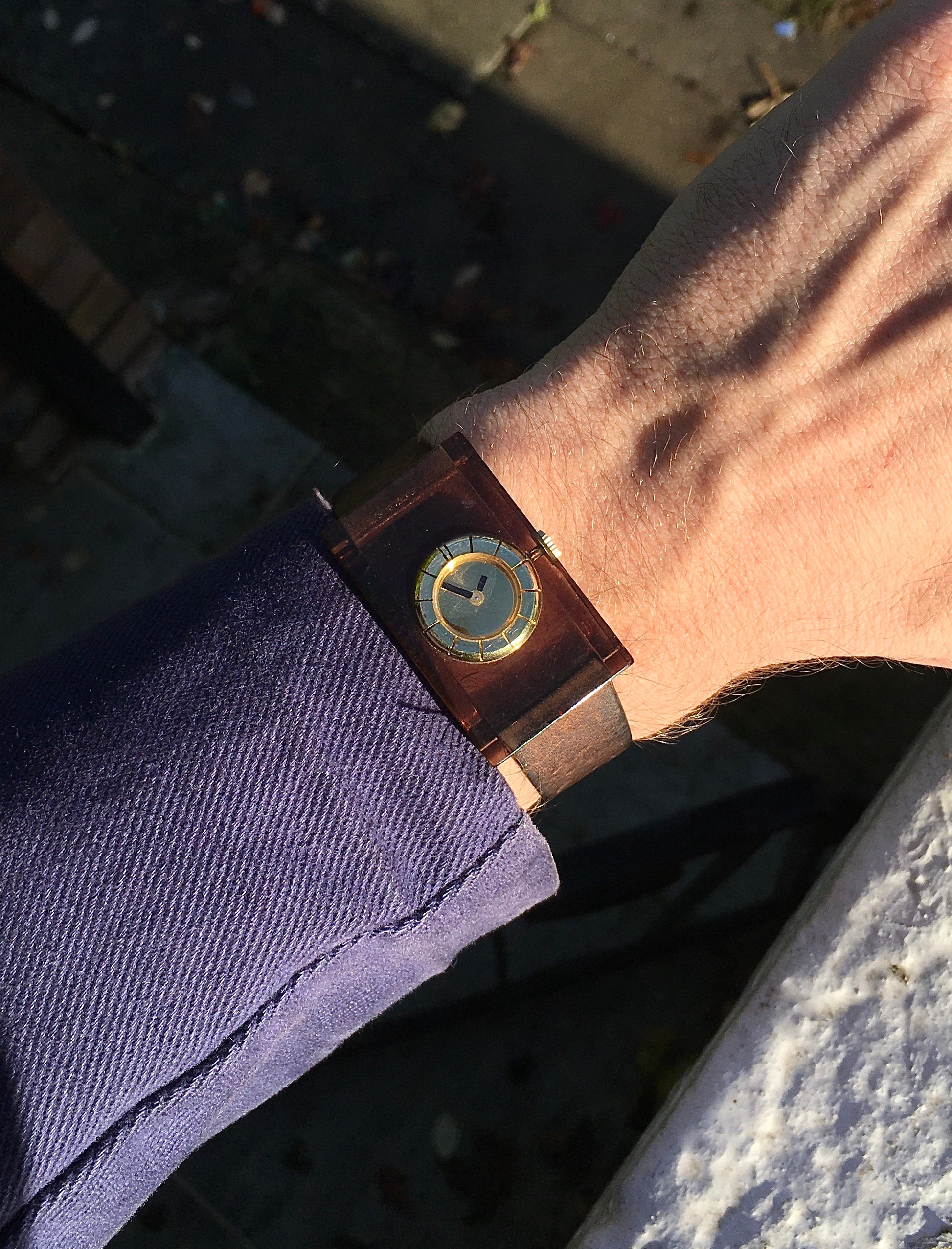 The unique coffee brown translucent lucite case remains in very nice condition with only slight surface wear. Very comfortable on the wrist partly due to its ‘curvex’ underside