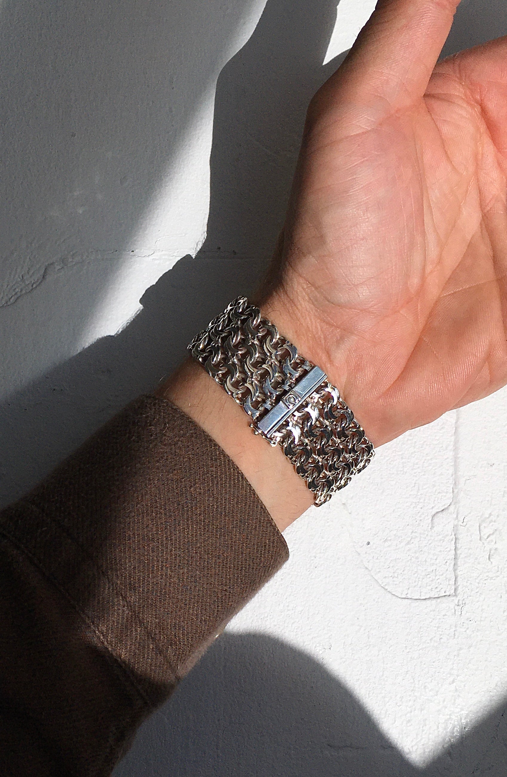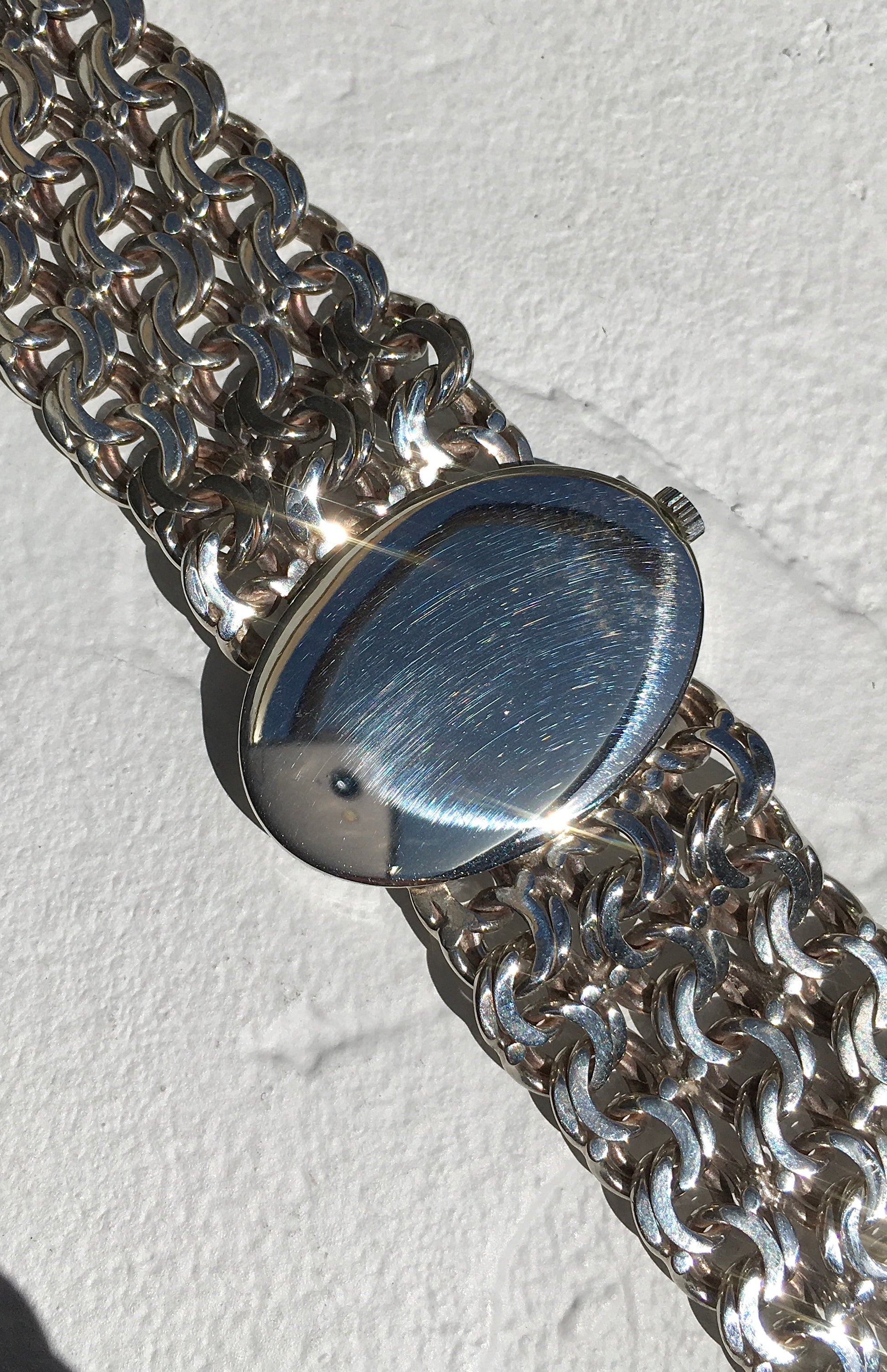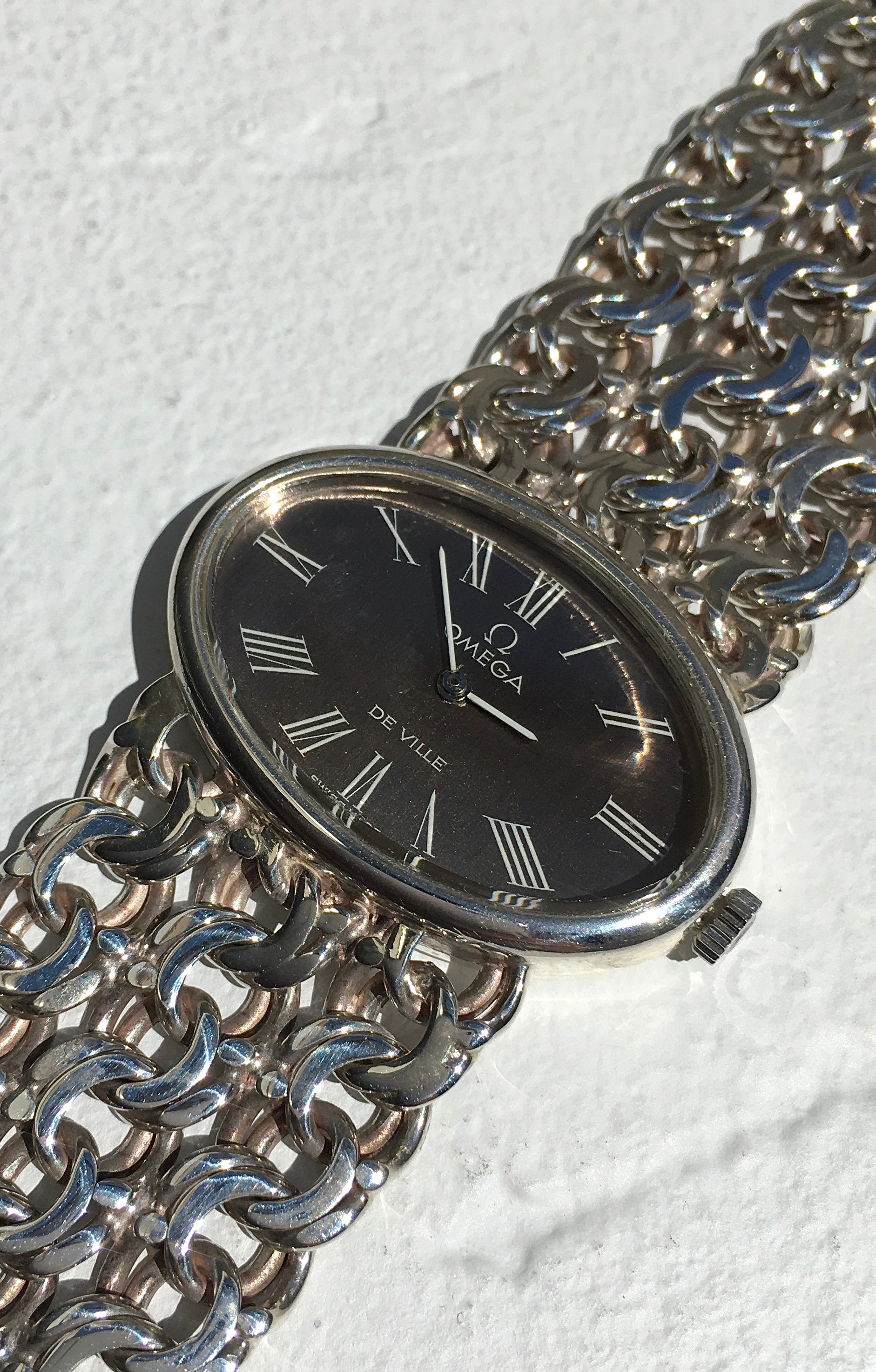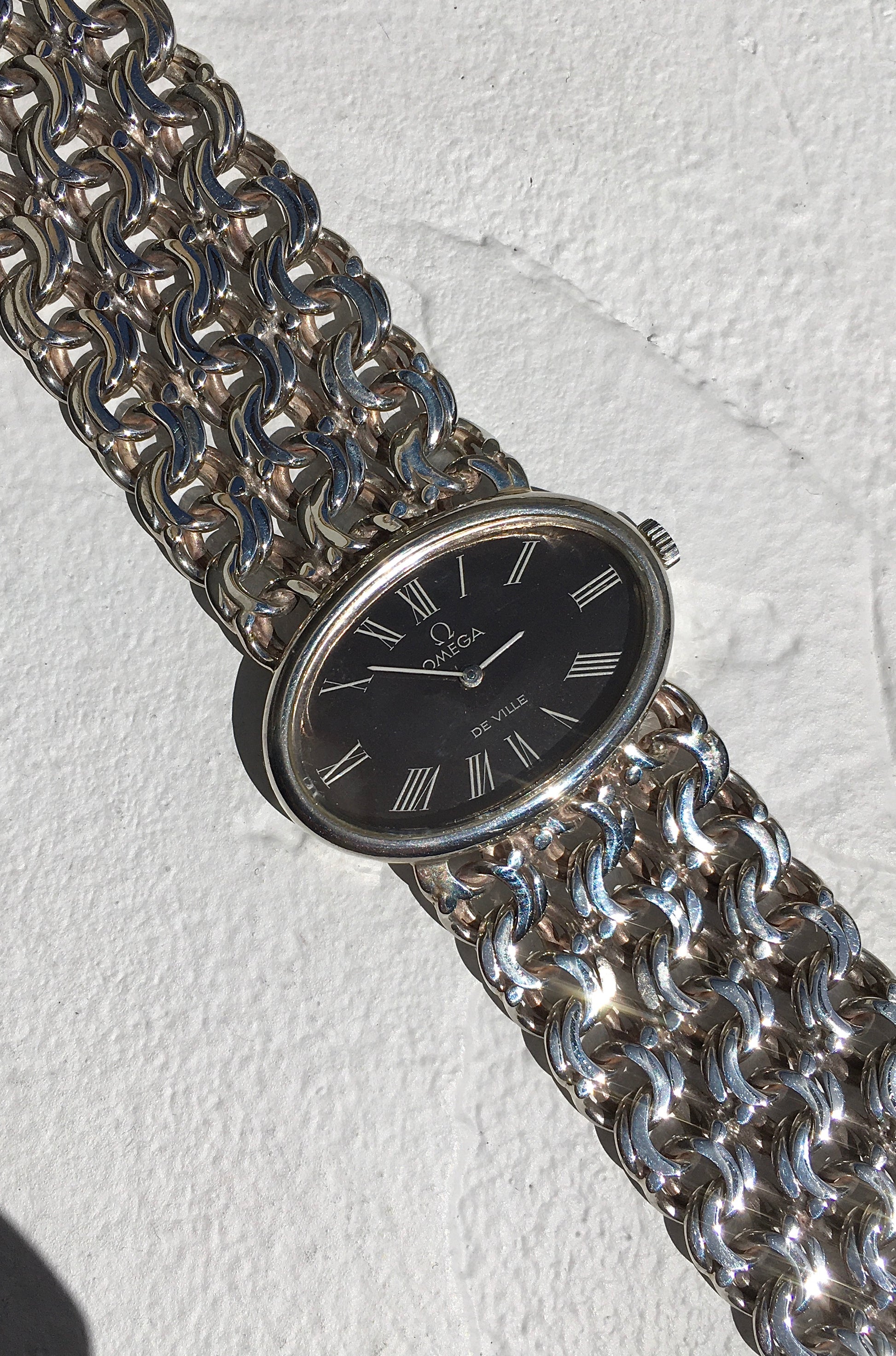 The intricate integrated multi/fancy link bracelet is in wonderful condition and without signs of stretching. It’s fastened securely by an Omega signed and clearly hallmarked sliding barrel clasp