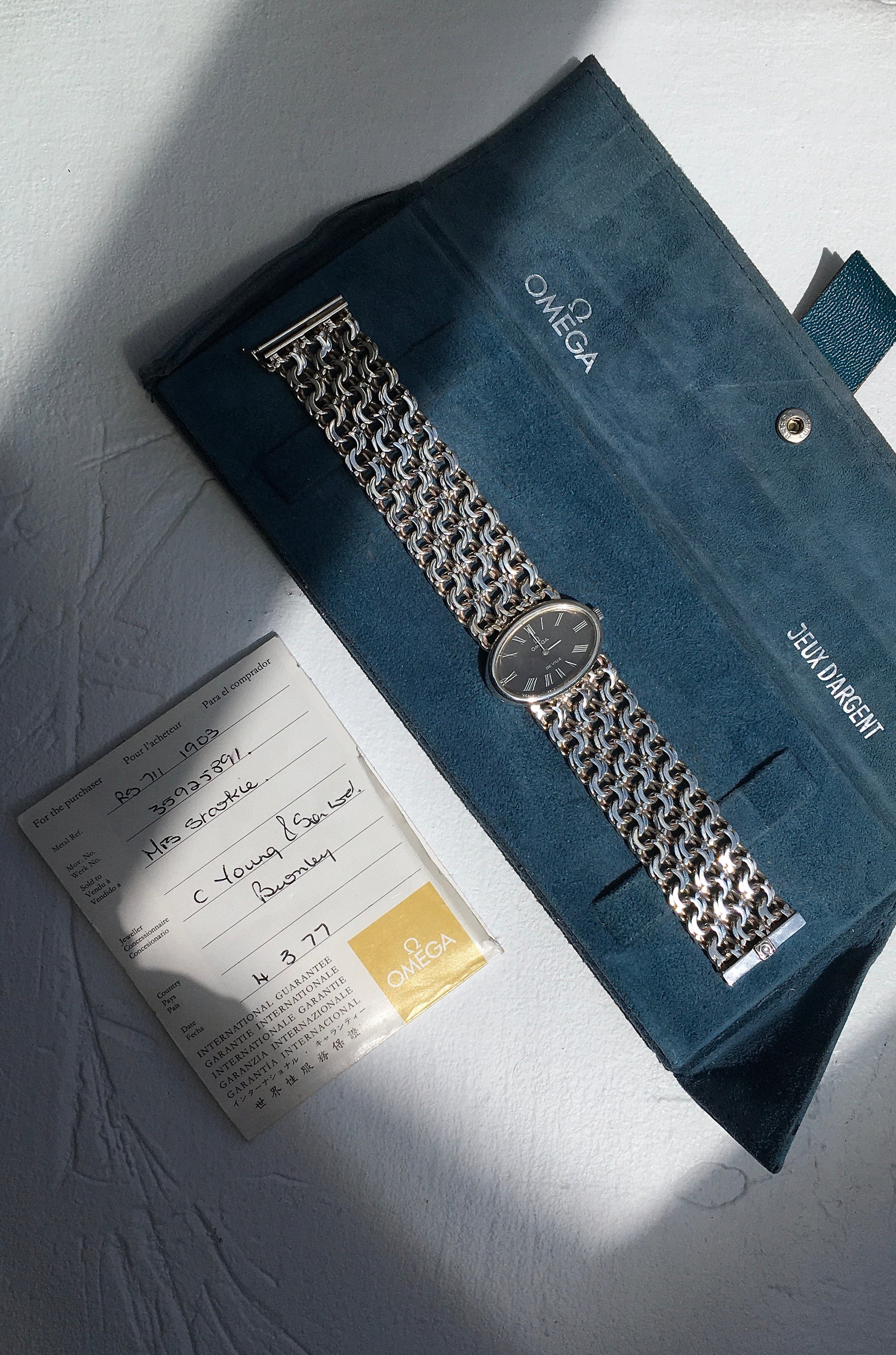 The watch is presented alongside its original suede Jeux d’Argent sleeve (now as much a collector’s piece as the watch) and international guarantee showing a date of purchase as March 1977