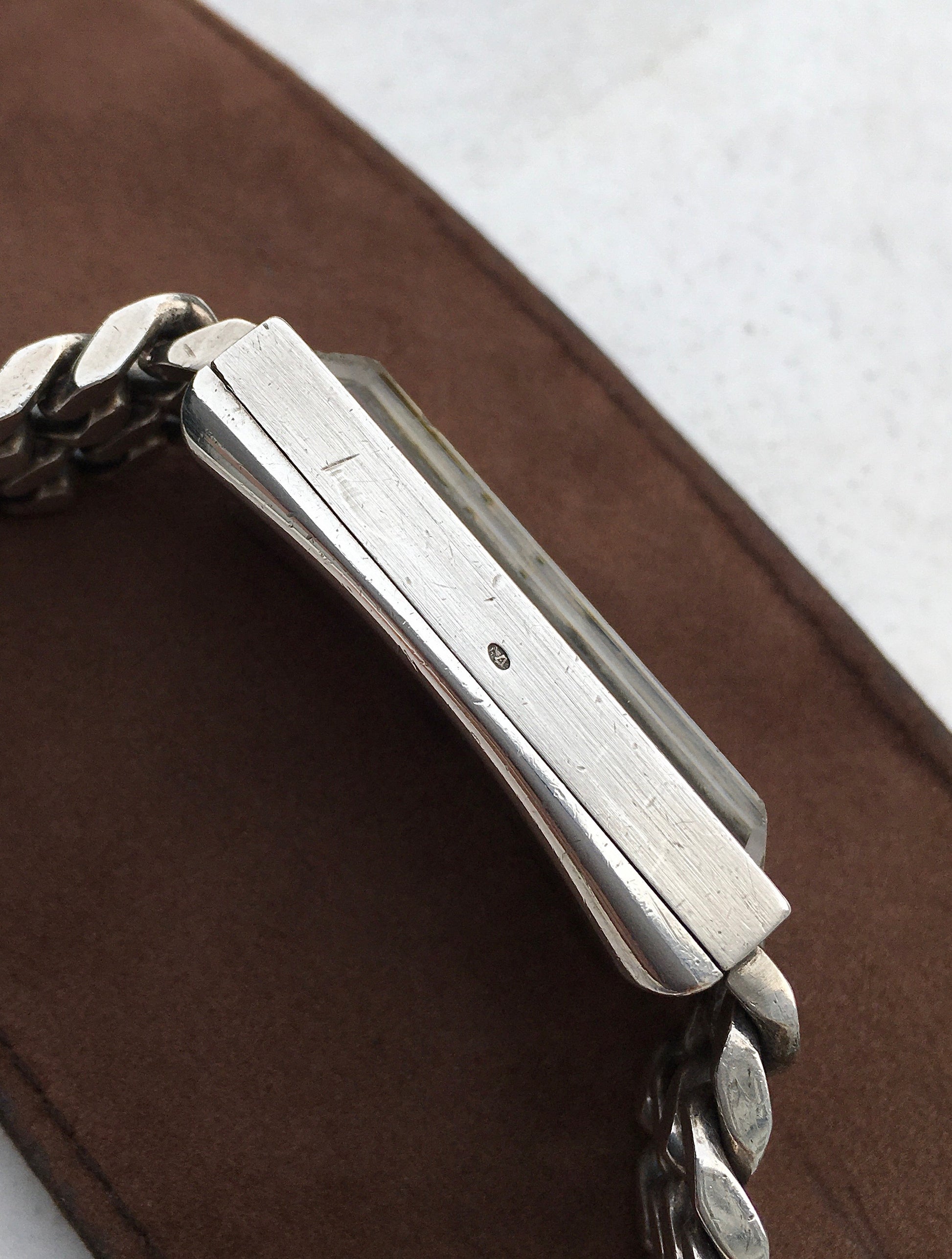 The solid sterling silver ‘allongée’ case is in excellent condition and is stamped to the outside at 9 o’clock with the Gentian flower, Switzerland’s hallmark for sterling silver