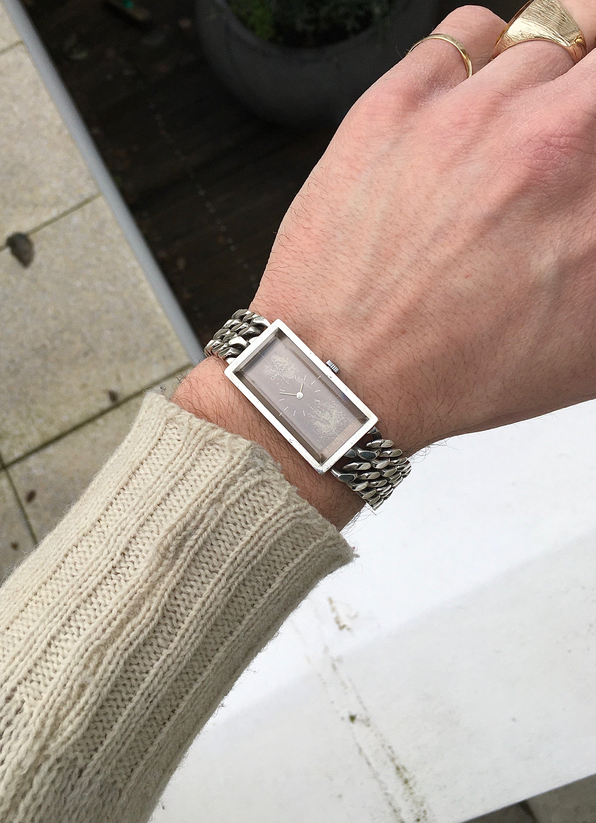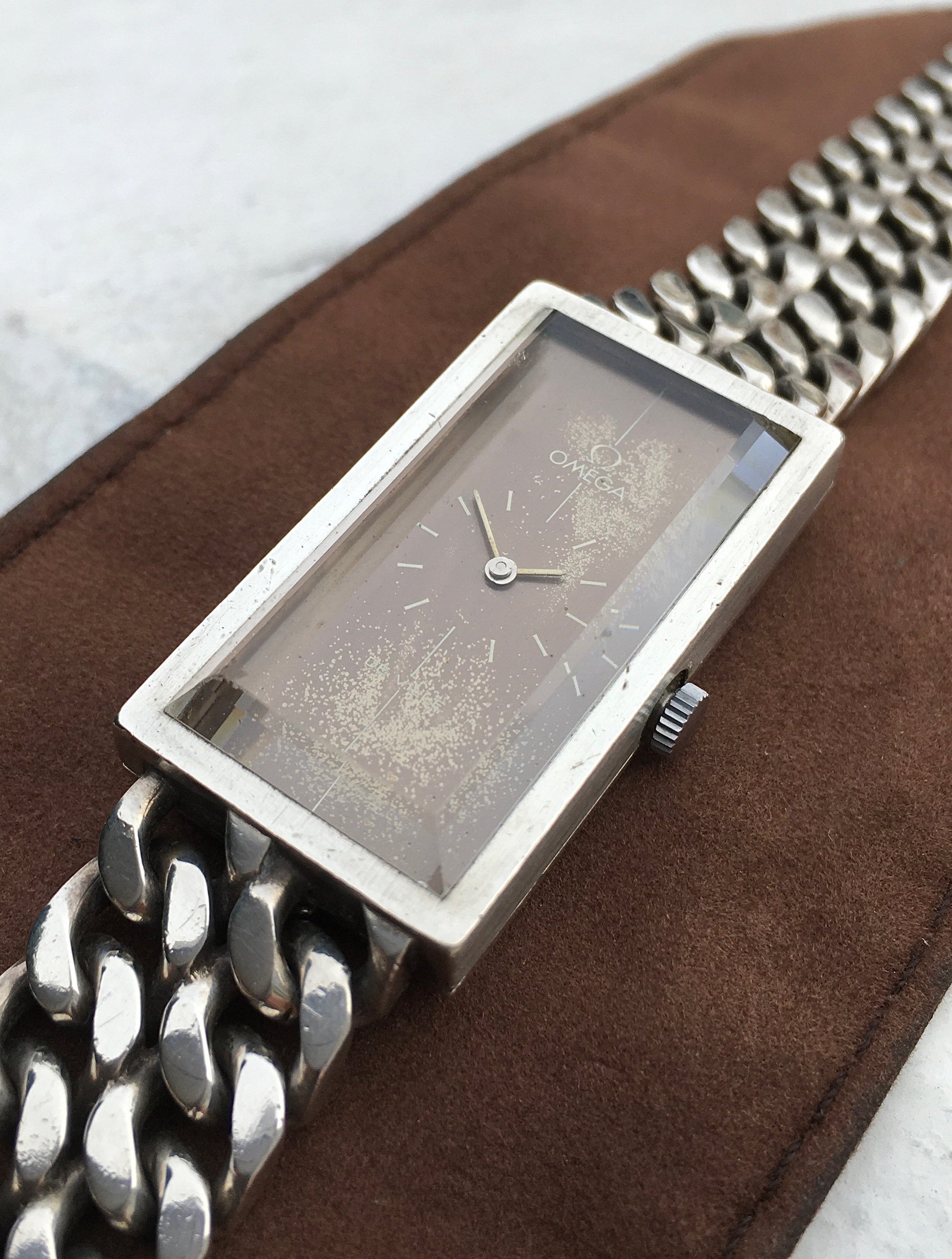 The intricate integrated double curb link bracelet is in wonderful condition and without signs of stretching. It’s fastened securely by an Omega signed and clearly hallmarked sliding barrel clasp