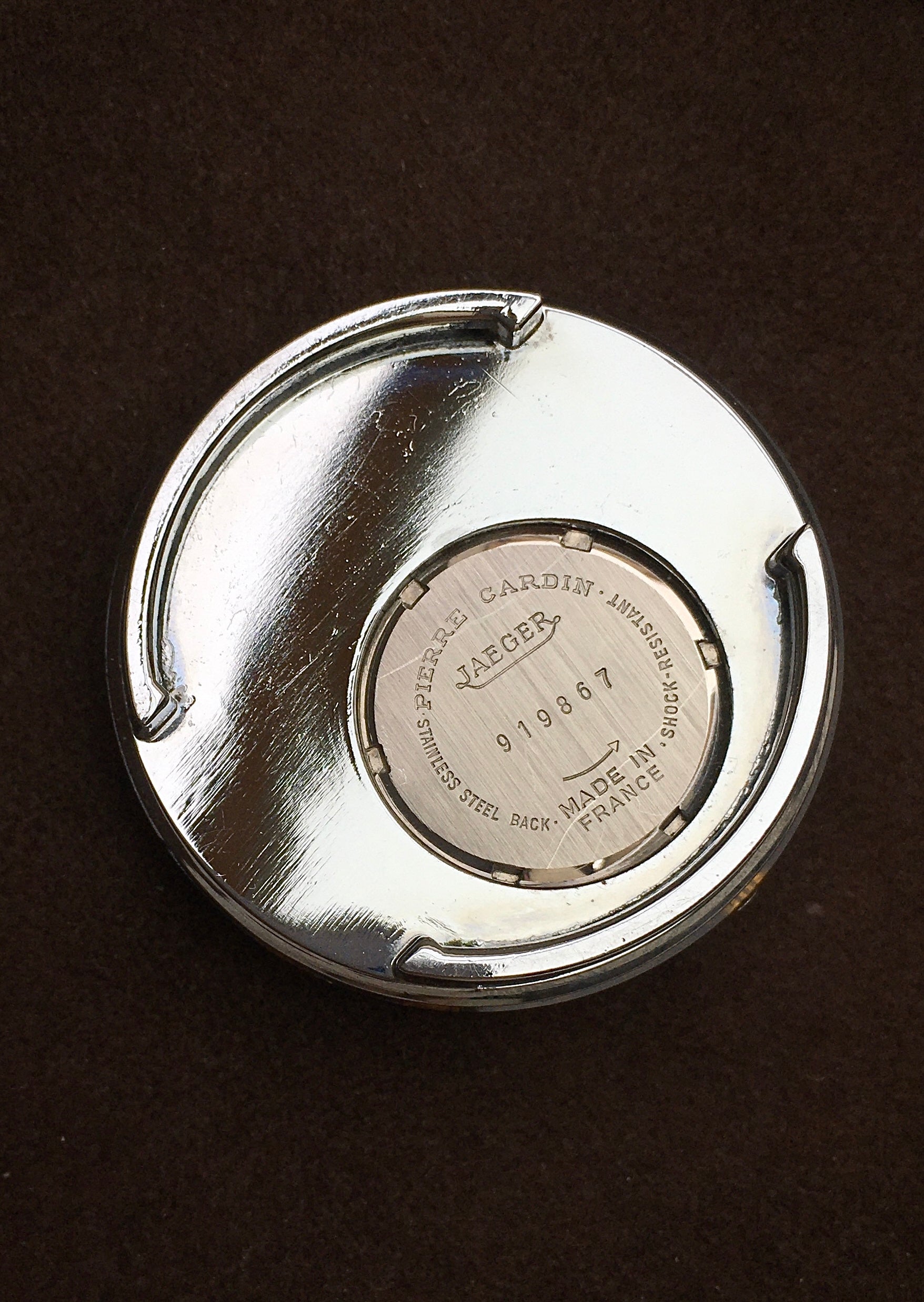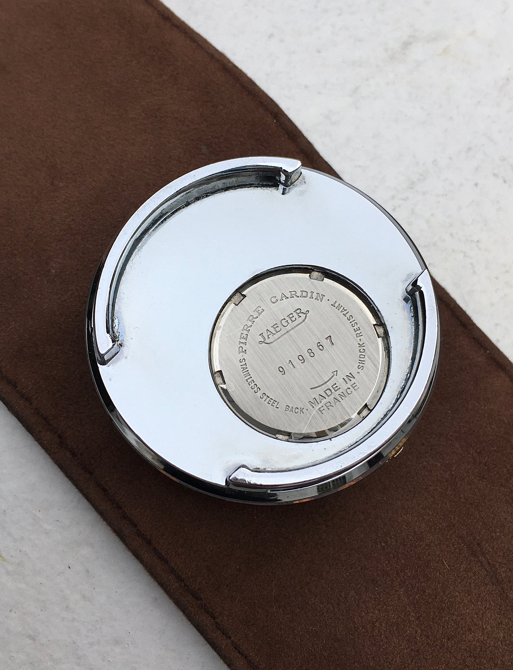 The case-back features fixed lugs and is clearly stamped ‘Jaeger’ alongside ‘Pierre Cardin’