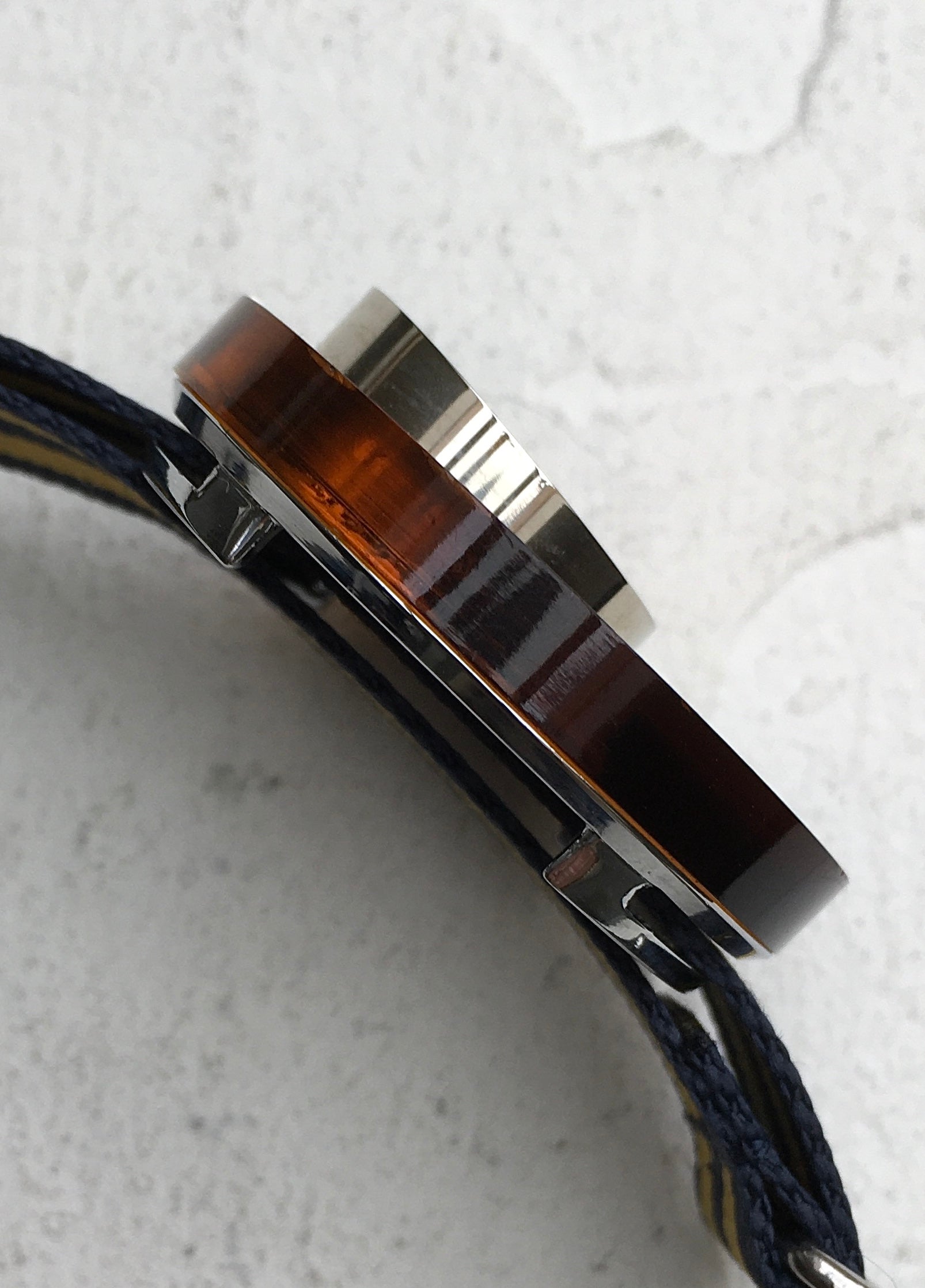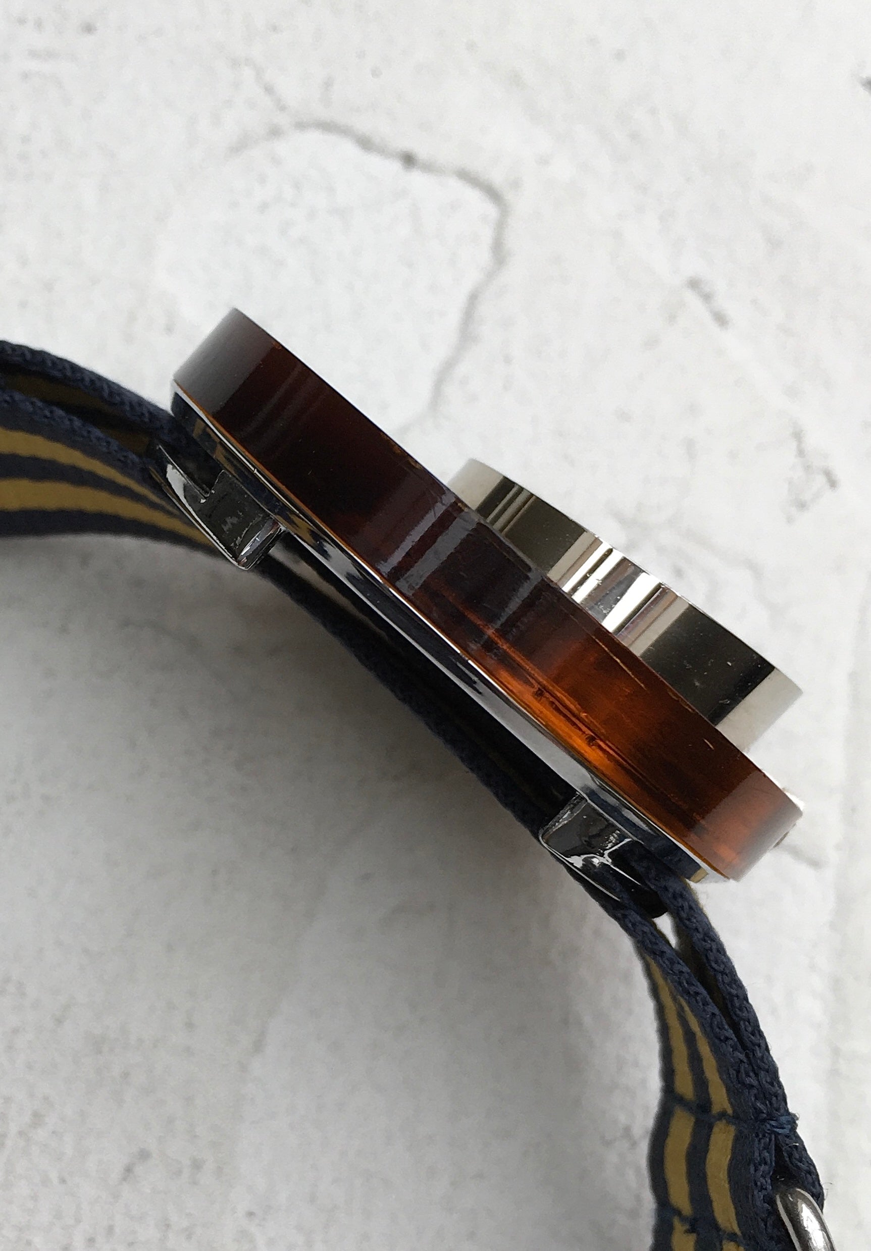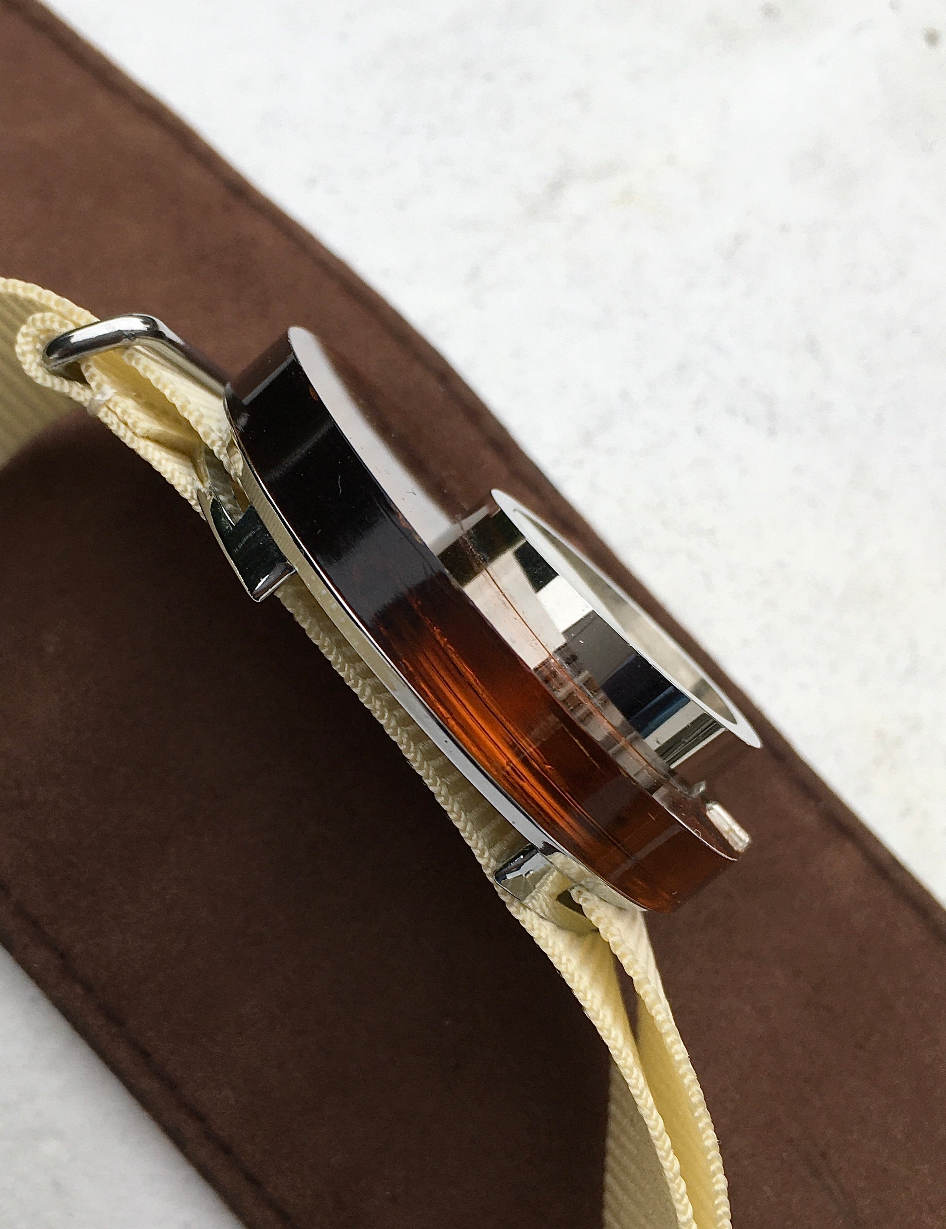 Of course the watch’s most unusual feature is the layer of orange lucite sat upon the stainless steel base. The case back can be removed and the lucite spun round and reset to expose a semi-circular portion of the base