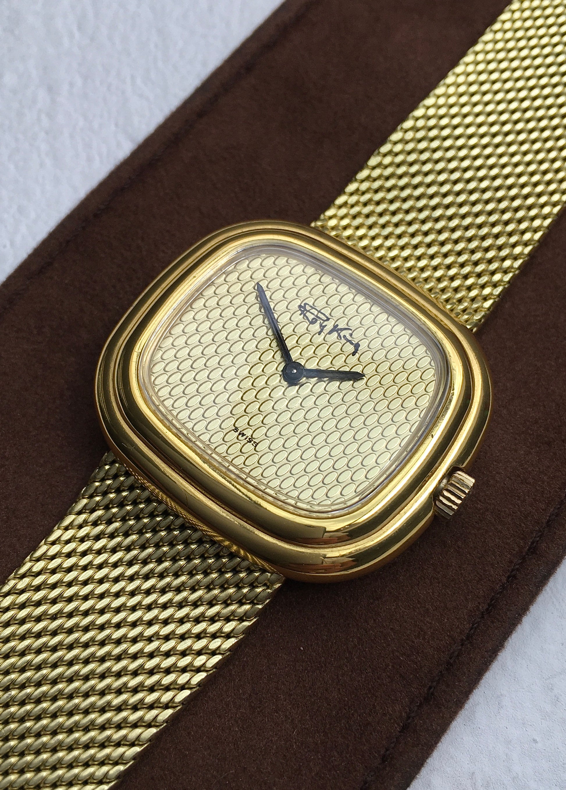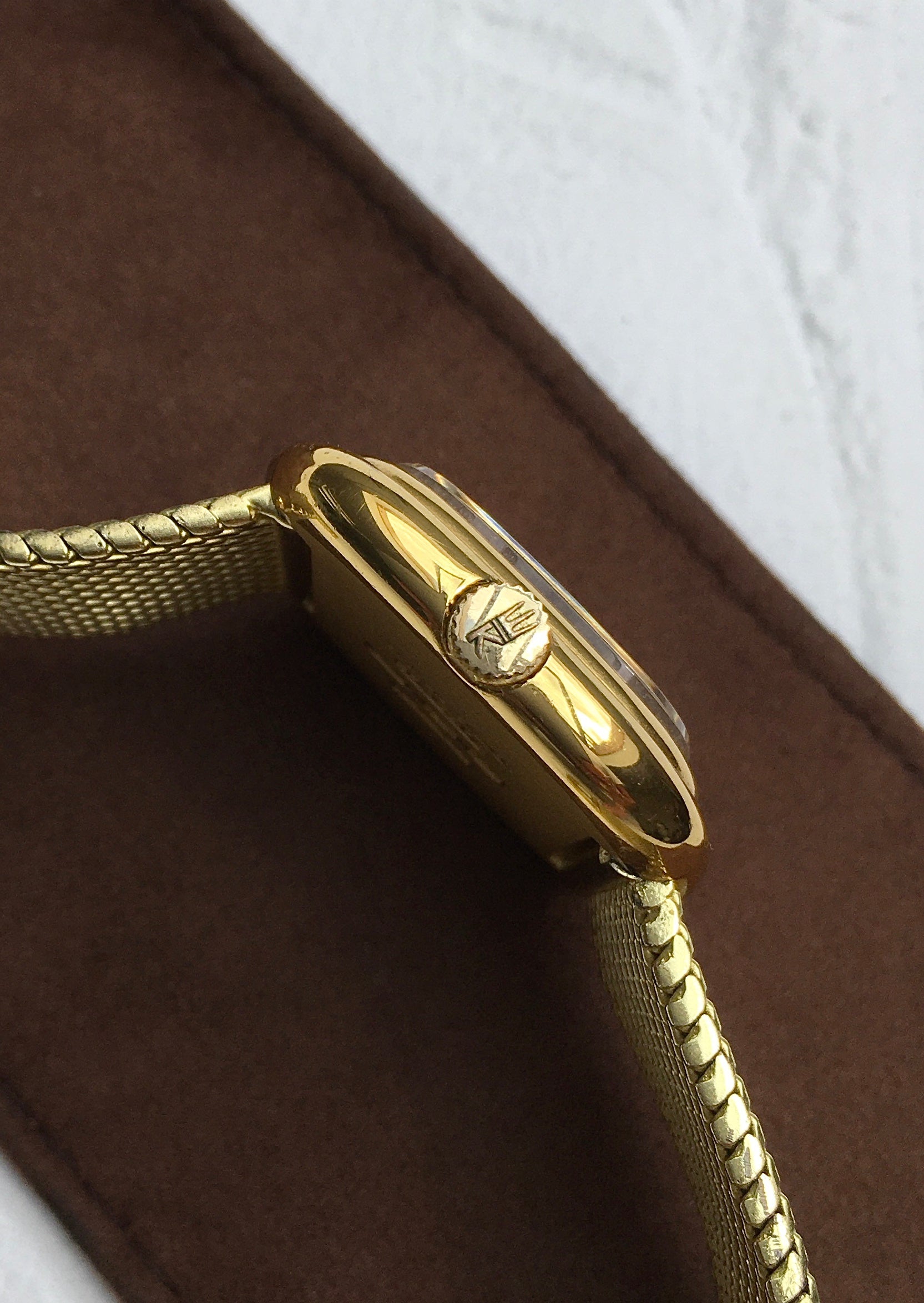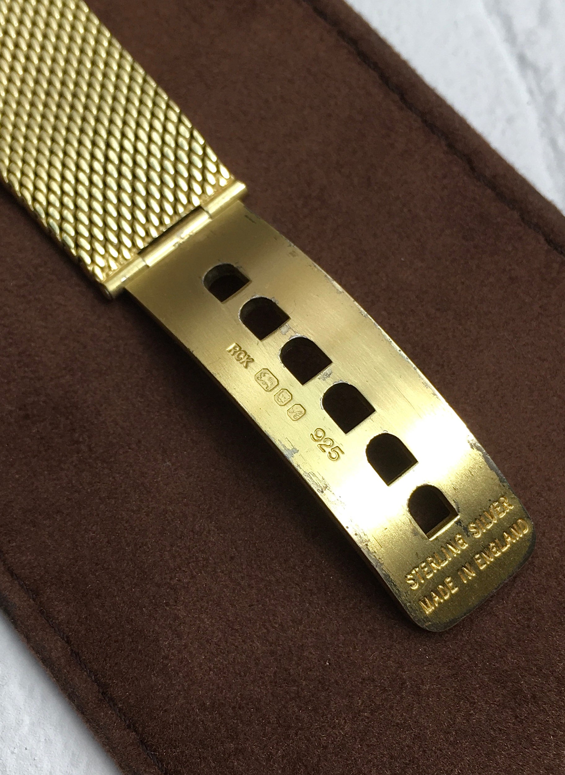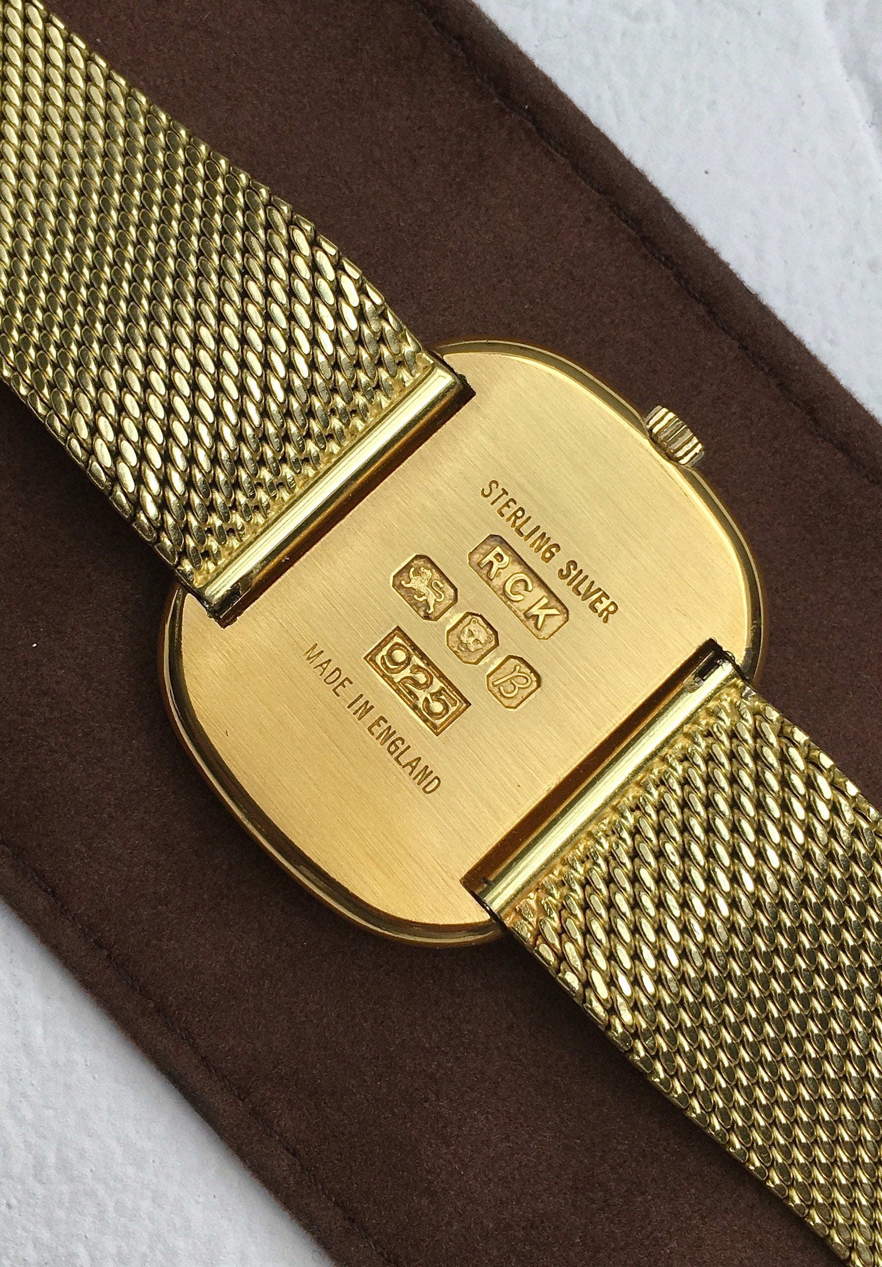 The gold plated solid Sterling silver monocoque case features a stepped bezel reminiscent of the Cartier Gondole (a brand for which King was a unaccredited manufacturer). The case back bears bold hallmarks for London 1976