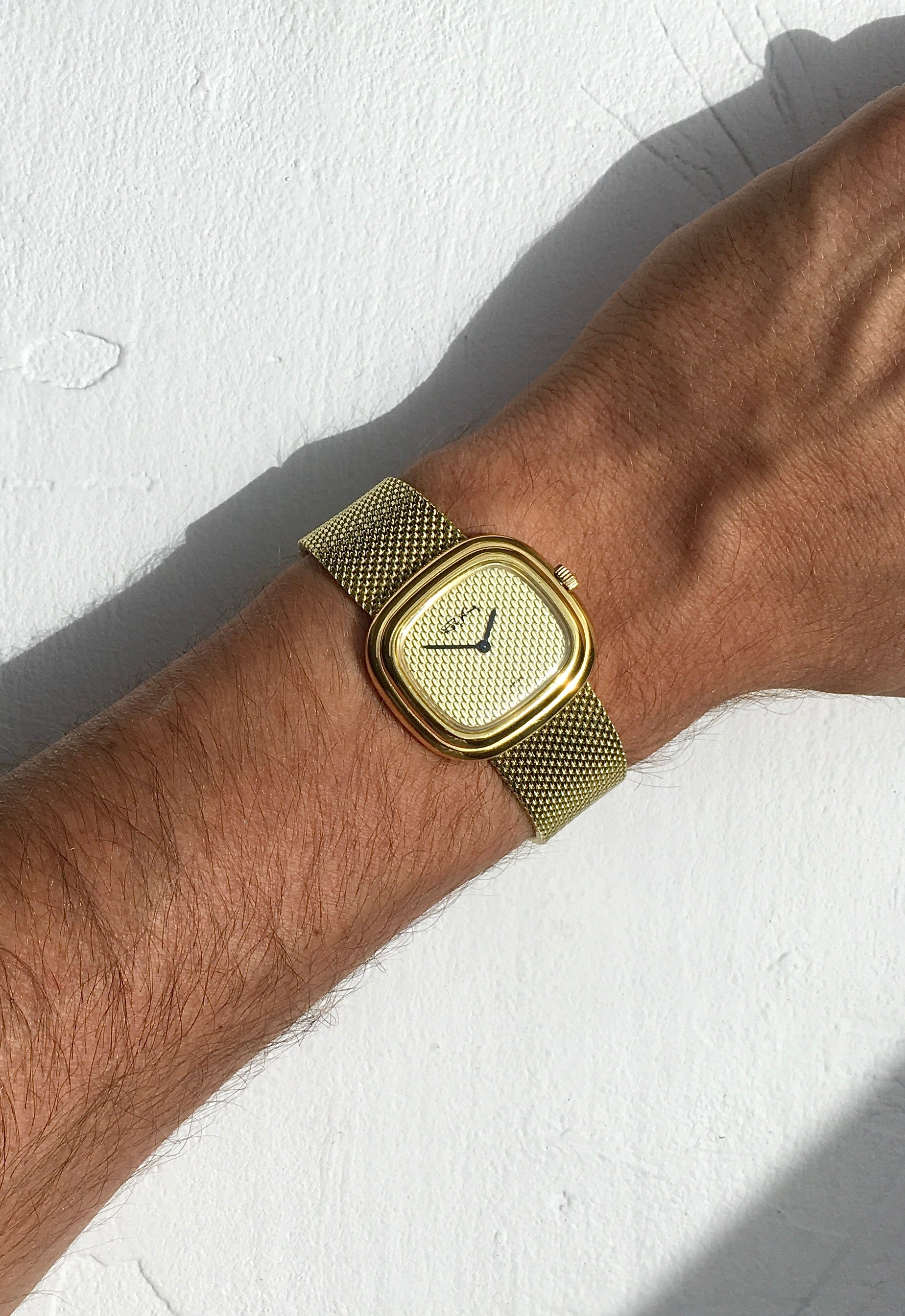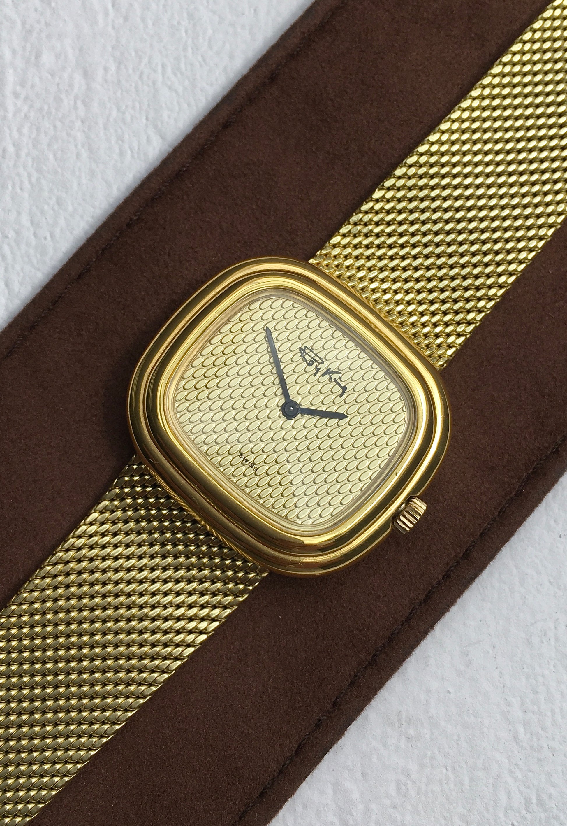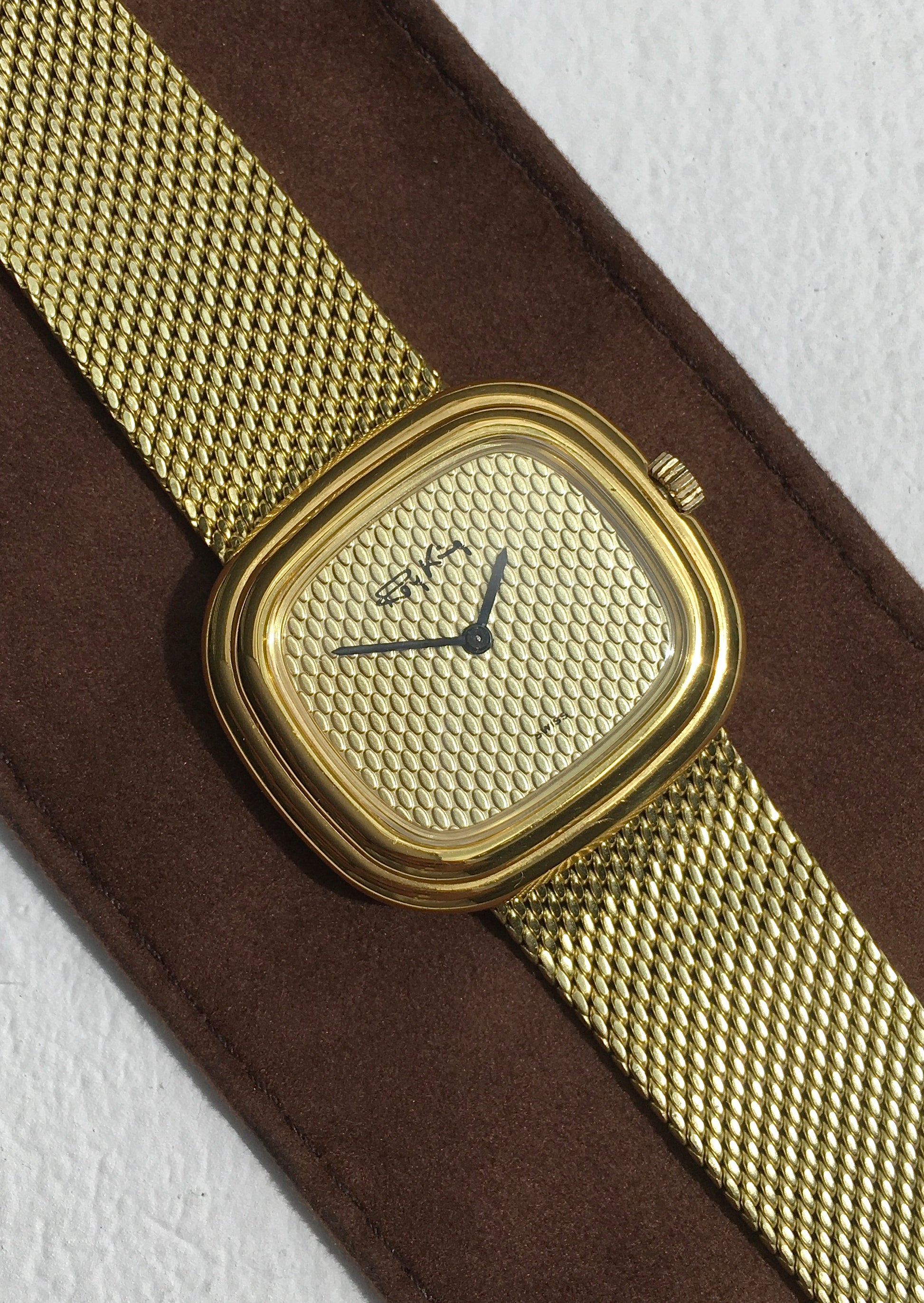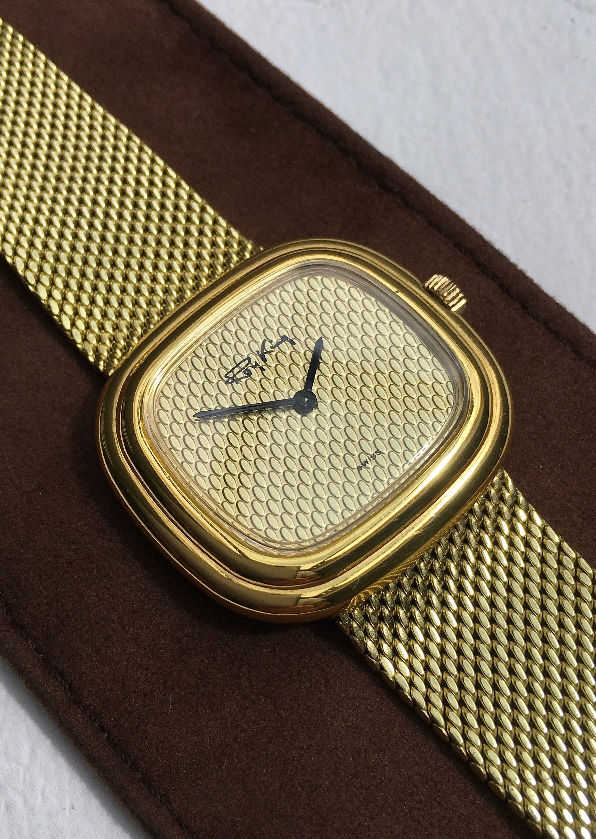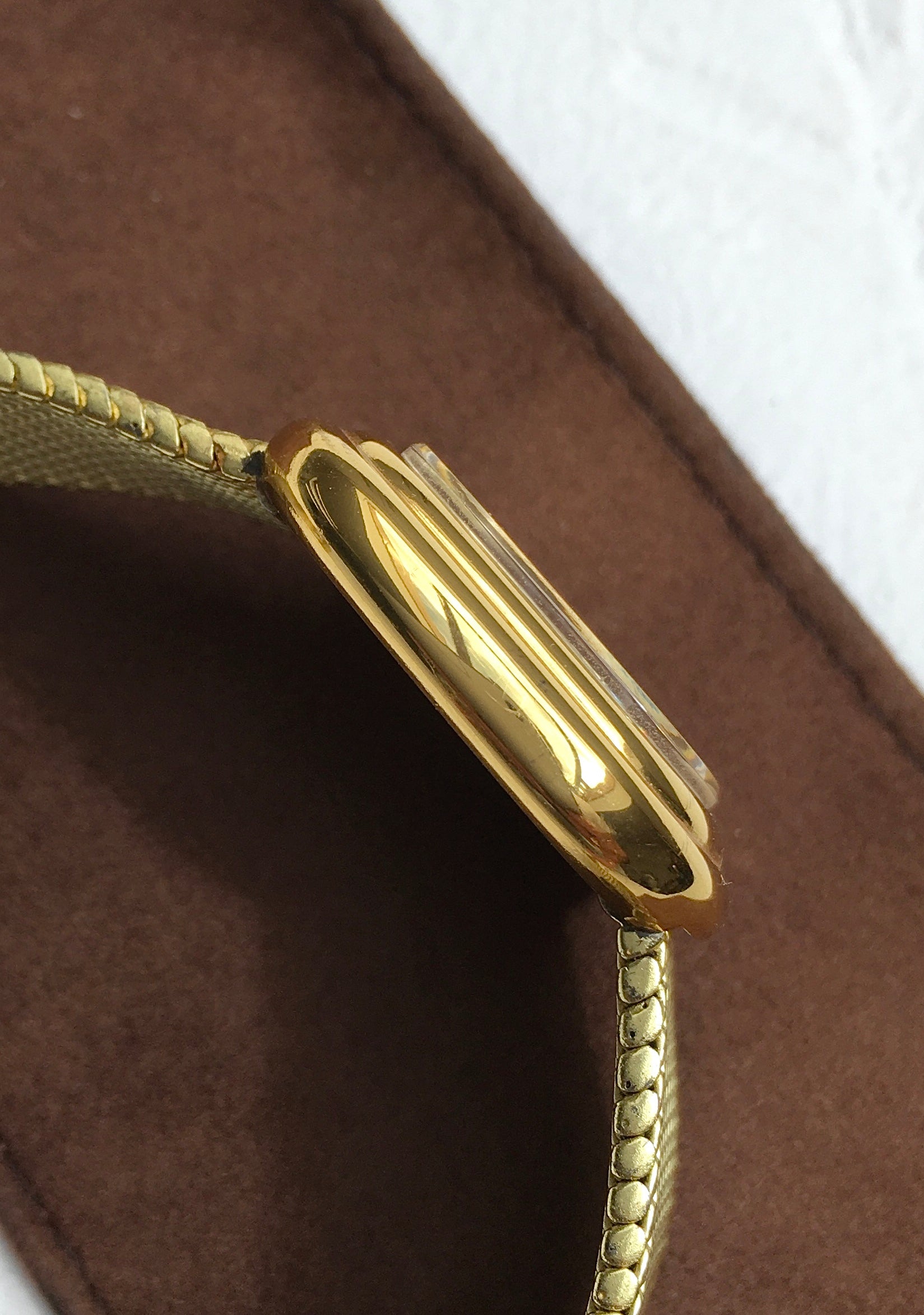 The gold plated solid Sterling silver monocoque case features a stepped bezel reminiscent of the Cartier Gondole (a brand for which King was a unaccredited manufacturer). The case back bears bold hallmarks for London 1976
