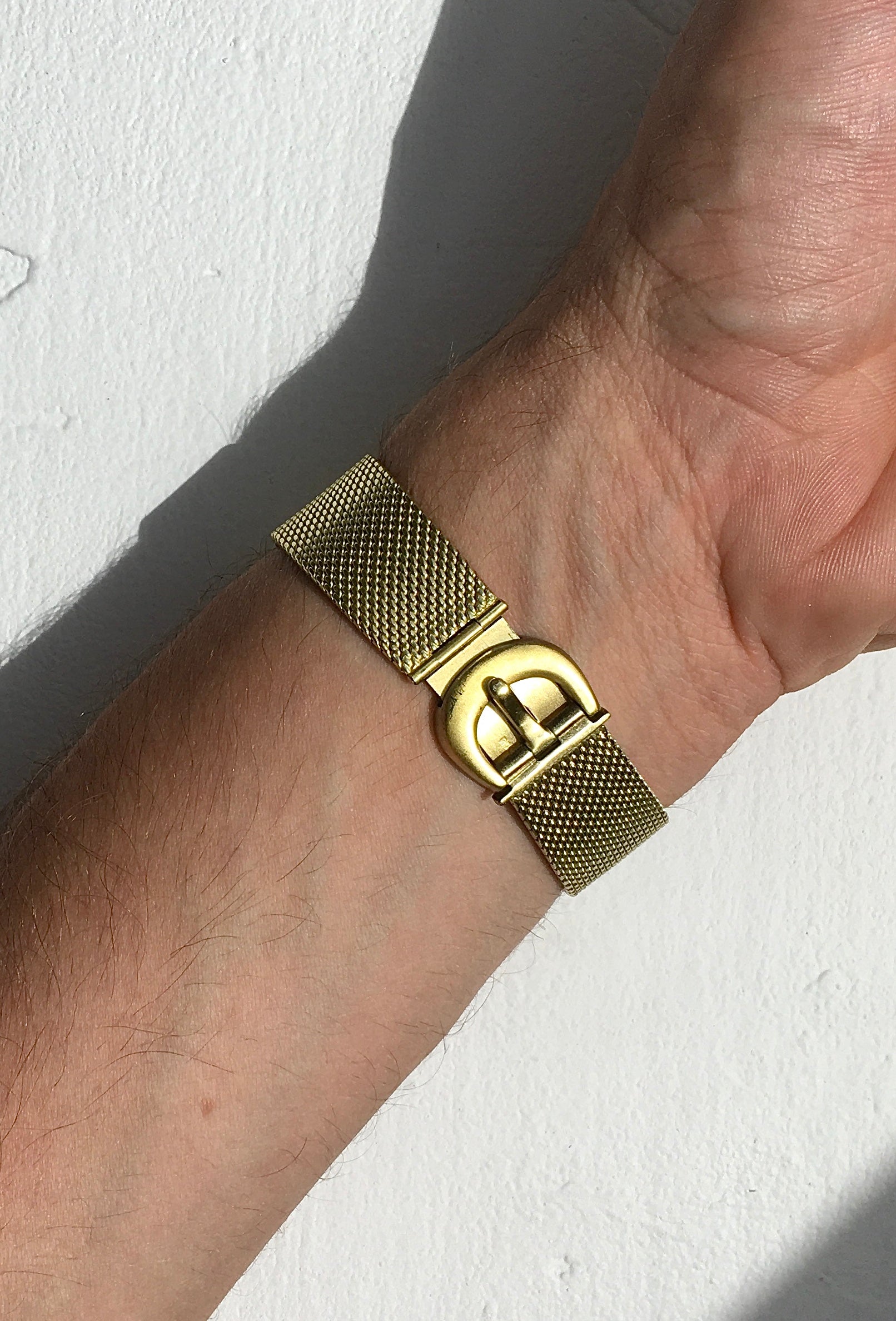 The finish on the golden dial continues through from the lugged Milanese Mesh bracelet and is decorated with King’s signature and black baton hands