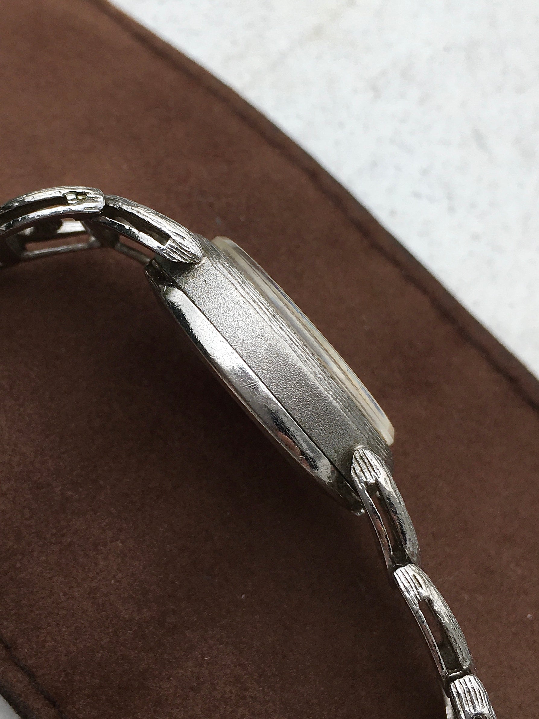 The brushed silvered dial (lightly discoloured) is decorated with black stick indices and black baton hands