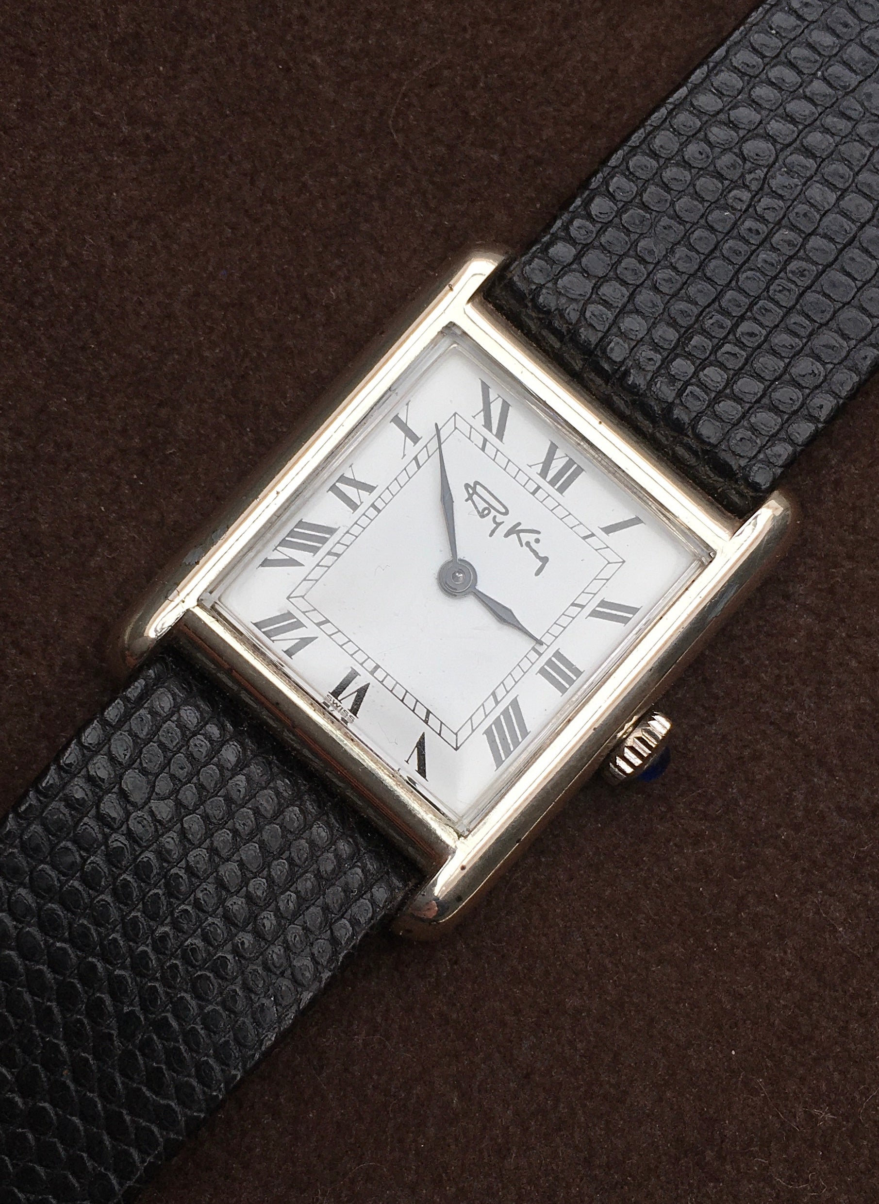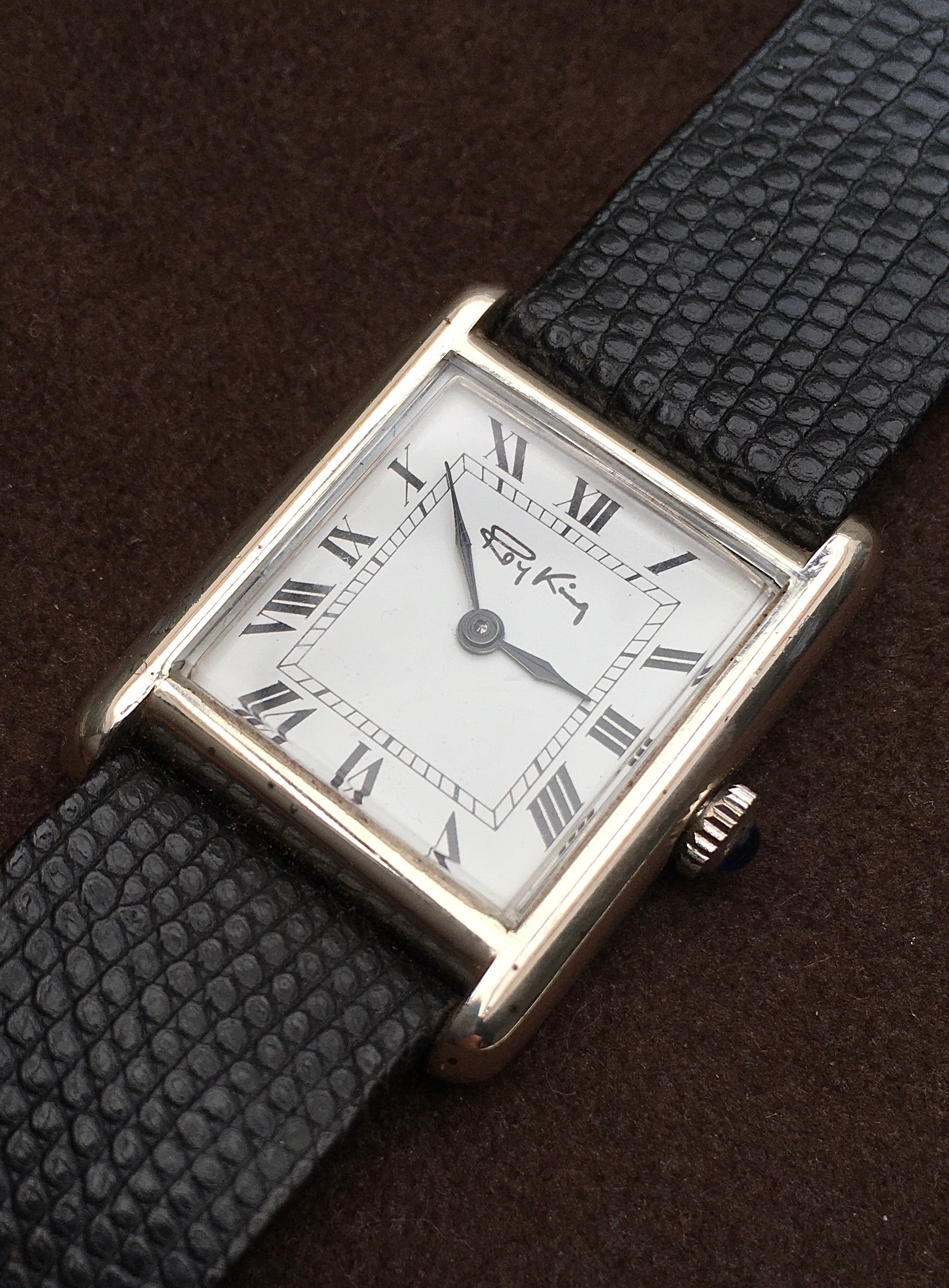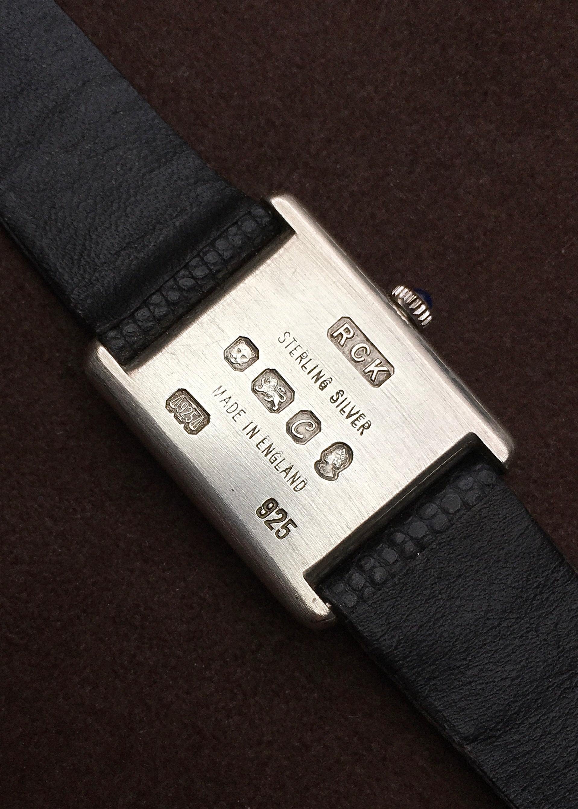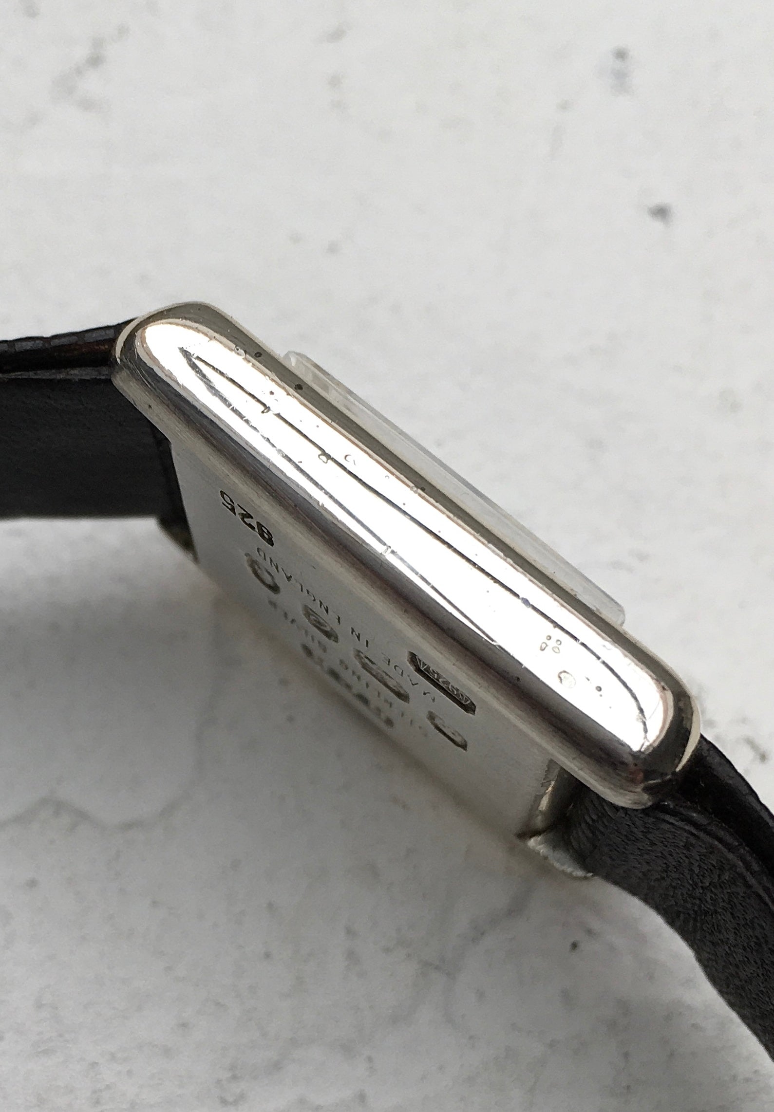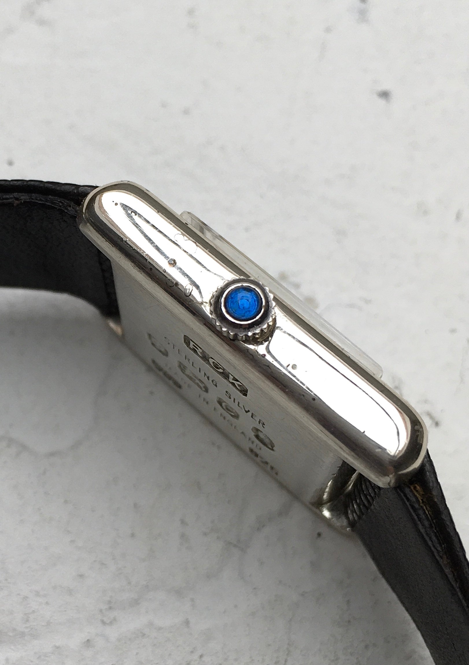 The rectangular Sterling Silver case is reminiscent of the Cartier Tank and remains in superb condition