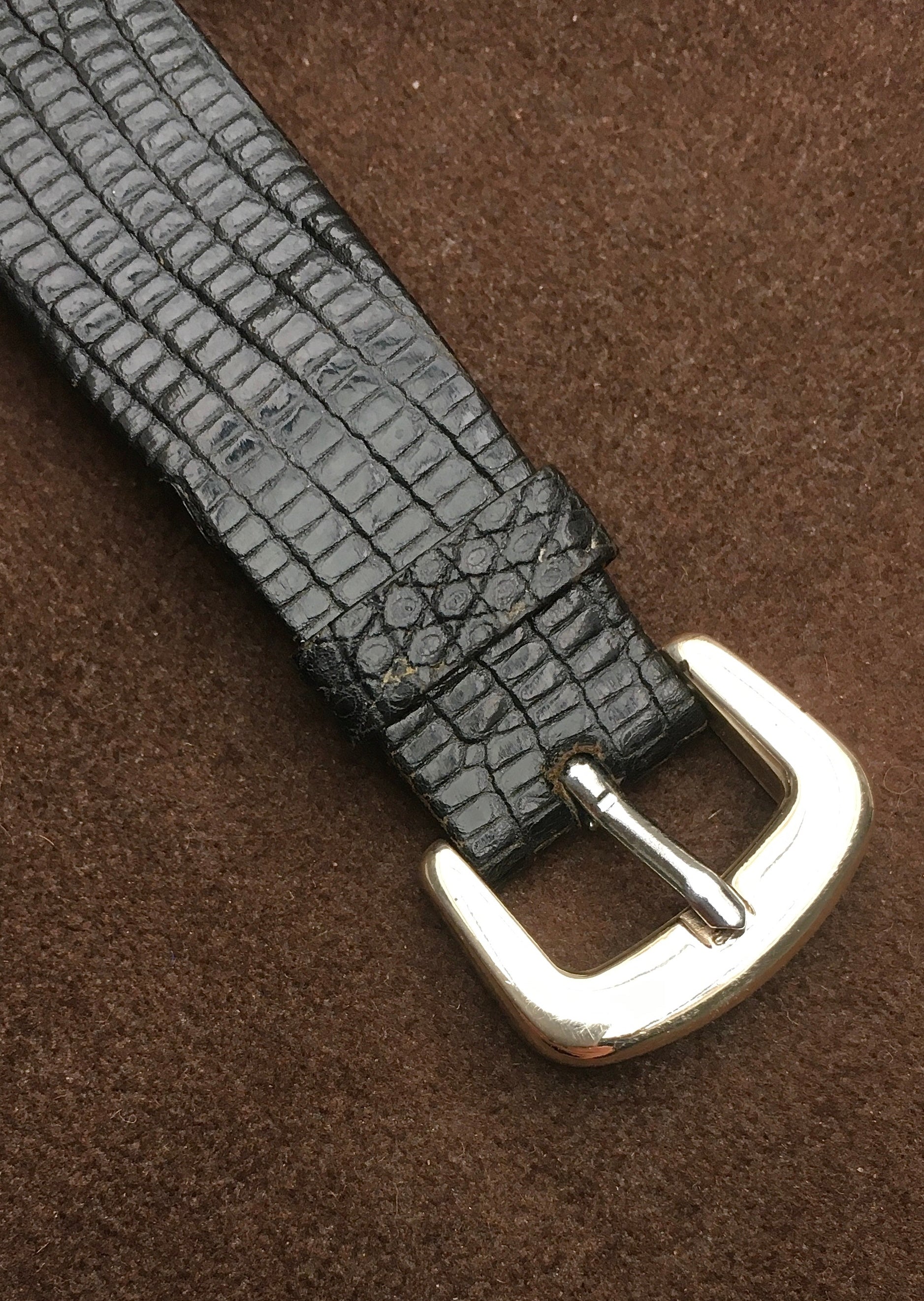 The original black pressed leather strap and Sterling Silver buckle are both in excellent condition