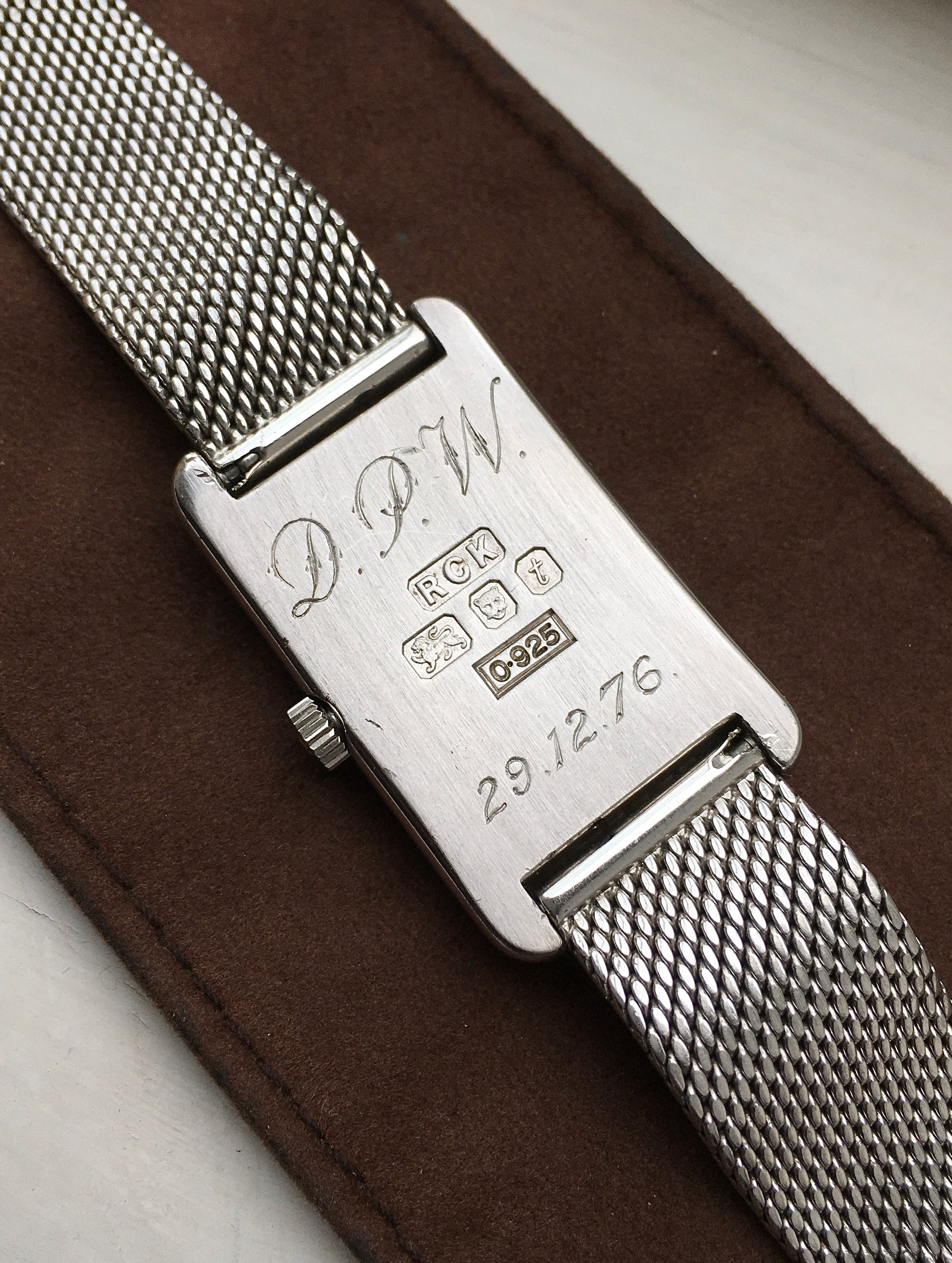 The Sterling silver monocoque case, reminiscent of the Cartier Tank Allongée (Cartier being a brand for which King was once an unaccredited manufacturer) features a polished stepped bezel and brushed case back bearing the marque’s iconic statement hallmarks (assayed in London in 1974) as well as skilfully hand engraved initials of the lucky person to whom this watch was gifted on the 29th of December 1976