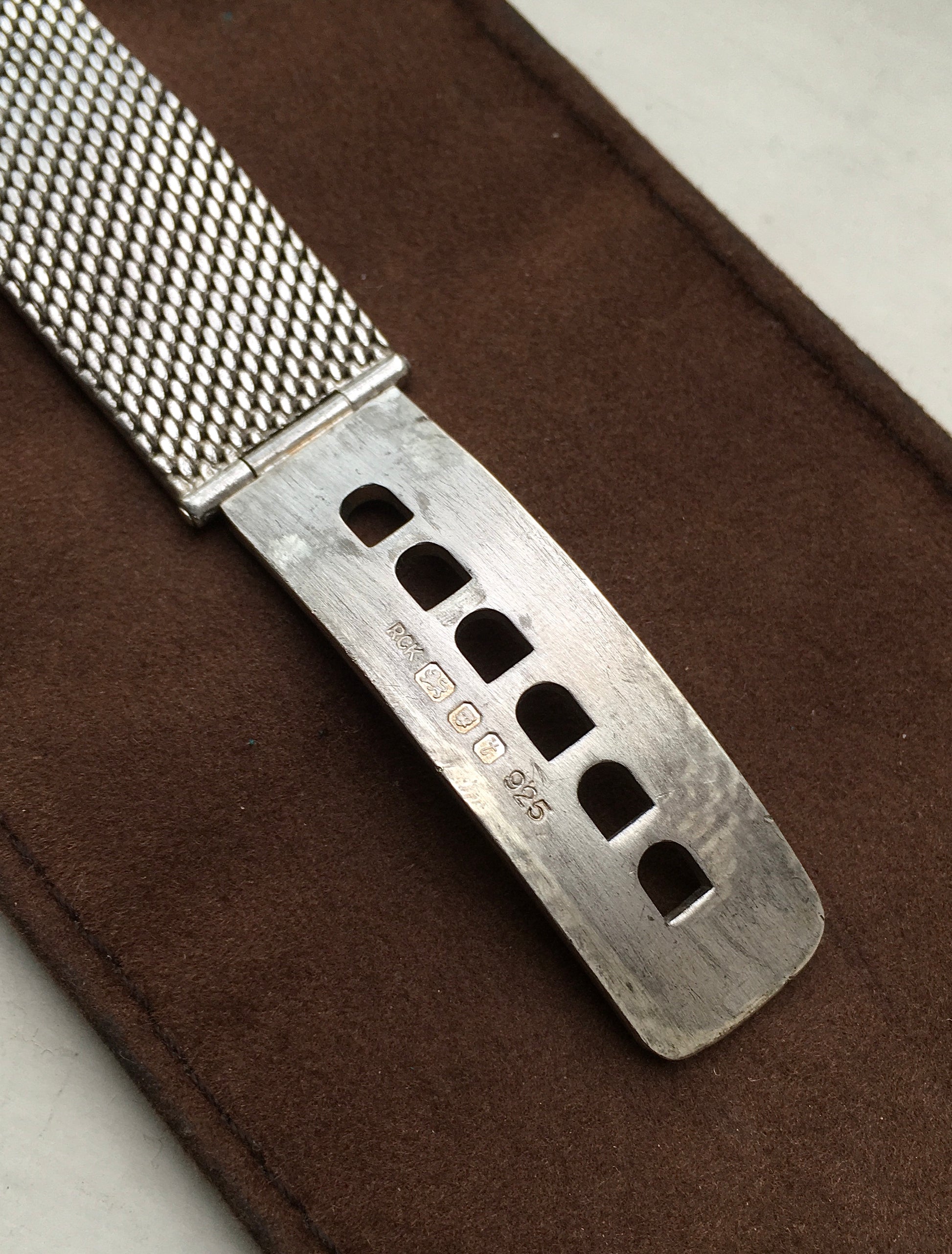Setting this piece aside from the rest is the lugged, Sterling silver Milanese mesh bracelet, a contemporary twist on an otherwise classic dress watch. Fastened by King’s legendary multi setting buckle clasp and bearing bold hallmarks for London 1974