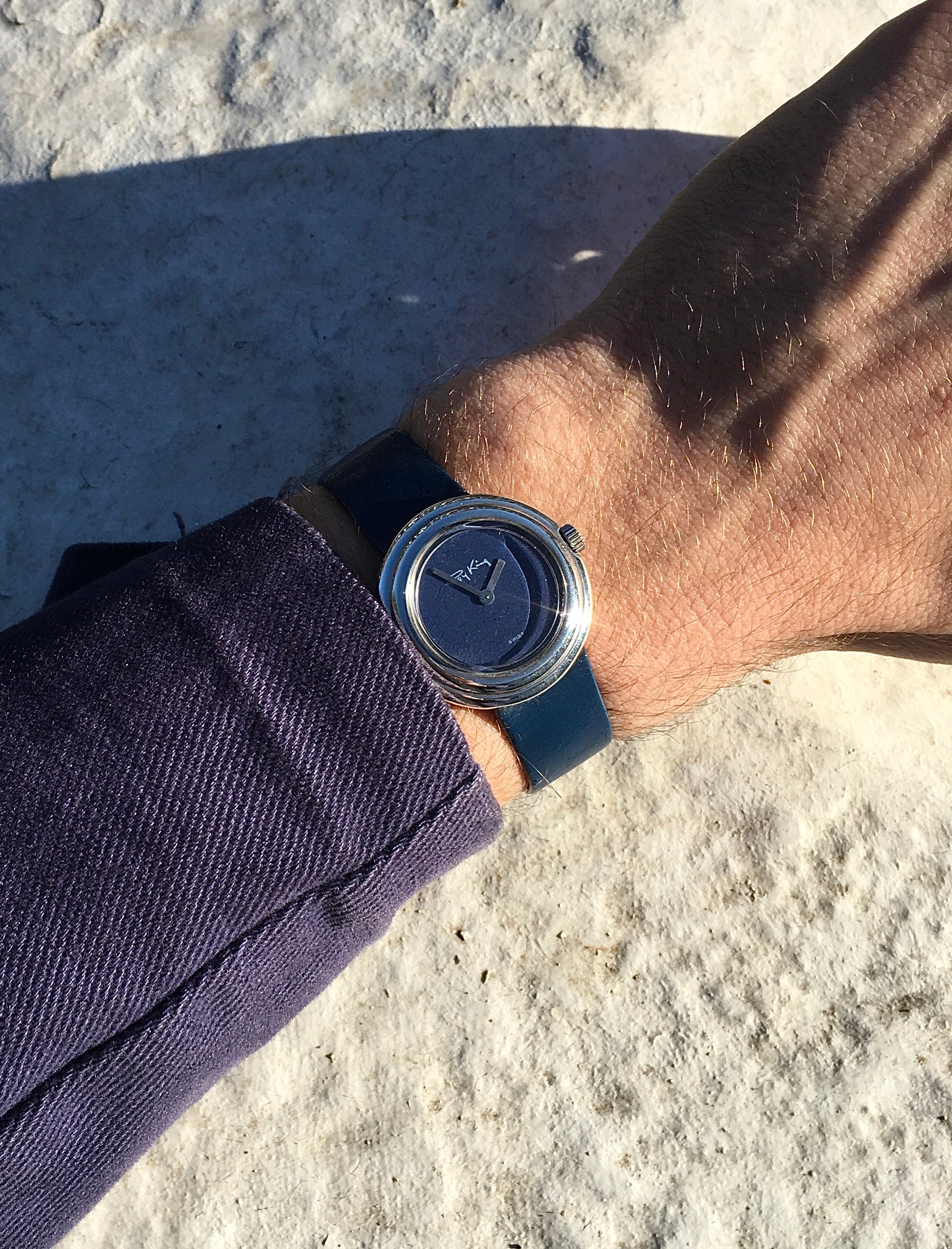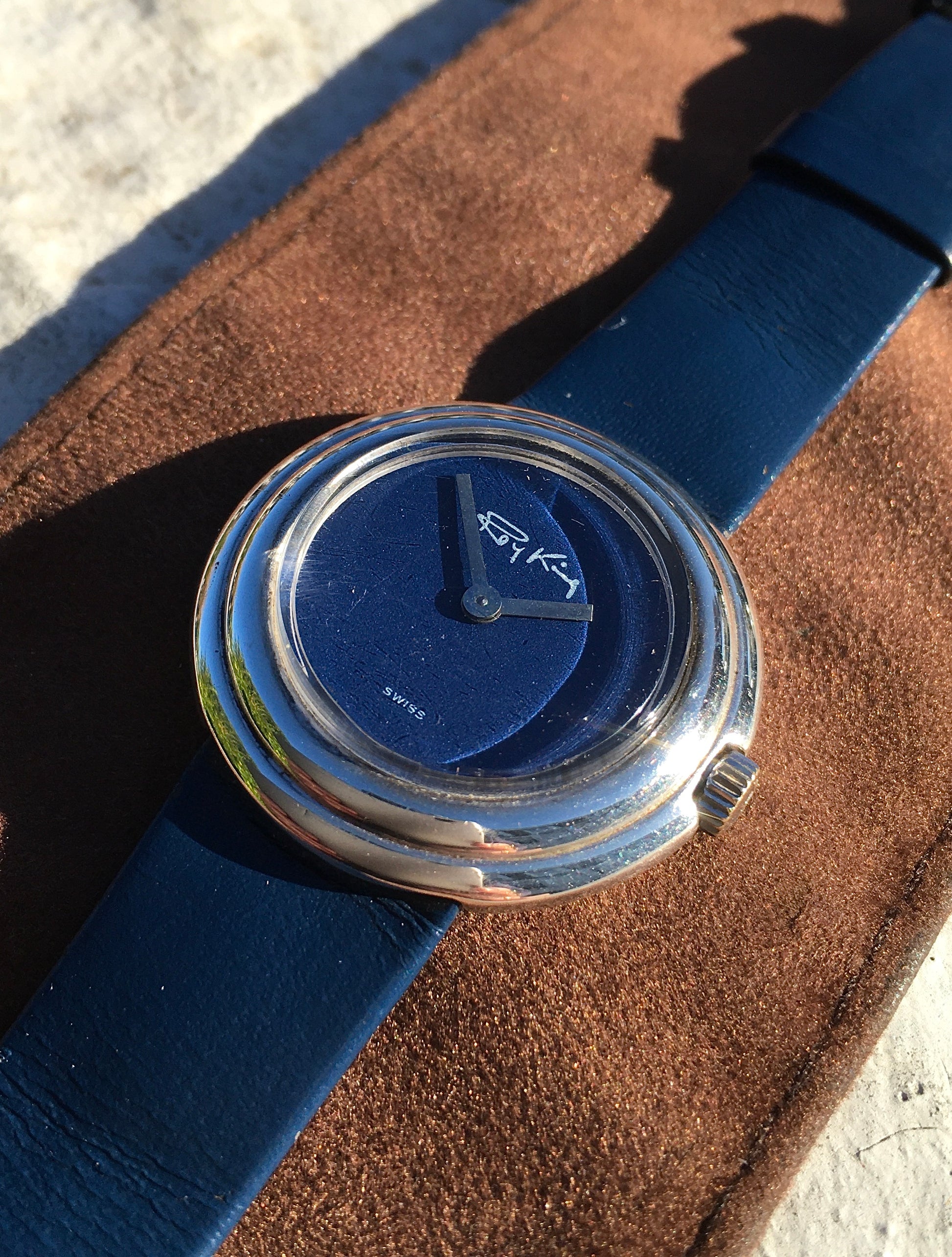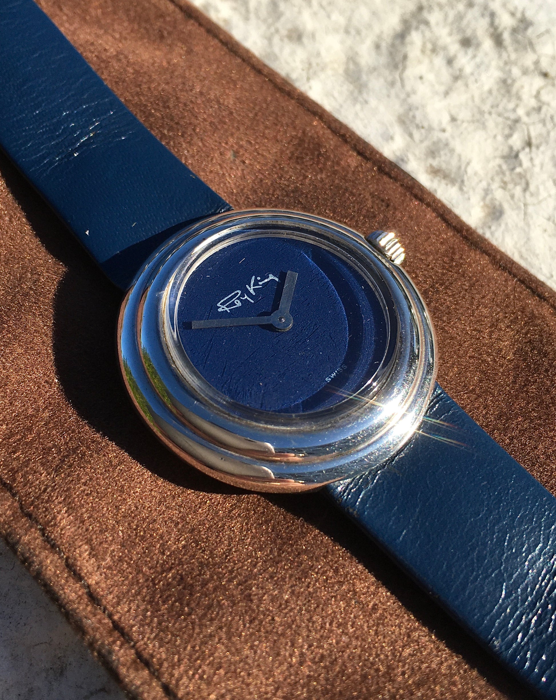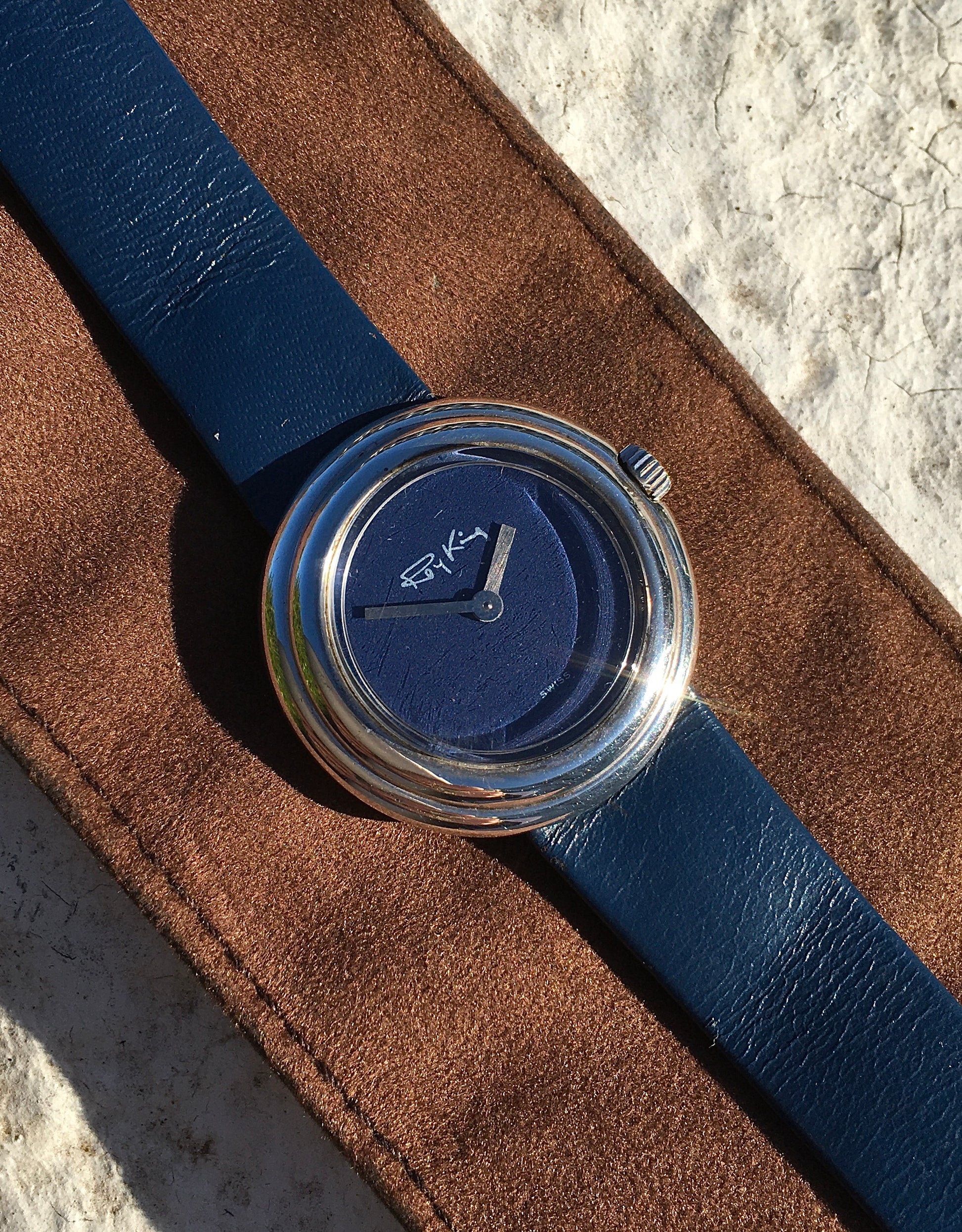 The very clean and exceptionally rare blue dial is decorated with silvered baton hands and King’s signature