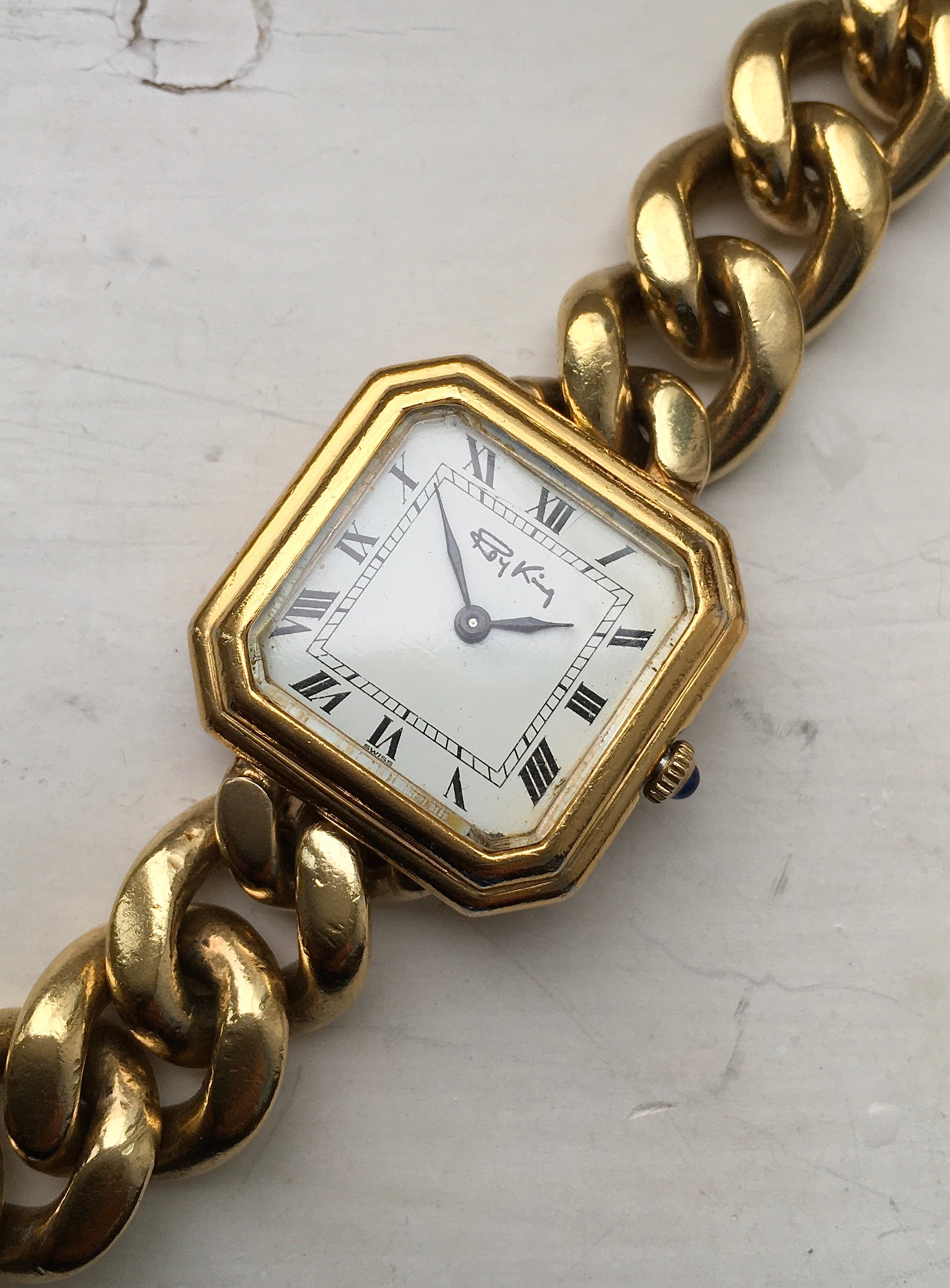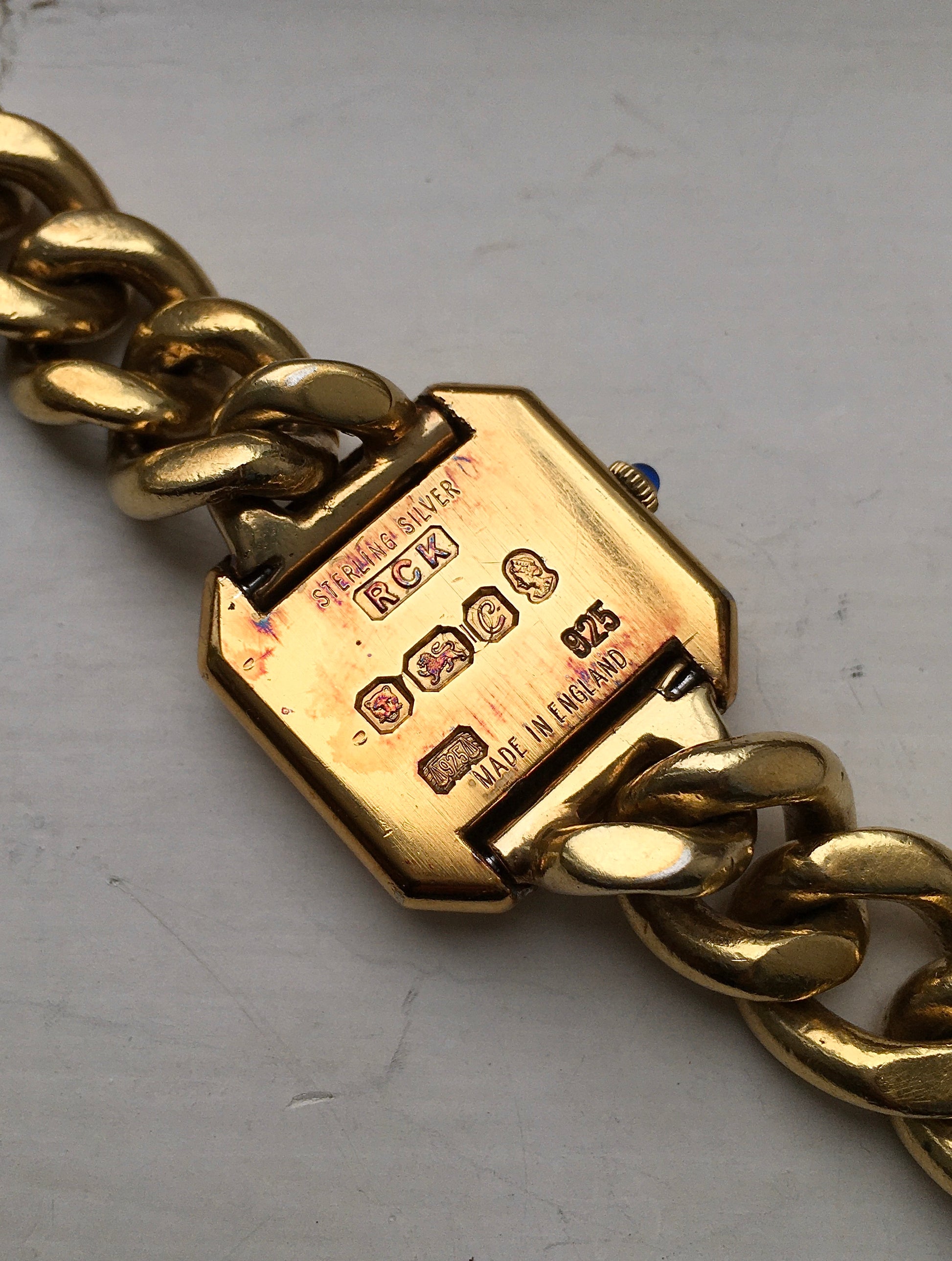 The rare, lugged Sterling silver vermeil bracelet is in wonderful condition. Chunky yet supple it compliments the watch head wonderfully. Hallmarked in a few places but most noticeably to the ‘ladder’ section of the clasp with the ‘RCK’ markers mark and assay stamps for London 1977. The iconic buckle clasp fastens securely