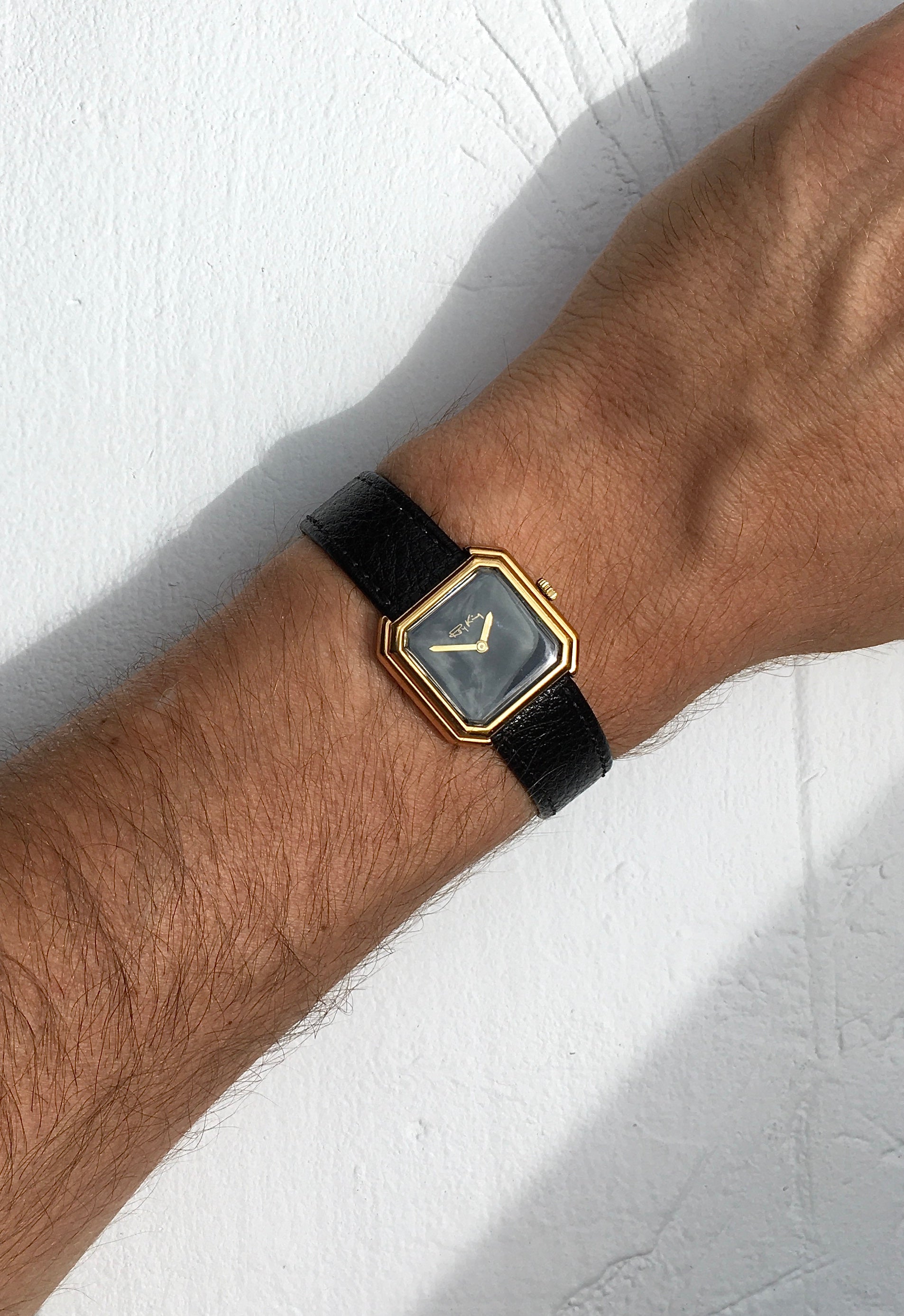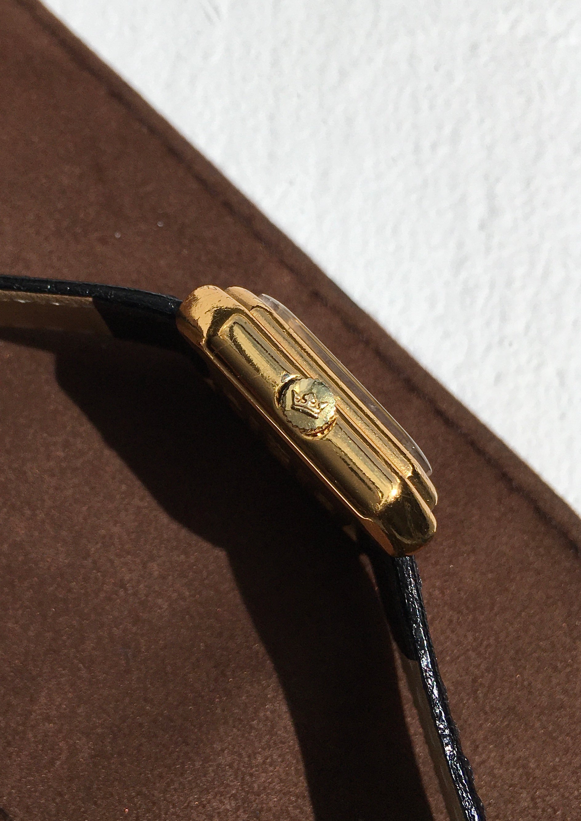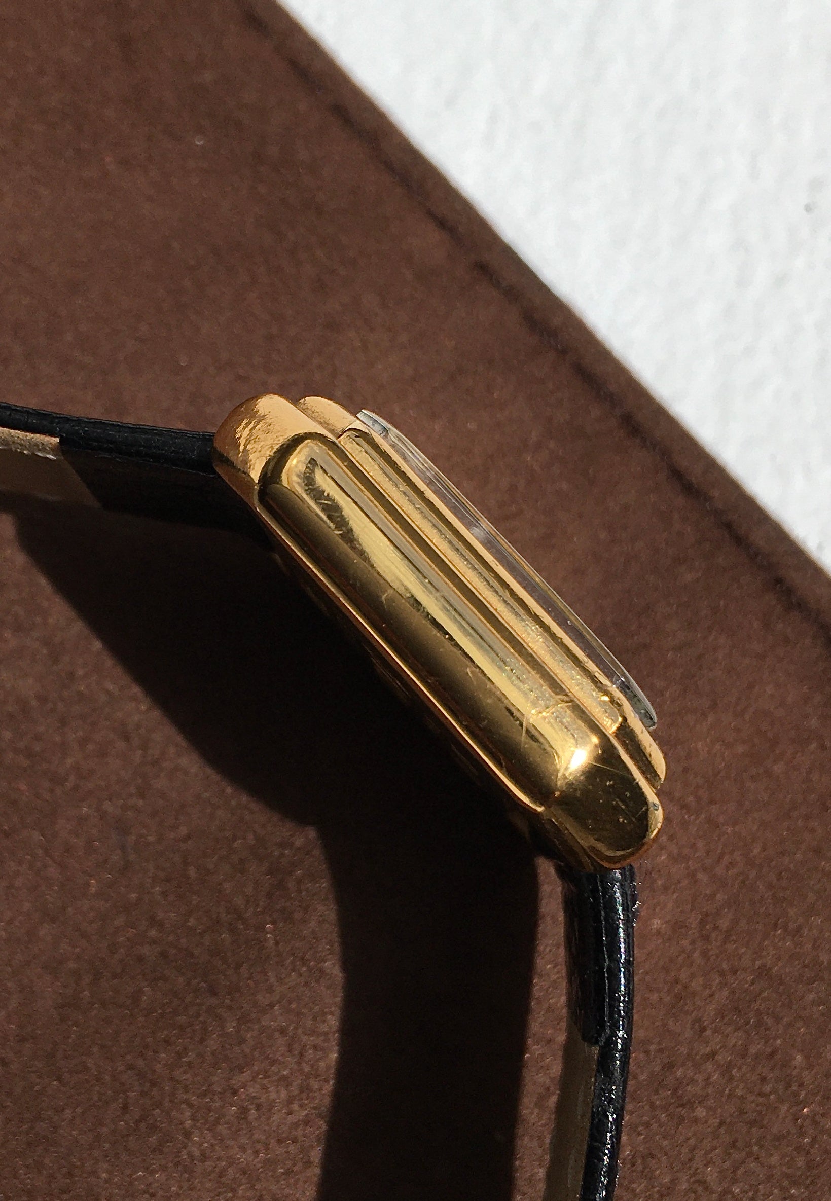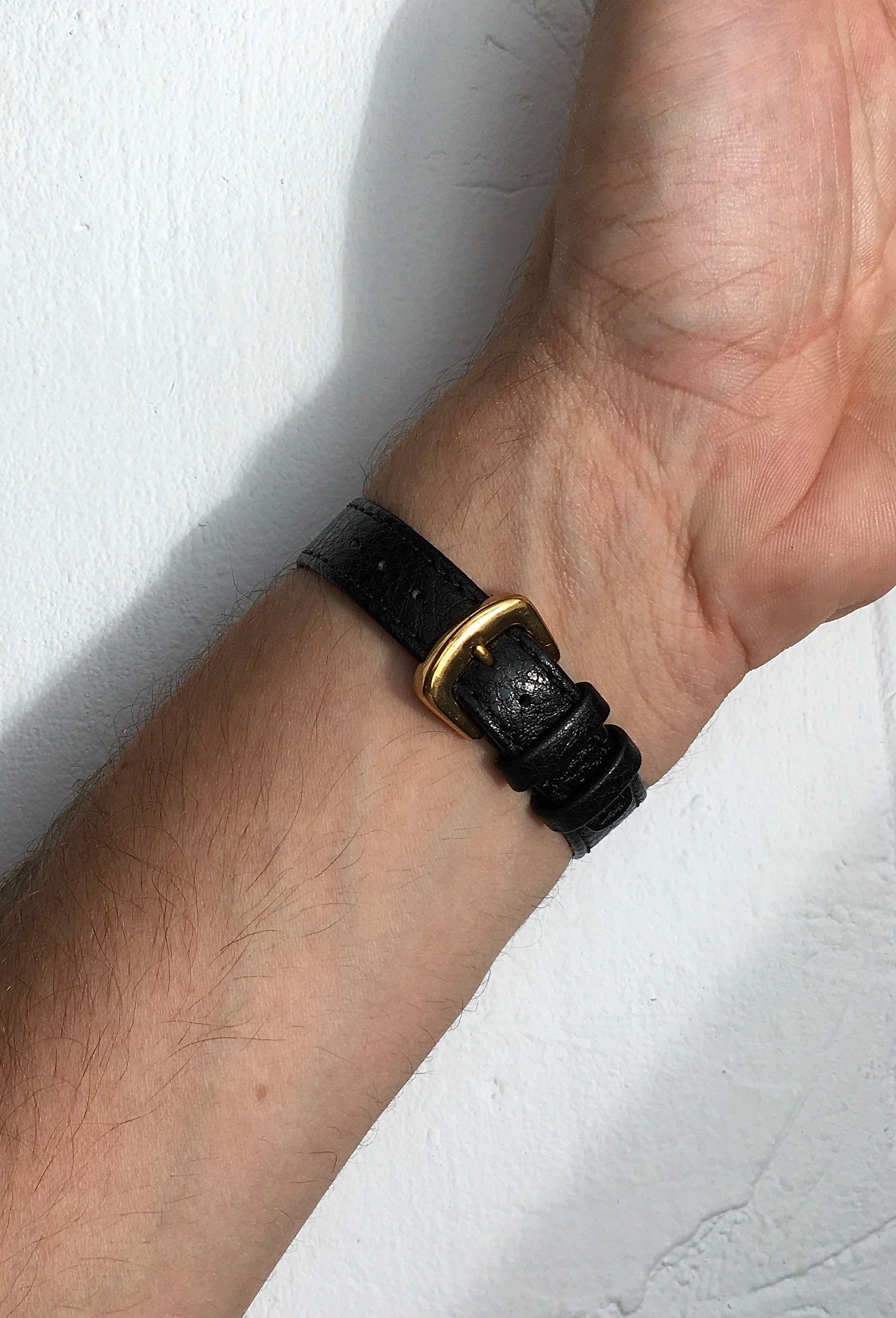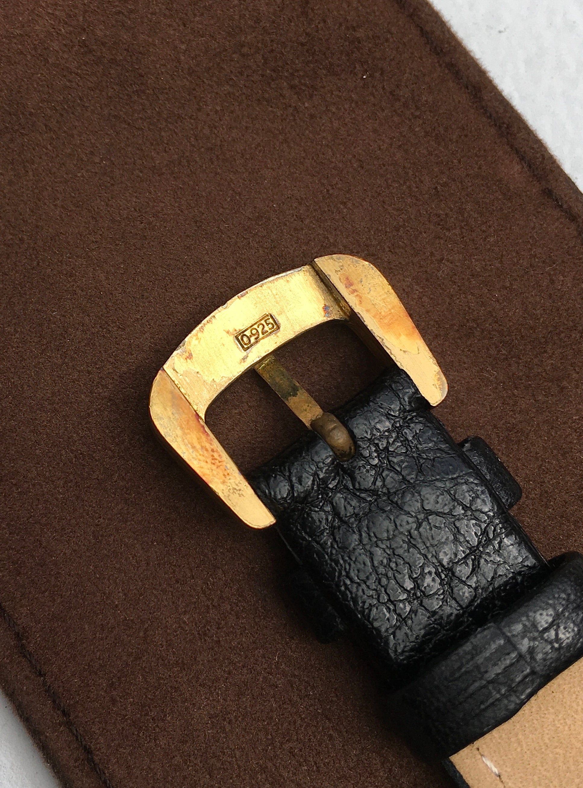 The original Sterling Silver vermeil buckle is present and set on a brand new black calf skin leather strap