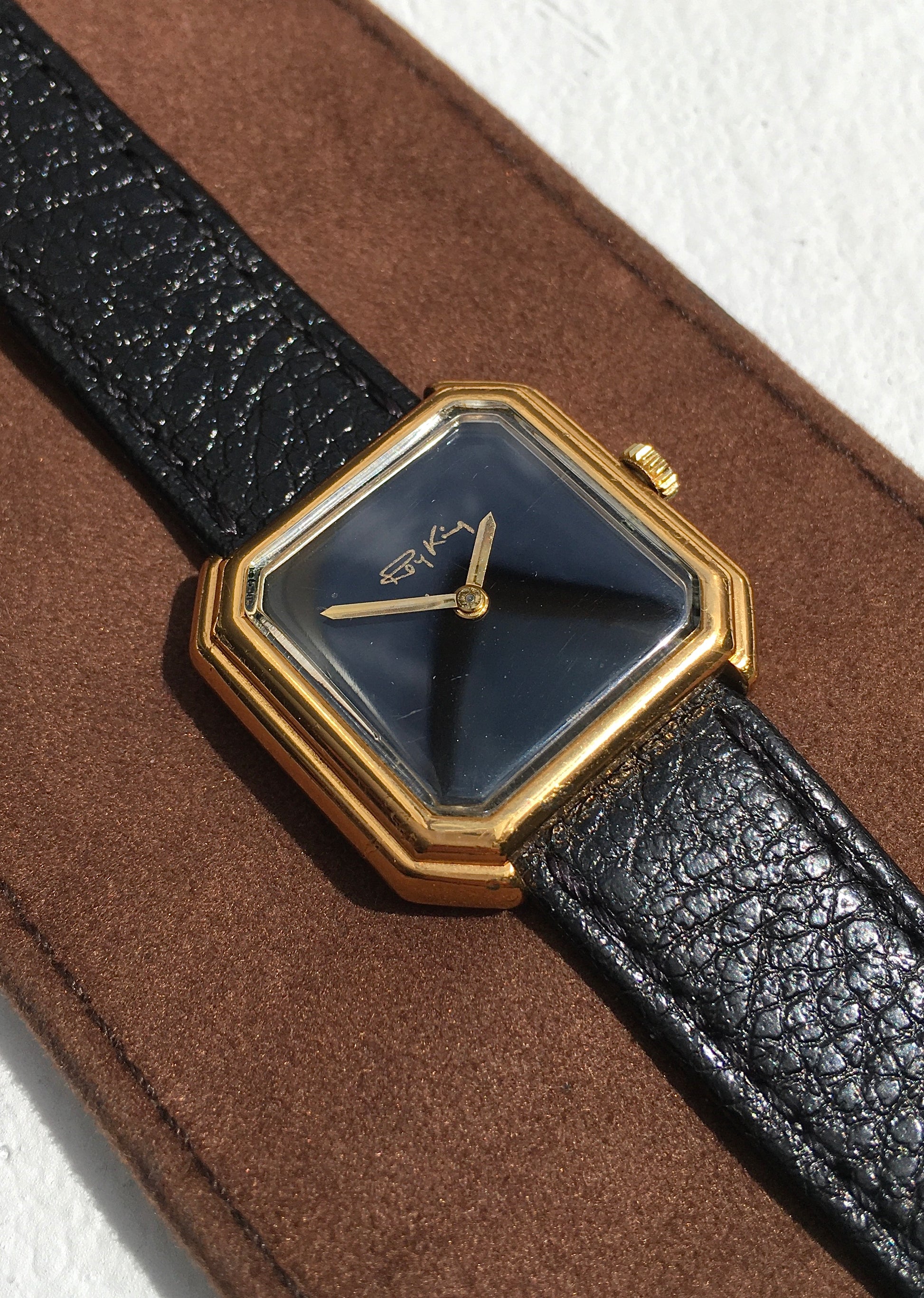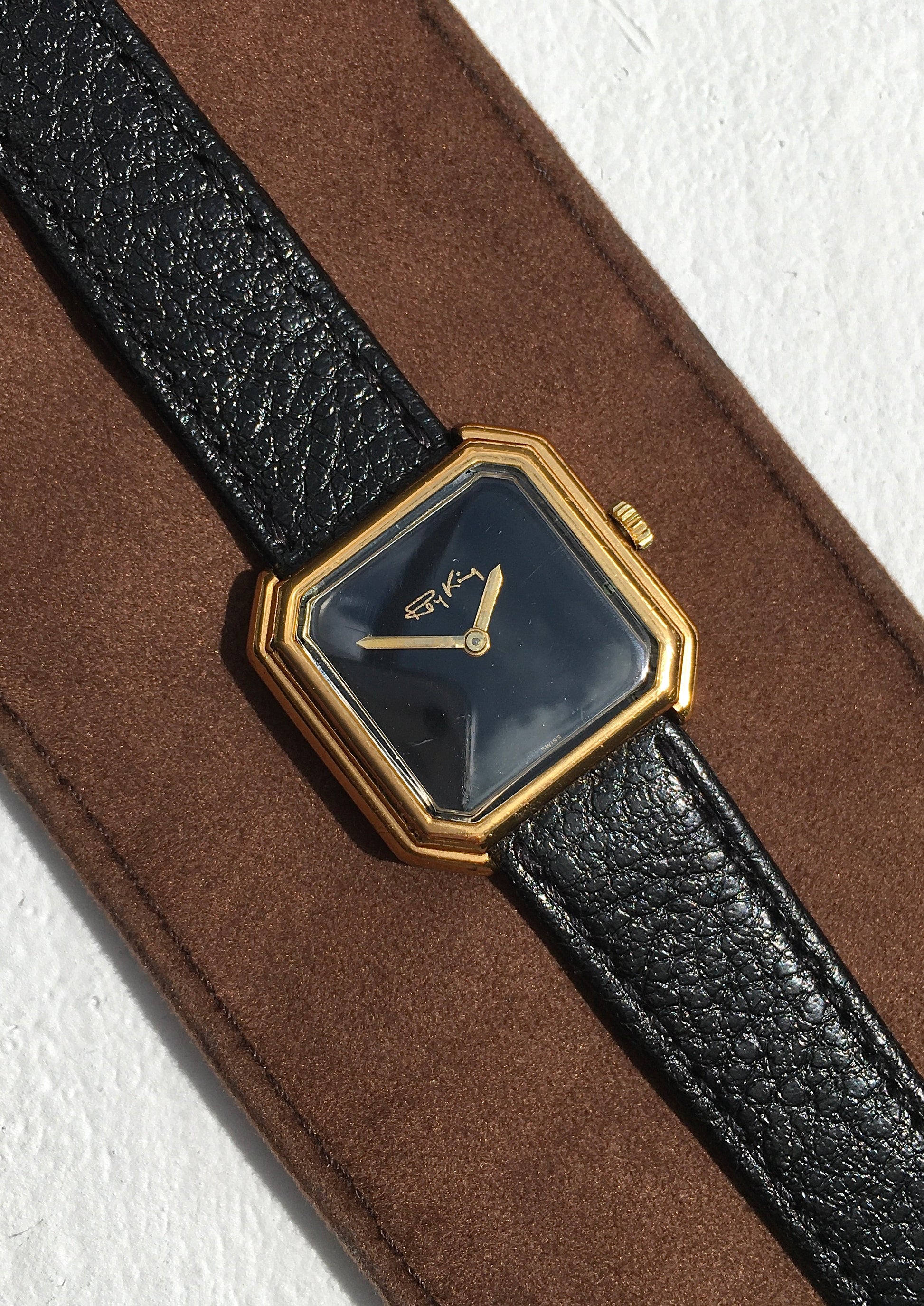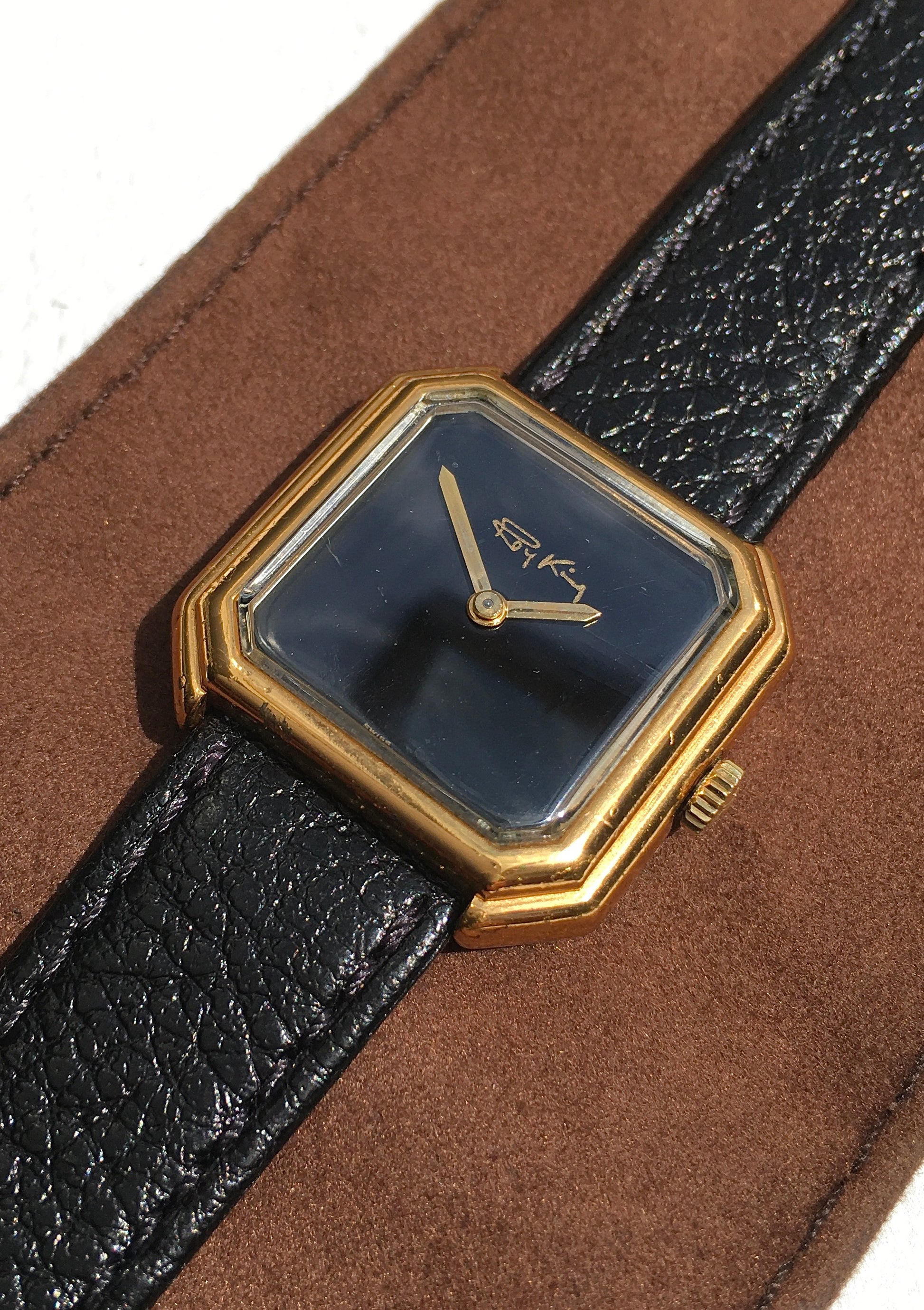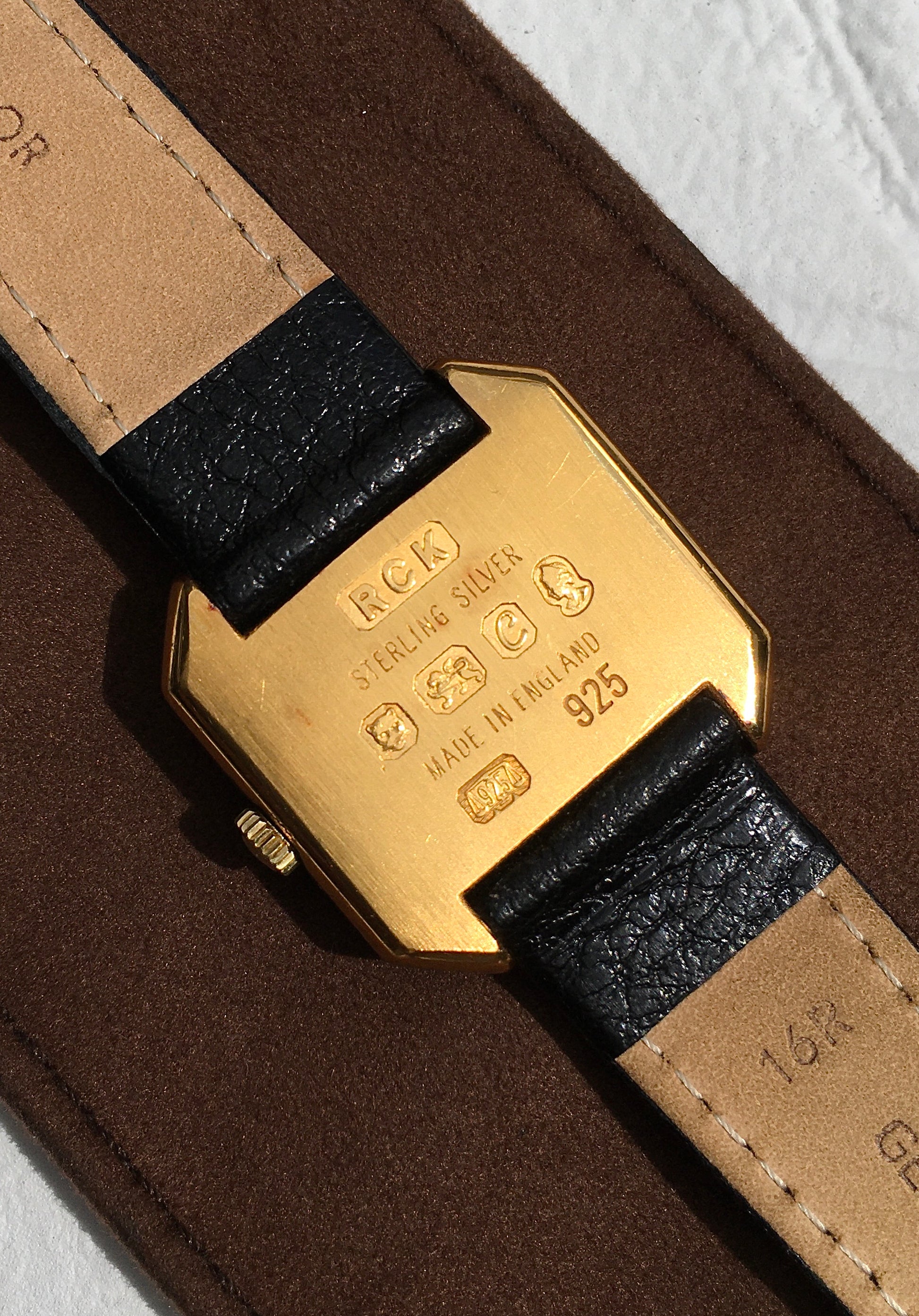 The Sterling Silver vermeil monocoque case, reminiscent of that of the Cartier Ceinture (Cartier being a brand for which King was once an unaccredited manufacturer), features a stepped bezel and bold statement hallmarks to the case back