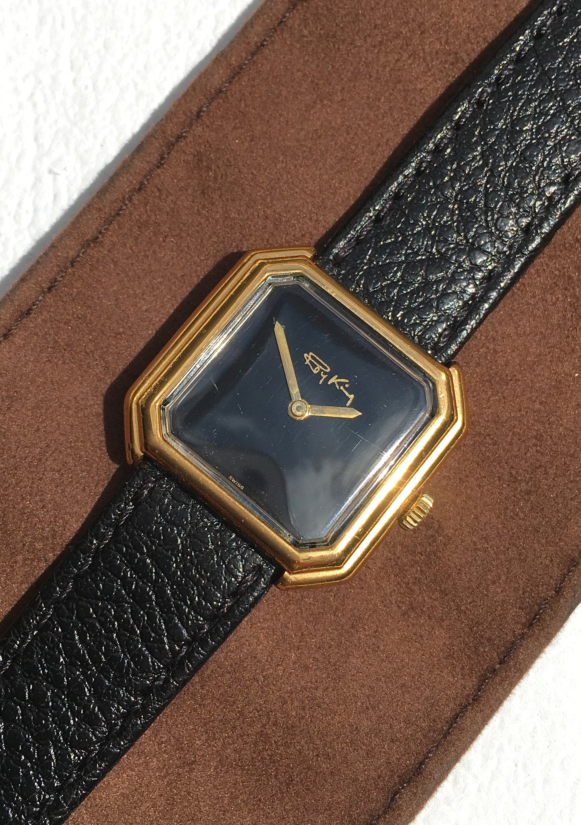 The clean minimalist black dial is decorated with golden baton hands and King’s signature