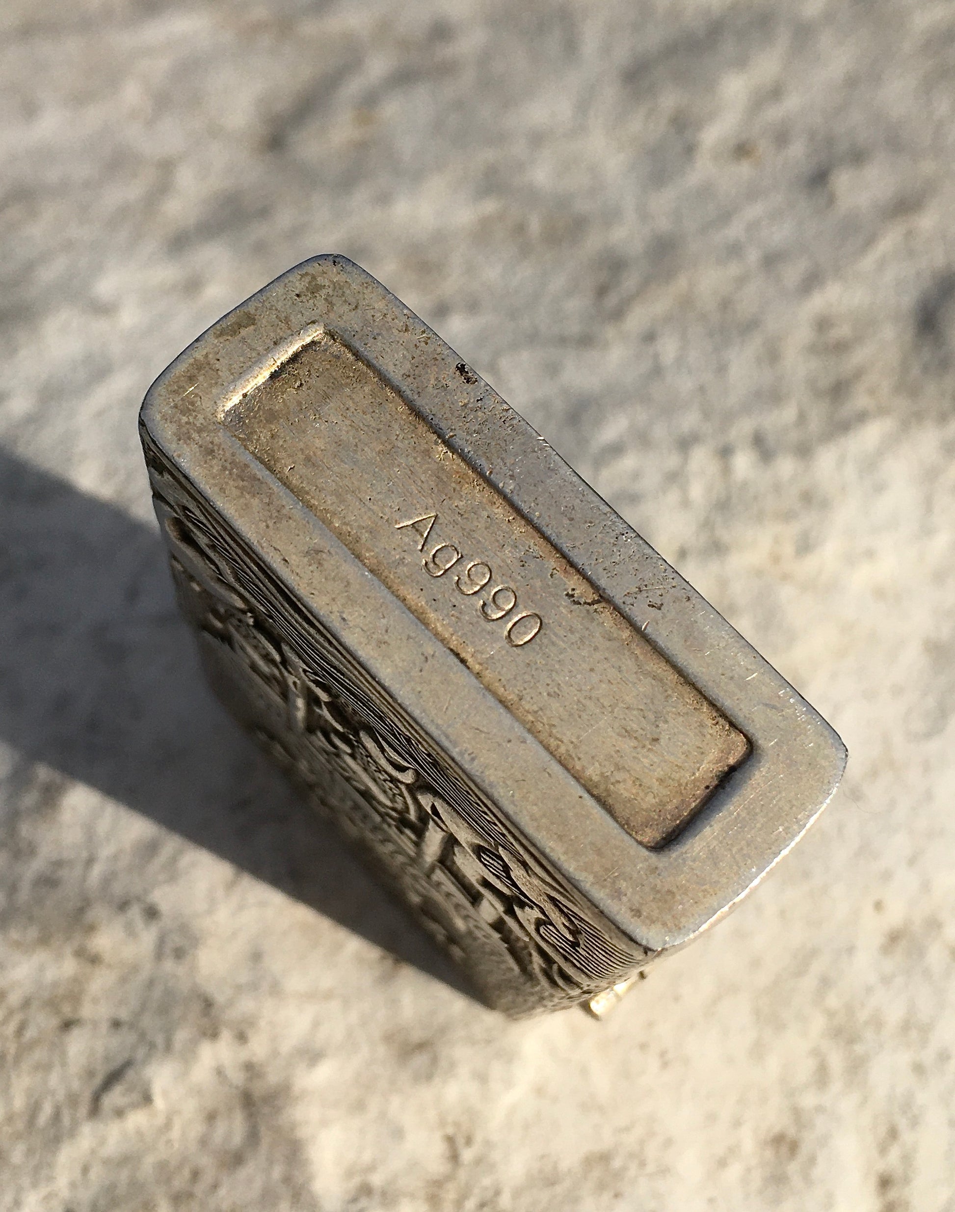 The base is stamped ‘Ag990’, informing us the case is formed of 99% pure silver