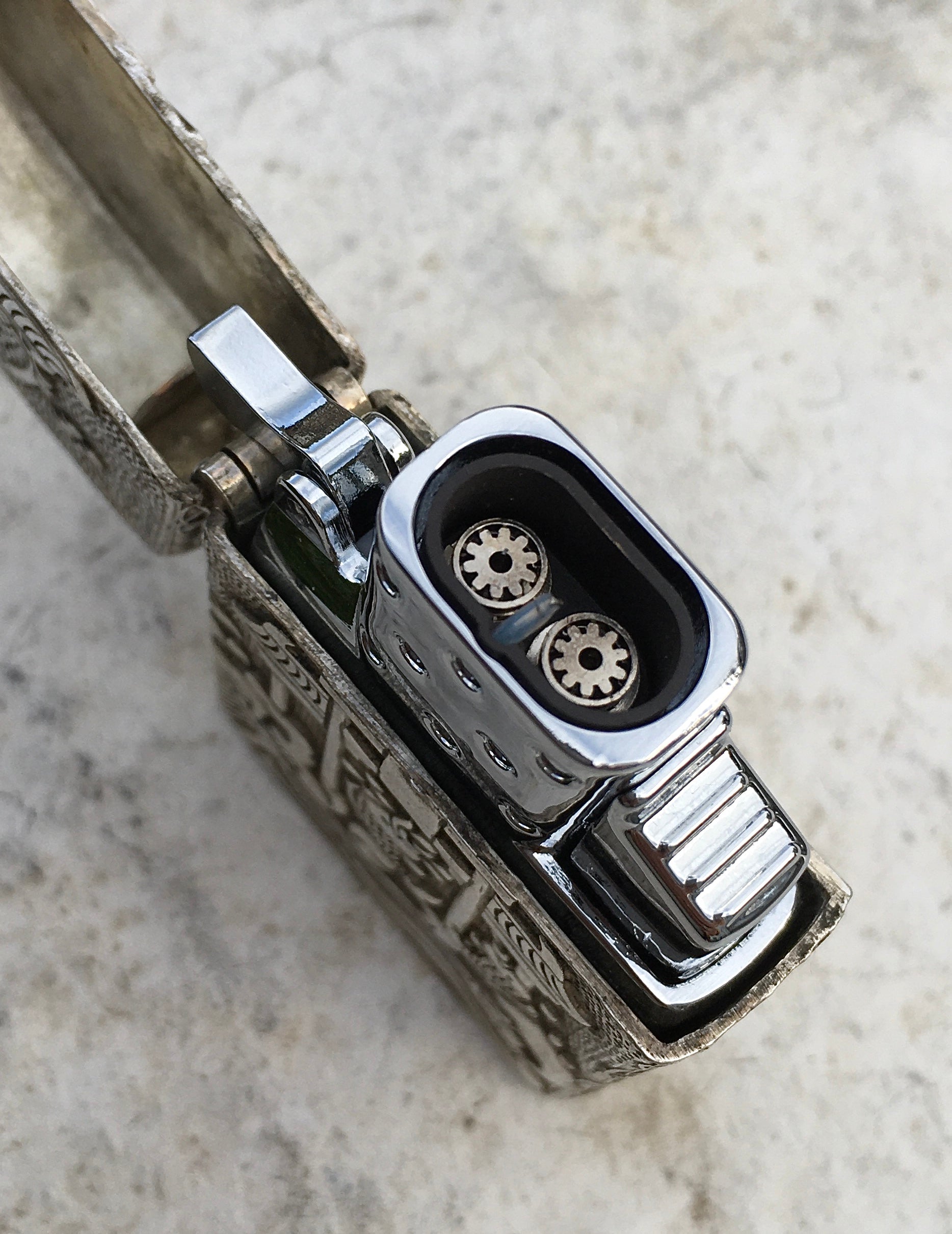 The flint operated petrol fuelled insert, similar to that of a Zippo insert, is also included