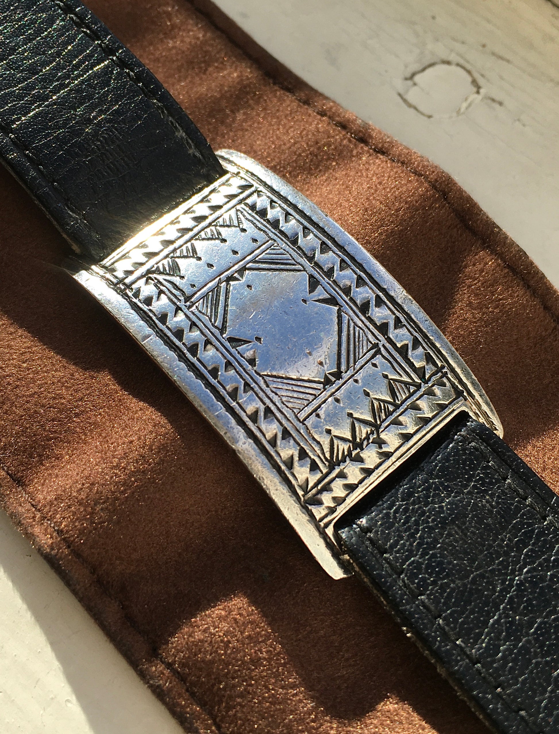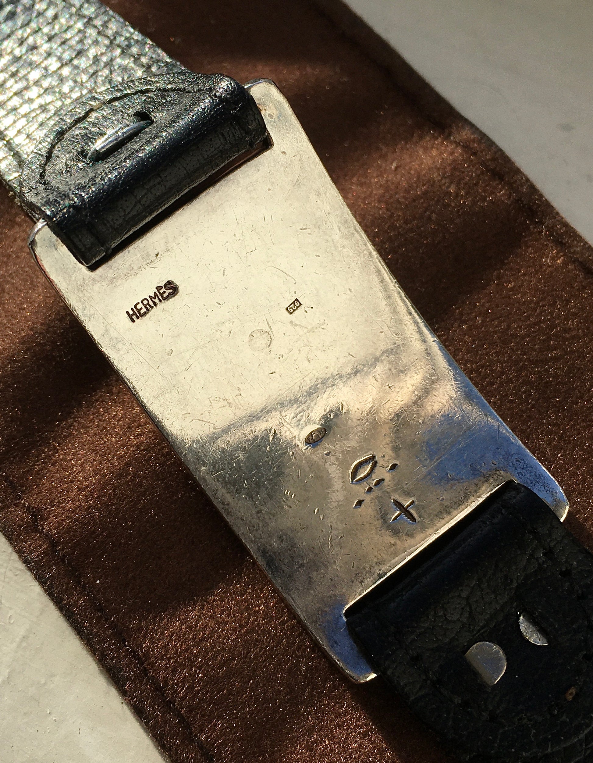 Made in France and then sent to North Africa to be decorated by the Touareg tribe, the front of the silver plaque features a hand finished chased/engraved geometric design while the back is boldly stamped Hermès. Alongside a variety of other stamps can be seen a fineness marking of ‘925’ and a maker’s mark of ‘EH’ for Émile-Maurice Hermès’